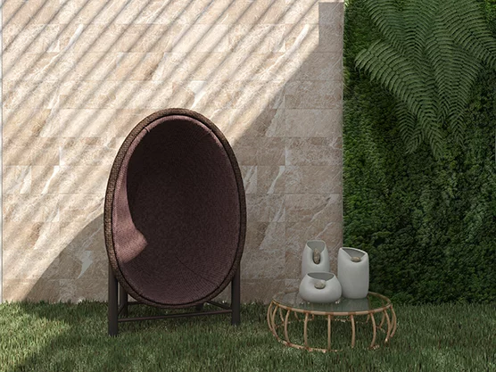 Suprafața mată în nuanțe de maro cald, traversată de vene albe subtile, creează un efect autentic de piatră, integrându-se armonios atât în spațiile interioare, cât și în cele exterioare.