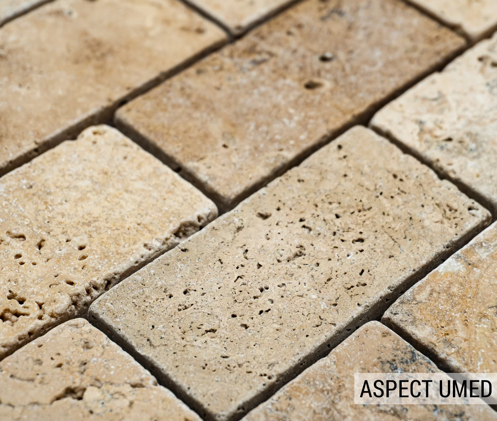 MOZAIC PE PLASA DIN TRAVERTIN ANTICHIZAT, DIMENSIUNE BUCATI DE 4.8X10 CM, GROSIME 1 CM 10 BUC PE CUTIE