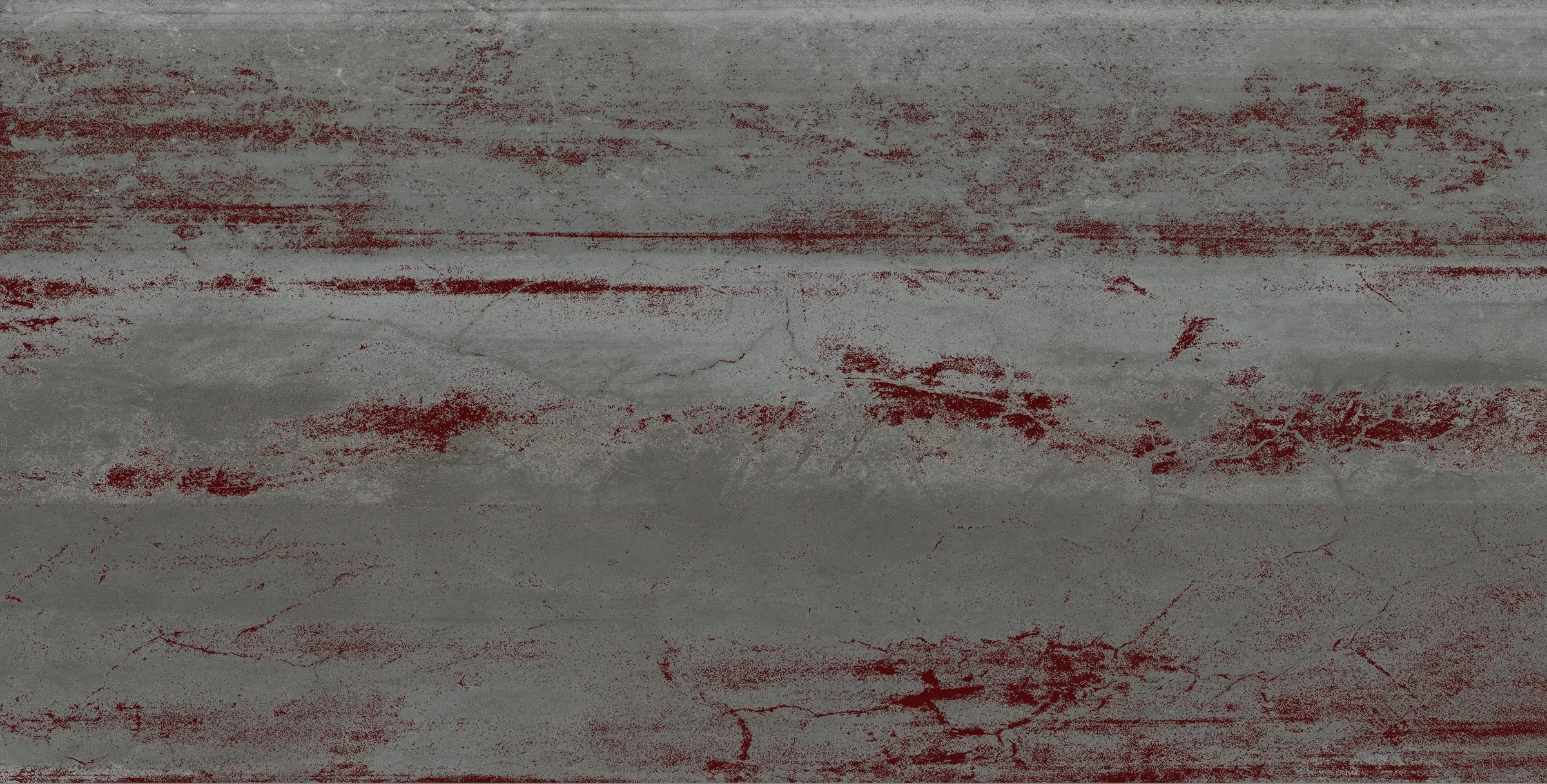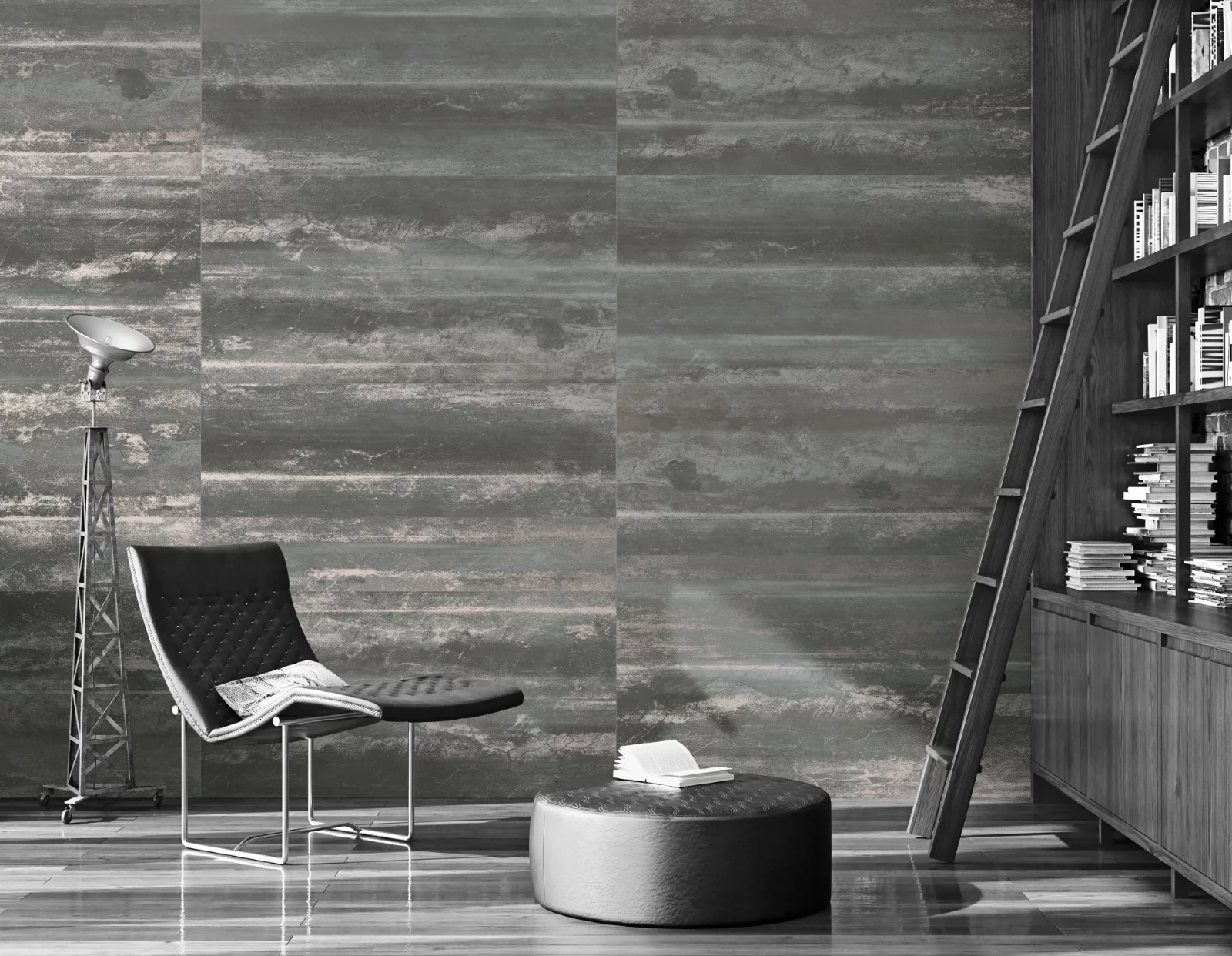 Nuanțele de gri neutru sunt puse în valoare de accente ruginii și reflexii metalice discrete, creând o suprafață cu impact vizual puternic și autentic.