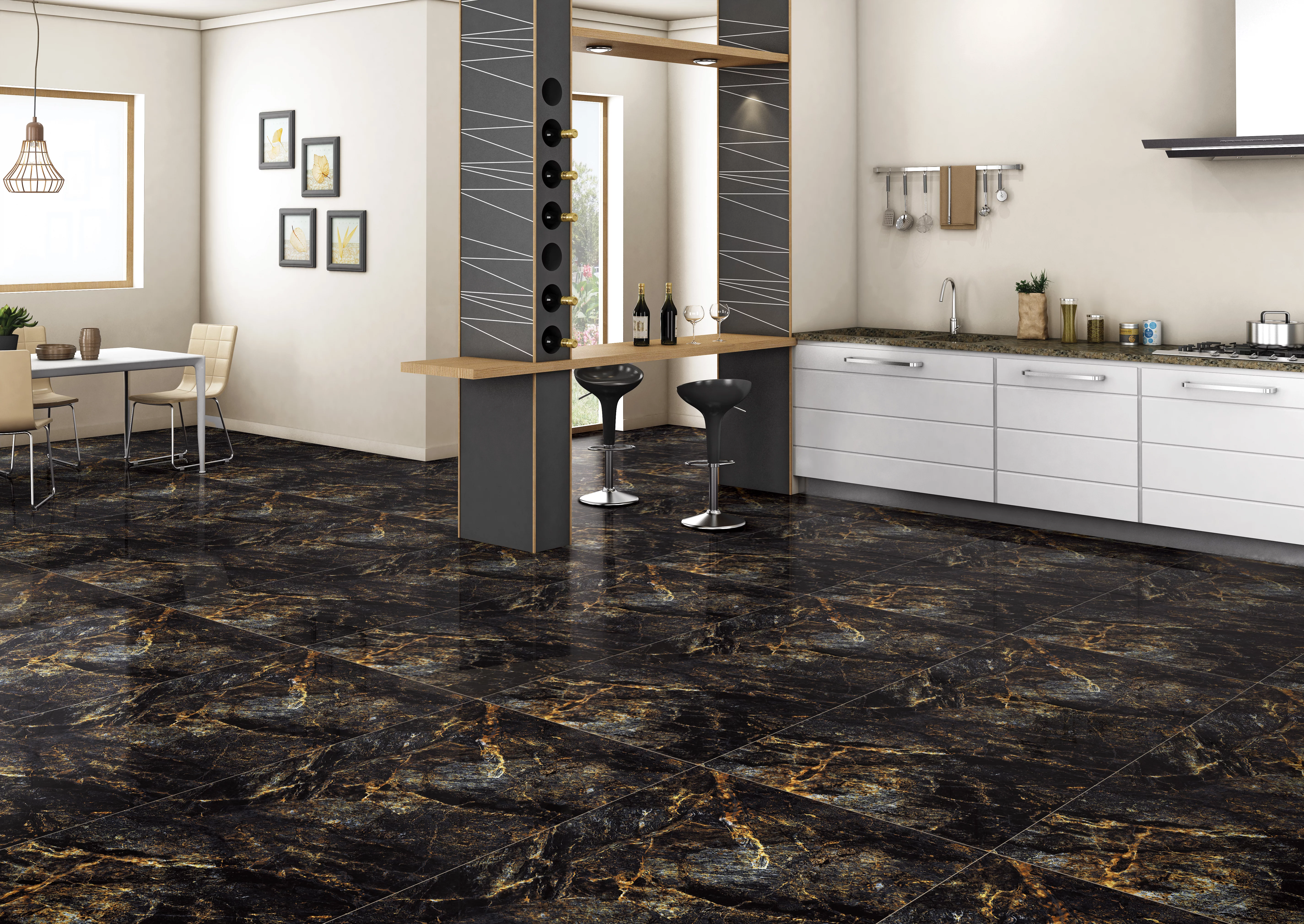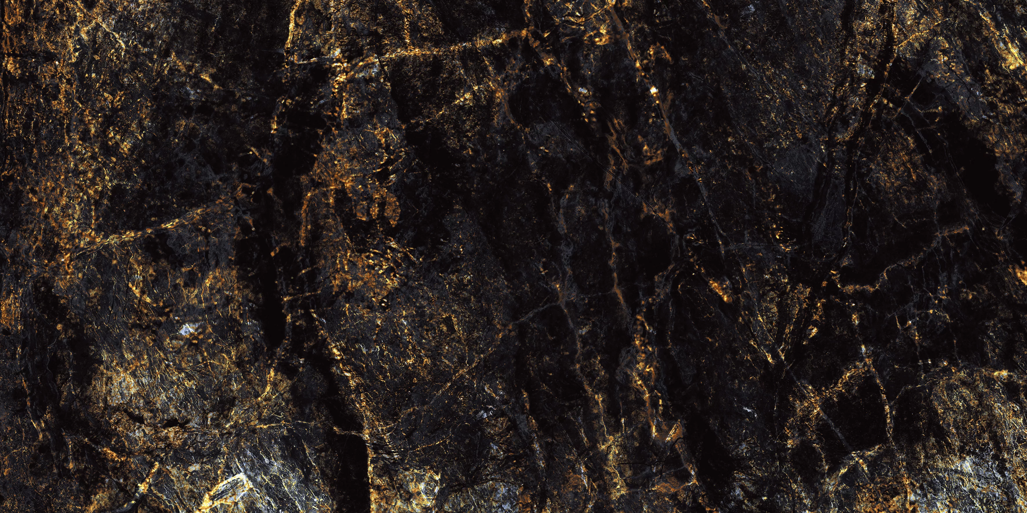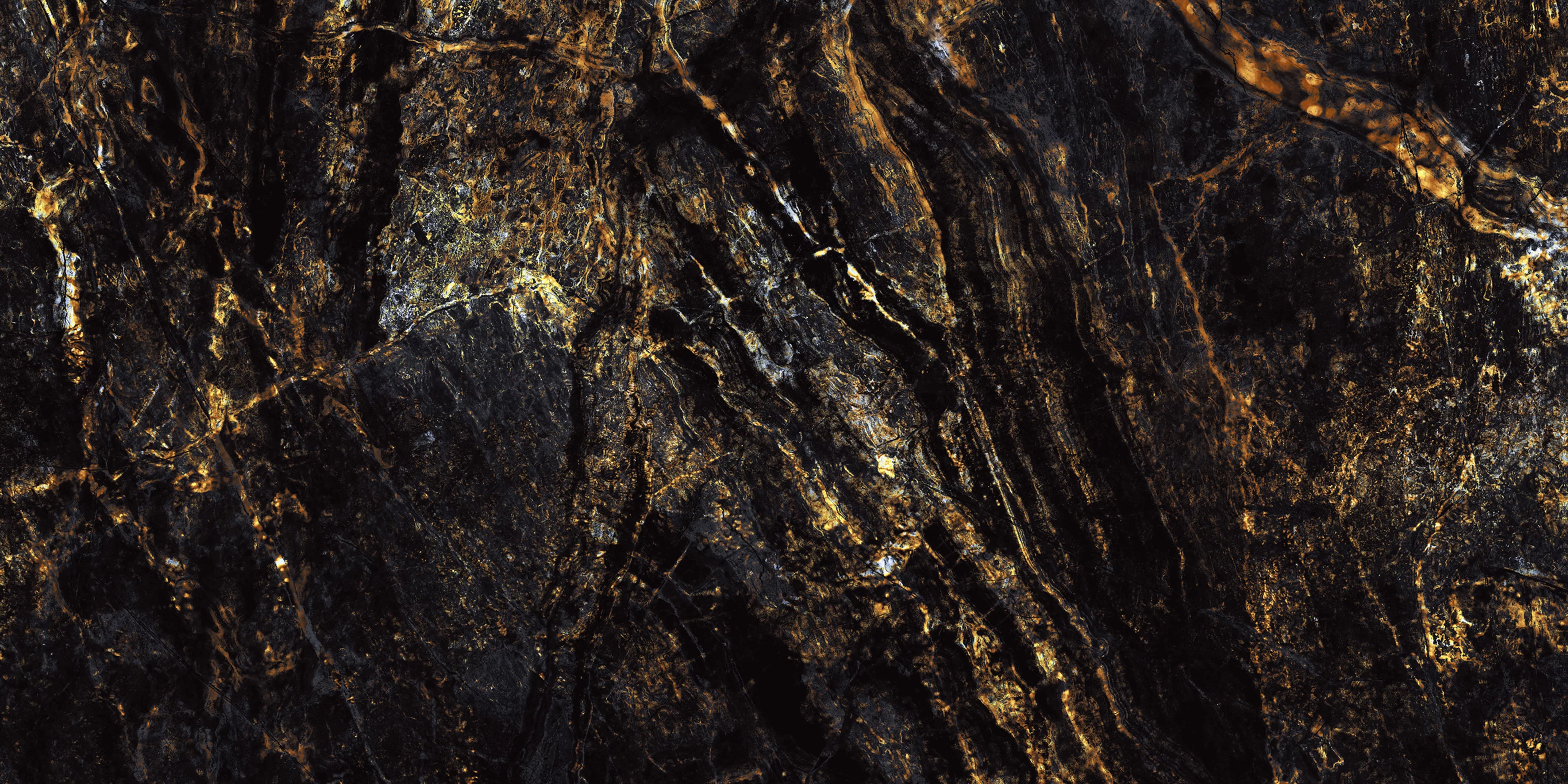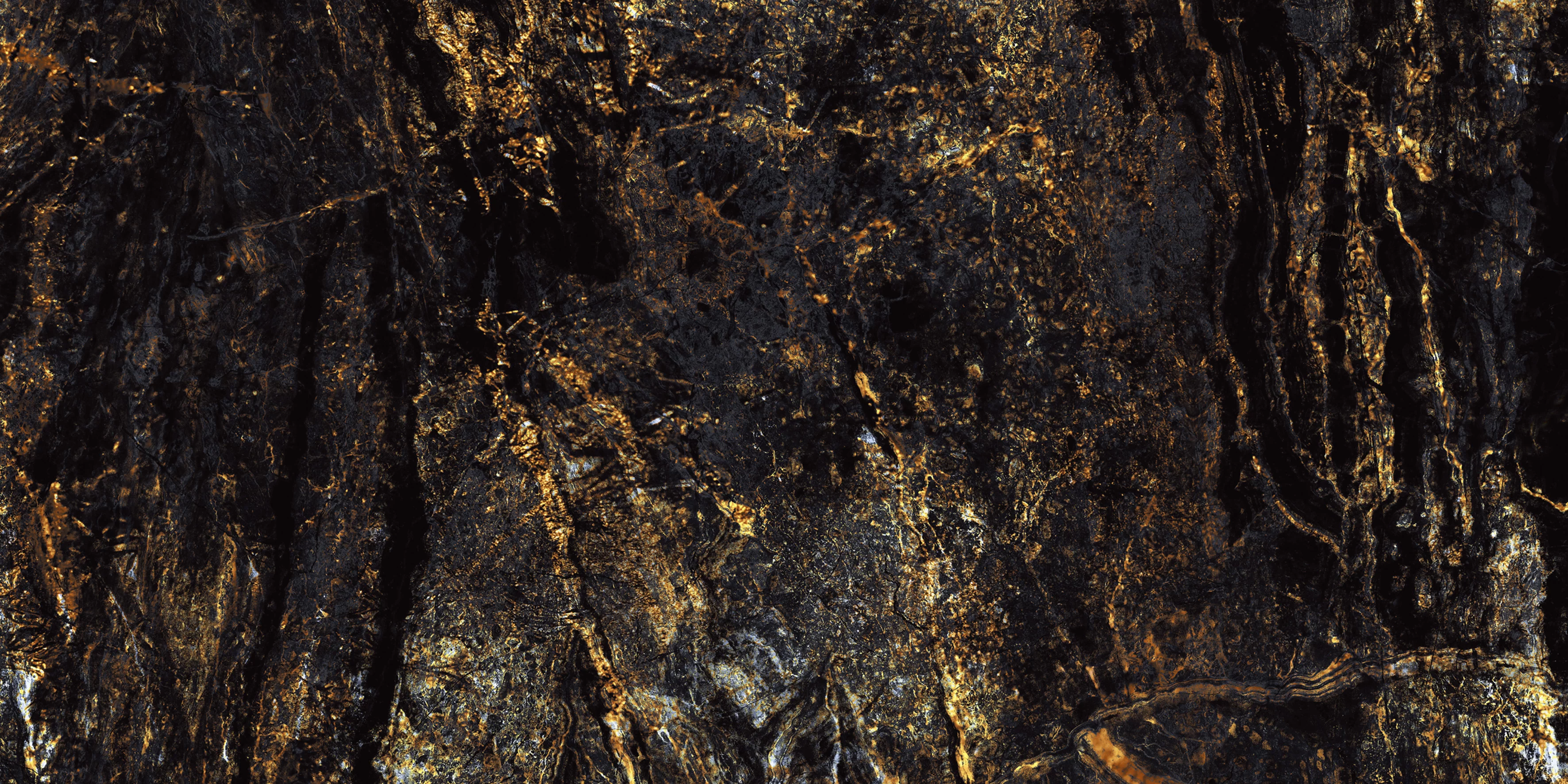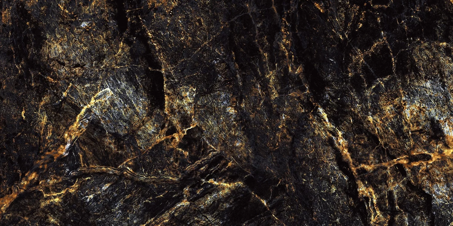 Designul spectaculos, cu un fond negru intens traversat de nervuri aurii și accente maronii, imită perfect pietrele naturale rare.