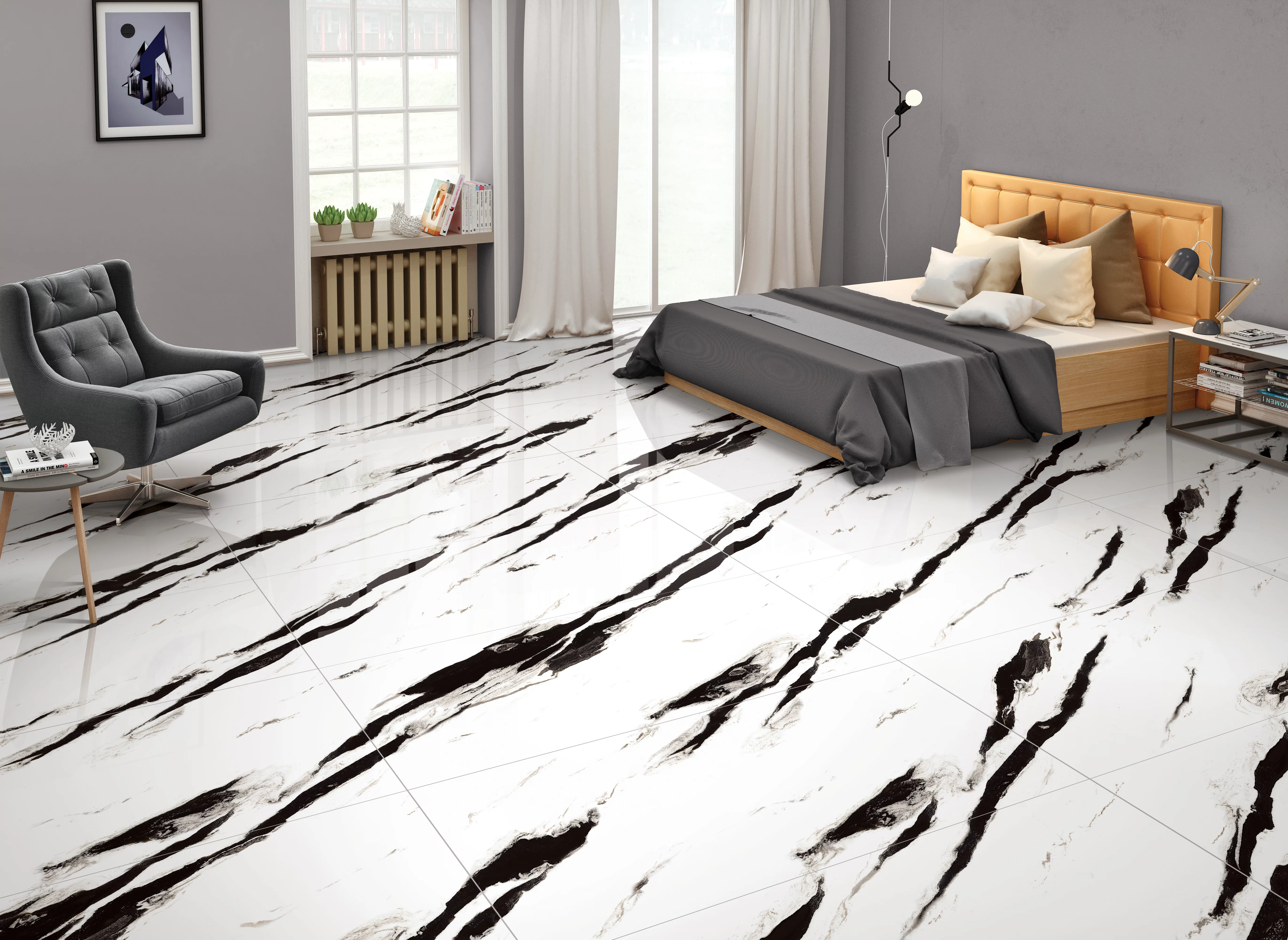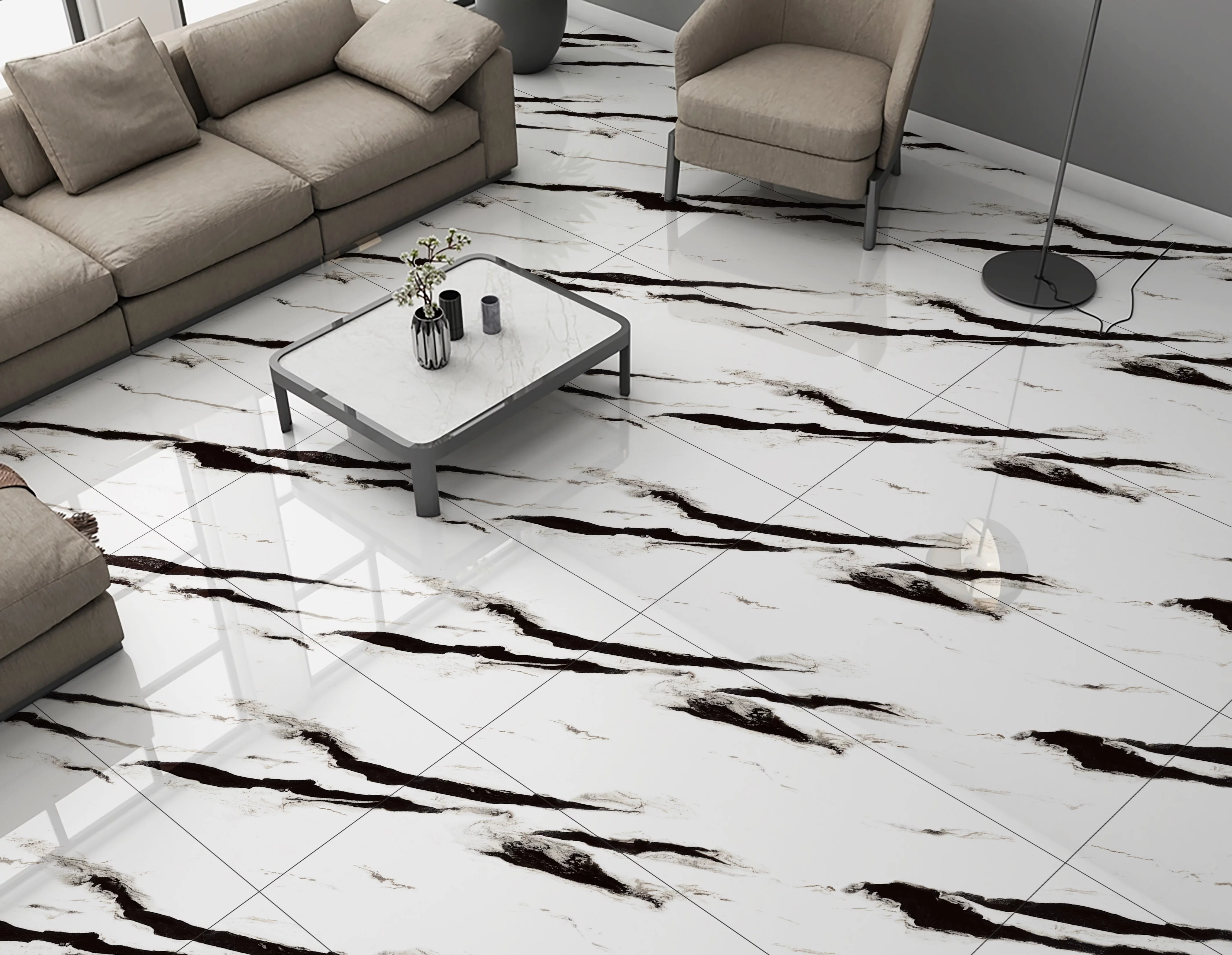 GRESIE WHITE PANDA HG ENDLESS - 60X120 cm, porțelanată, albă cu nervuri negre contrastante, aspect luxos de marmură Panda, finisaj super lucios high glossy, ideală pentru interioare sofisticate.