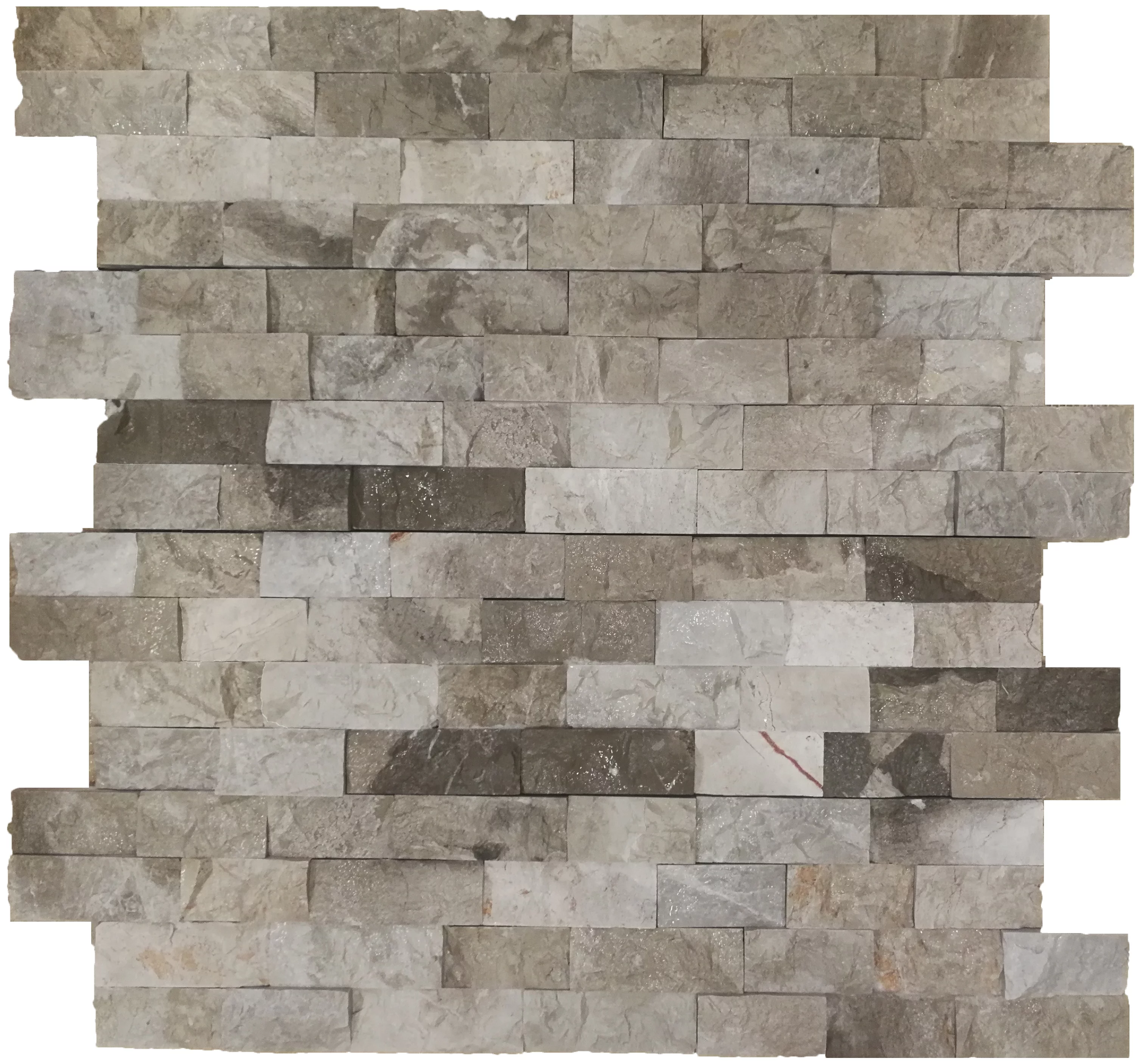PANEL MARMURA NOVO GREY - 15.2X61 cm, grosime variabila 1.5-1.8 cm, plăci naturale cu finisaj splitface, montate pe plasă, ideale pentru decorarea pereților interiori și exteriori, în tonuri elegante de gri.