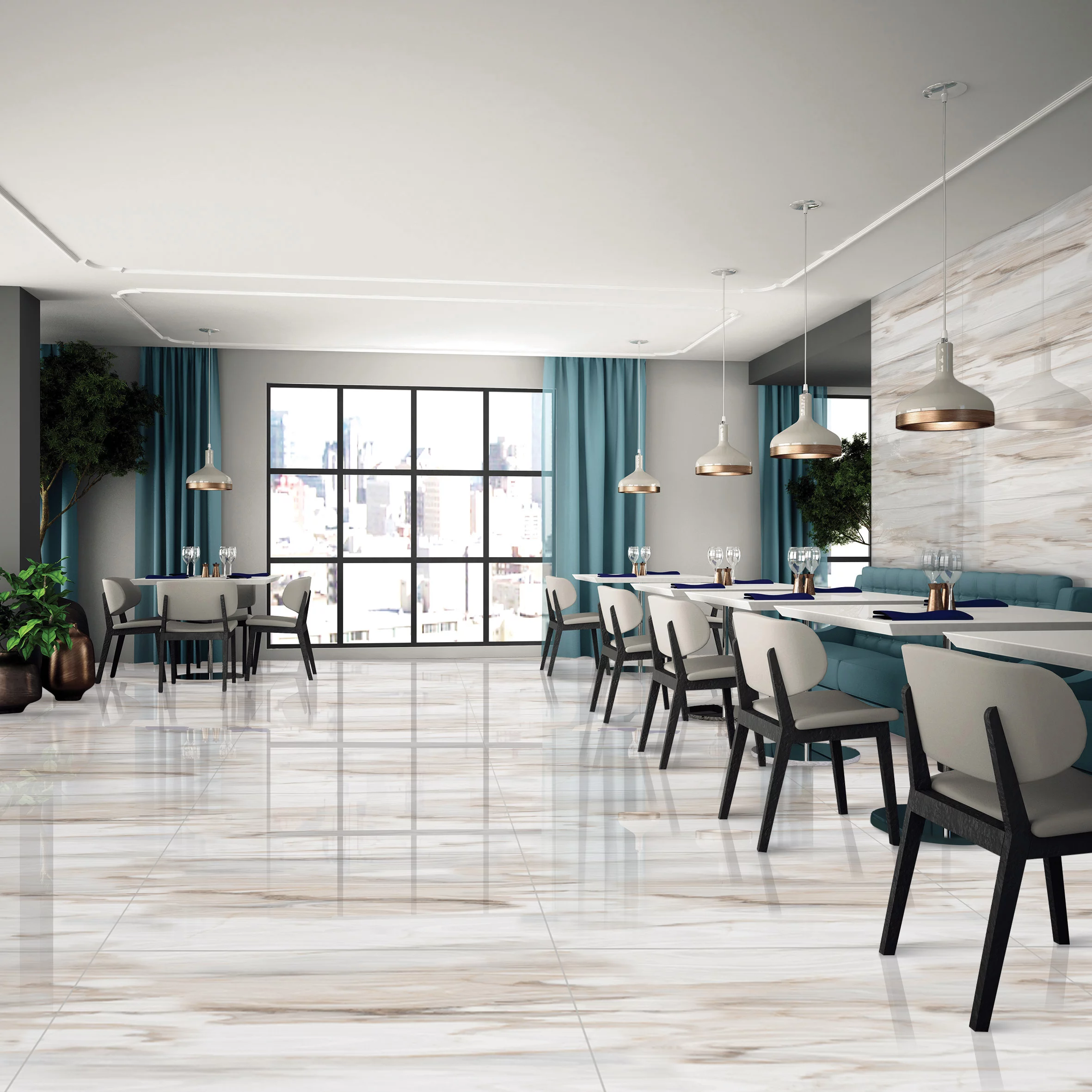 Plăcile mari, rectificate, permit un montaj precis cu rosturi minime, accentuând continuitatea vizuală.