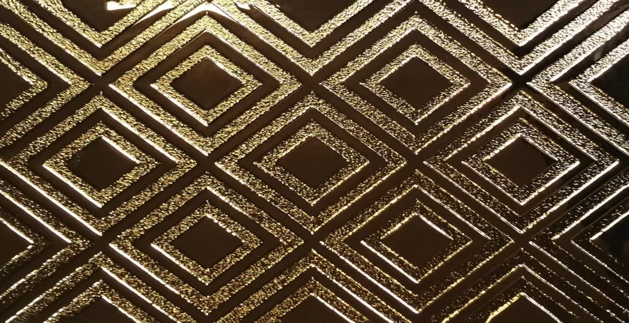 PLACA DECOR FAIANTA FC-36JMHG1760 oferă un impact vizual puternic datorită modelului geometric compus din romburi aurii reliefate pe un fundal lucios închis, cu efect de oglindă.