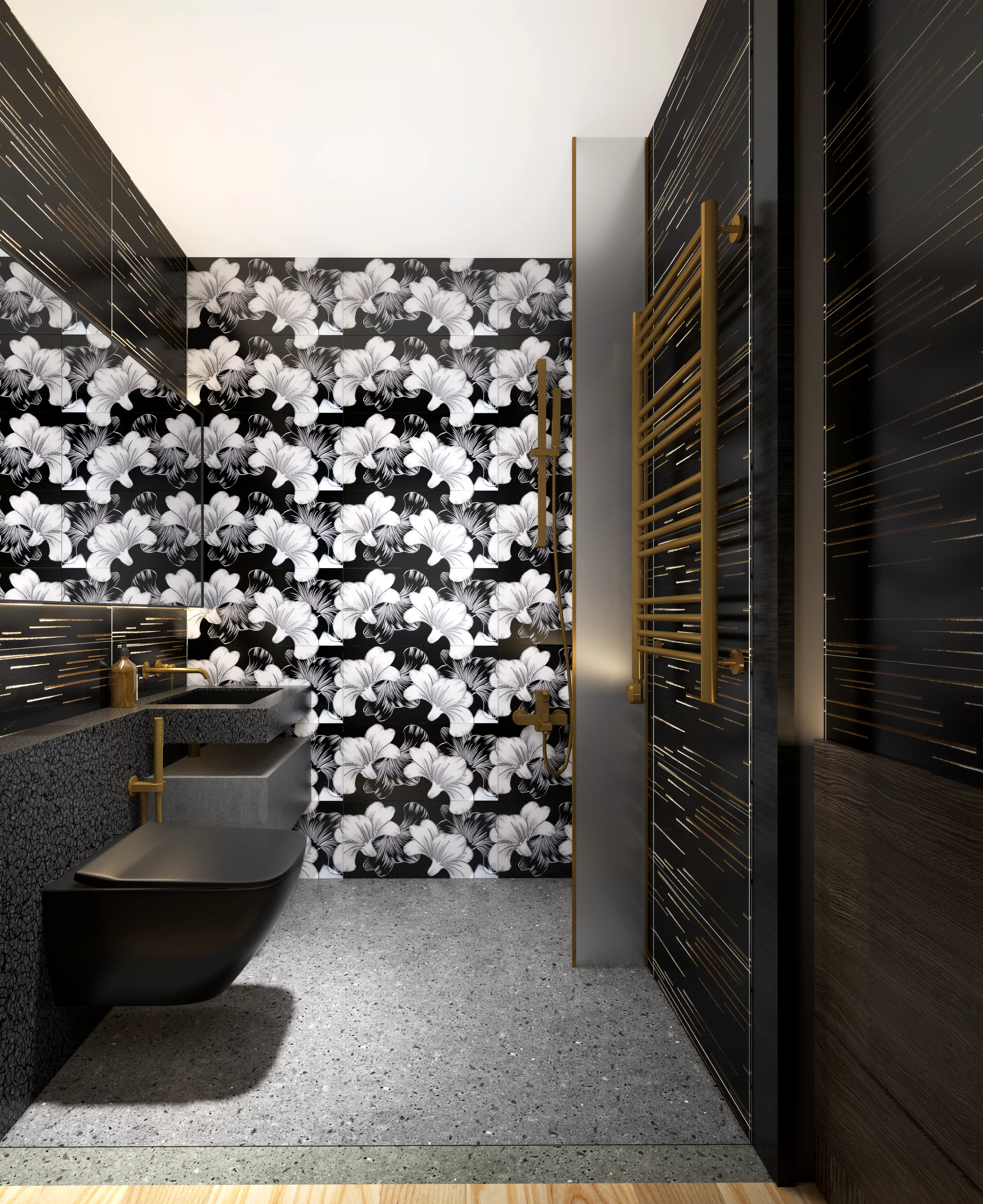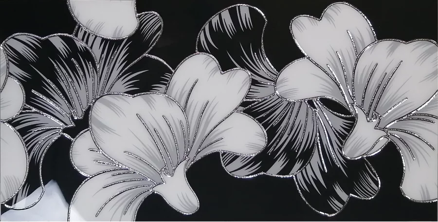 PLACA DECOR FAIANTA FC-36BG630-3 - 30X60 cm, portelanata, glazurata, rectificata, design floral alb-negru pe fundal lucios și inserții argintii, un contrast elegant pentru interioare moderne.