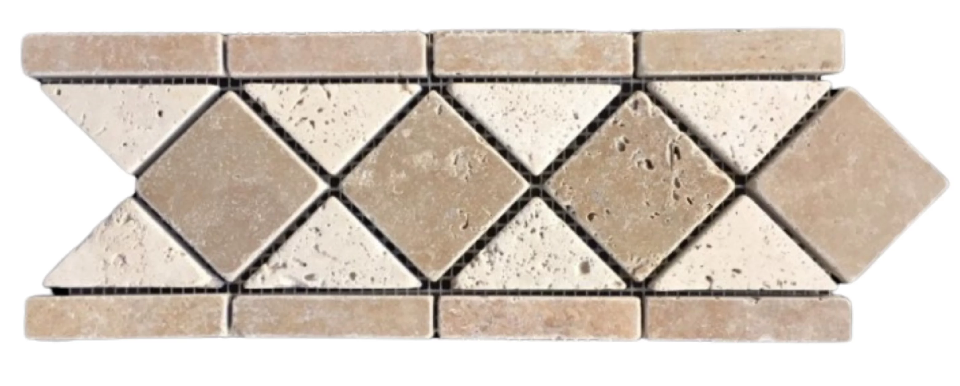 BORDER DIN TRAVERTIN PE PLASA - 10.5X28.5 cm, design geometric în nuanțe naturale de crem, bej, maro deschis și ivoire, ideal pentru finisaje interioare clasice elegante, rustice.