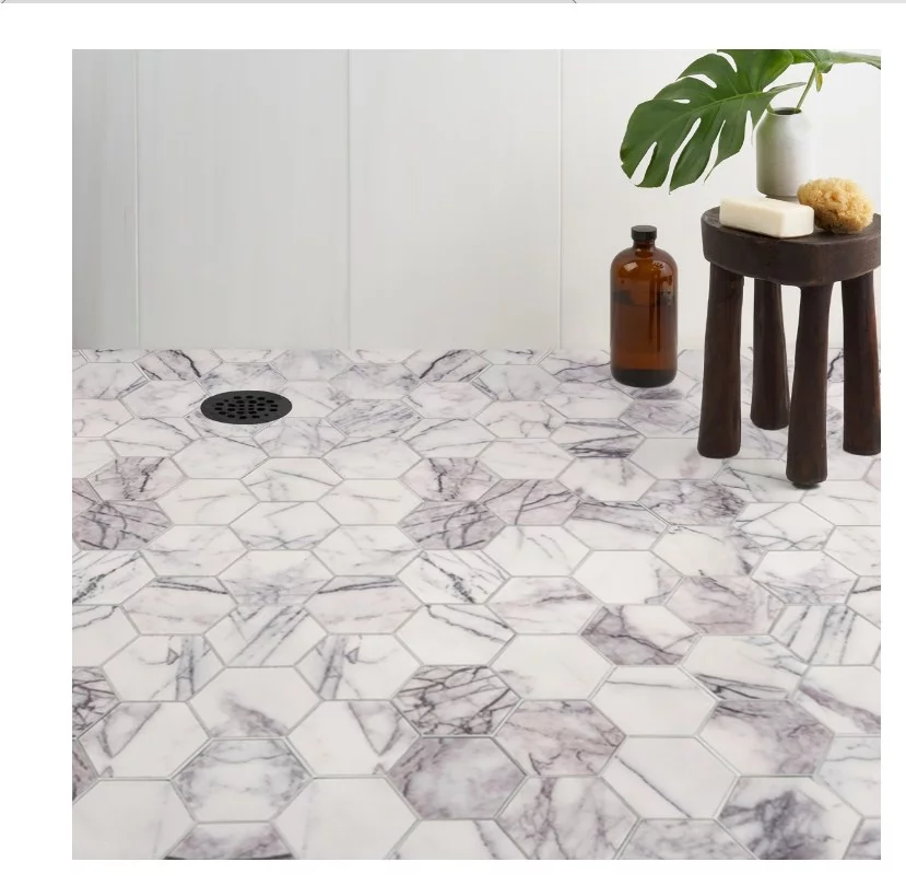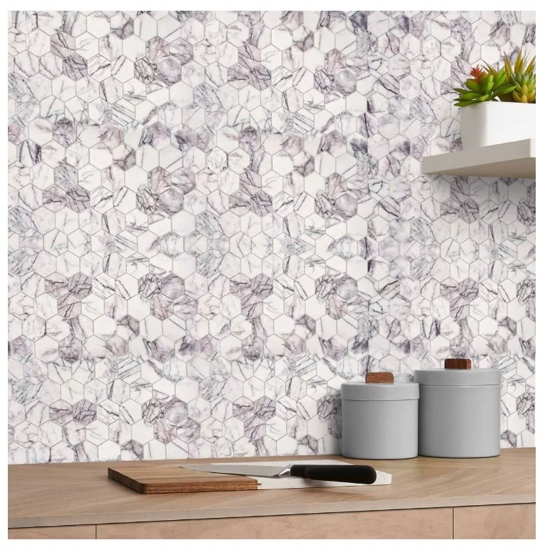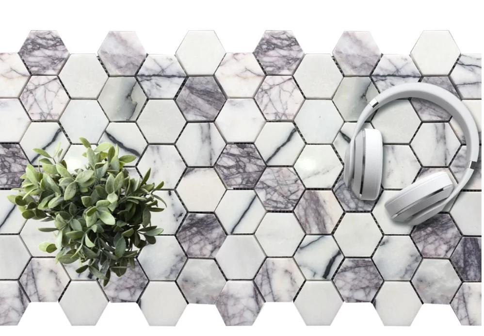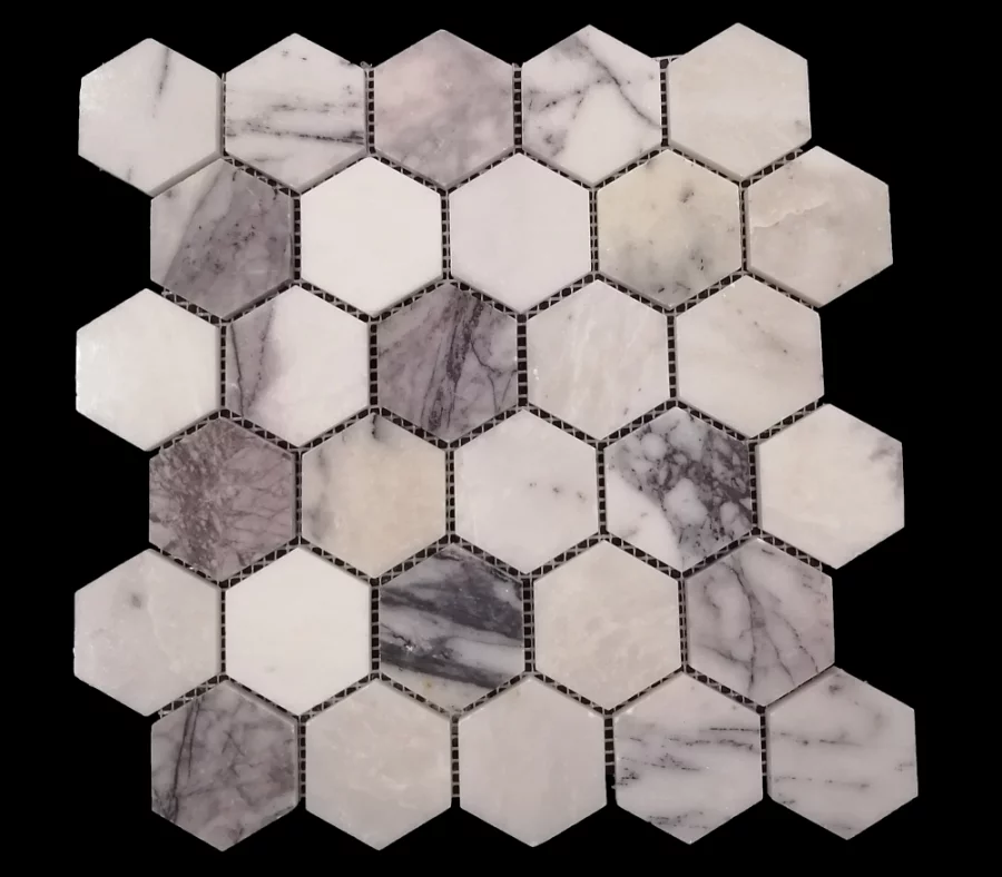 MOZAIC DIN MARMURA LILAC HEXAGON este realizat din marmură naturală cu nuanțe rafinate de alb, gri și mov-liliachiu.