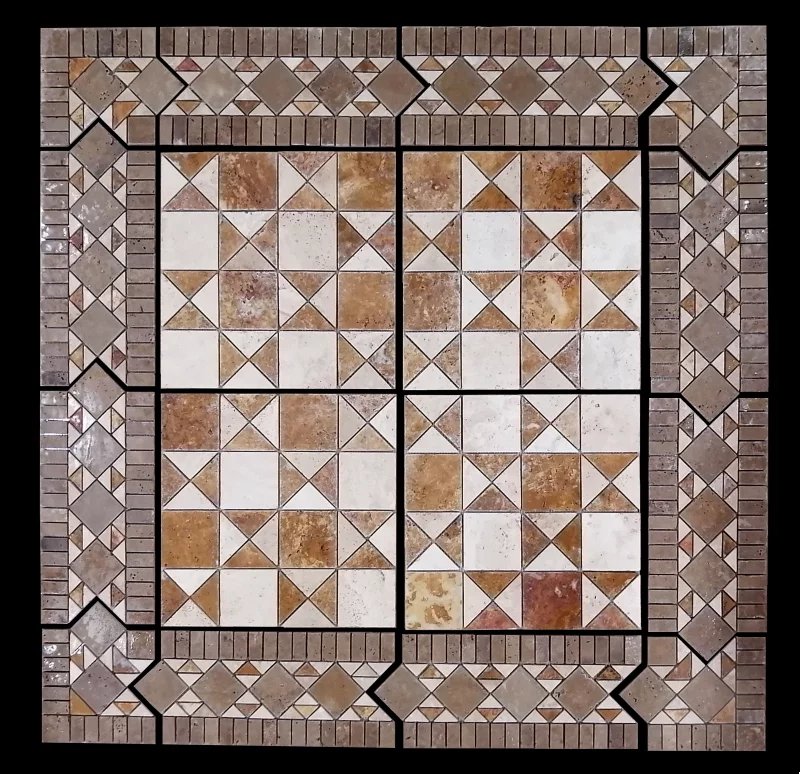 MEDALION MOZAIC DIN TRAVERTIN - 108X108 cm, grosime 1 cm, compus din 12 bucăți, finisaj tumbled, nechituit, mat, ideal pentru decorarea pardoselilor interioare cu un accent sofisticat și rustic.