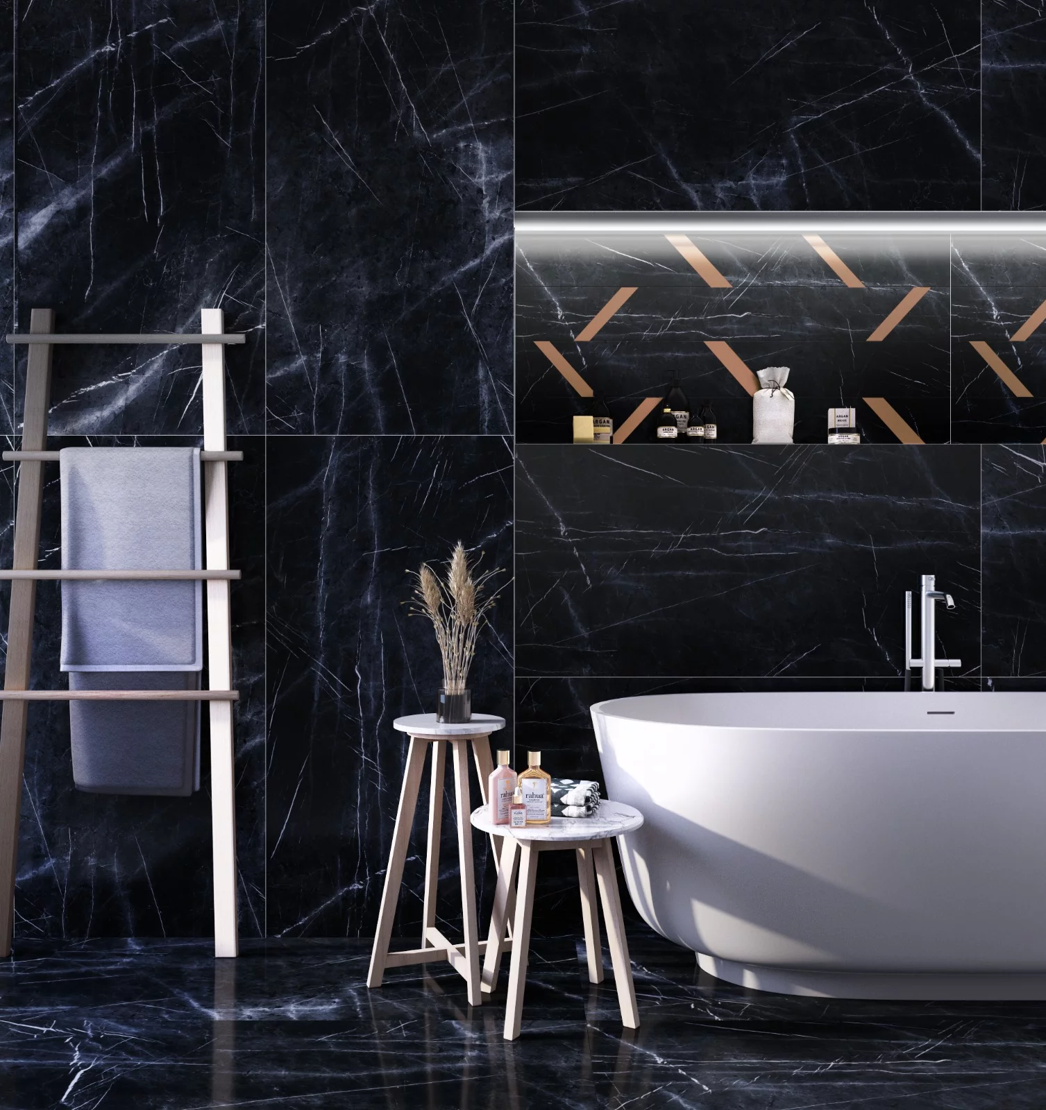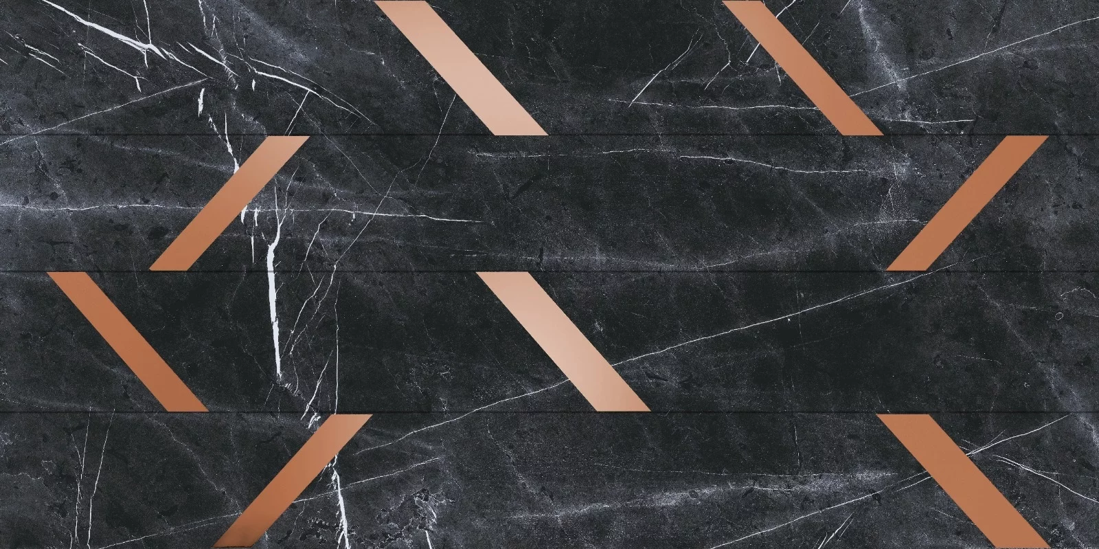 Gresia GAIA BLACK DECOR este o gresie porțelanată decorativă, cu un fundal negru intens, străbătut de vinișoare albe fine și înnobilată cu inserții geometrice aramii ce conferă un efect sofisticat și exclusivist.