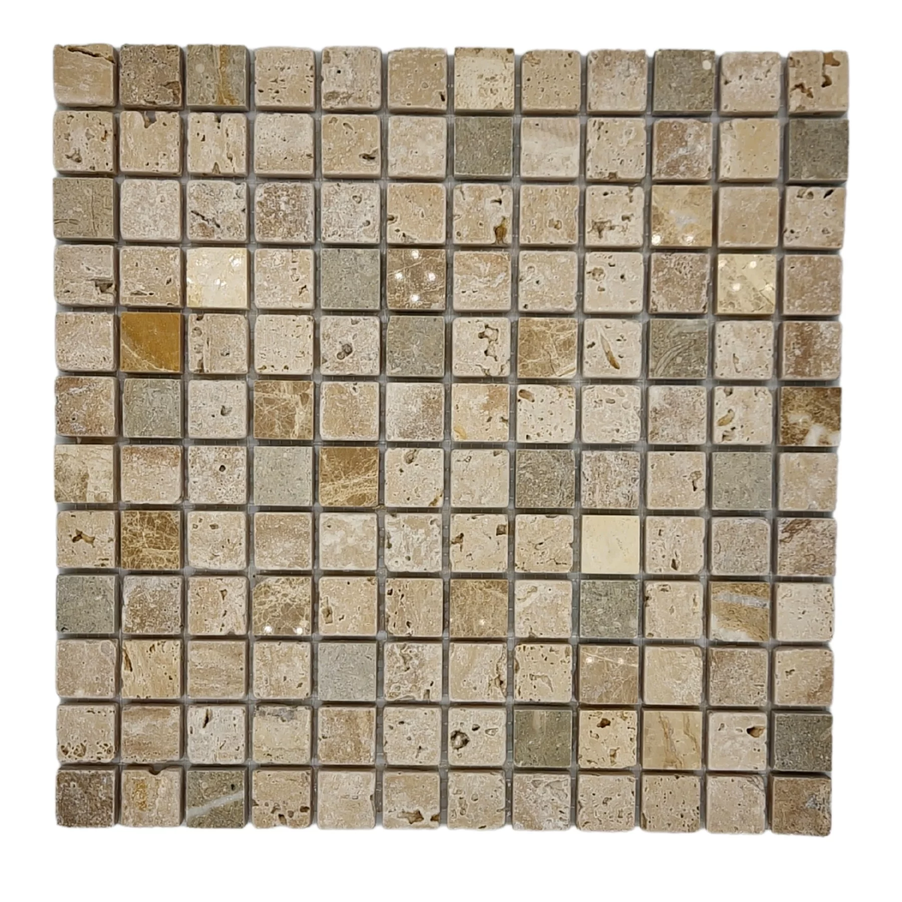 MOZAIC DIN PIATRA NATURALA ANTICHIZAT - 30.5X30.5 cm, pe plasă, realizat din mix elegant de marmură Green periata, marmură Emperador lucioasă și travertin light antichizat nechituit, grosime 1 cm.