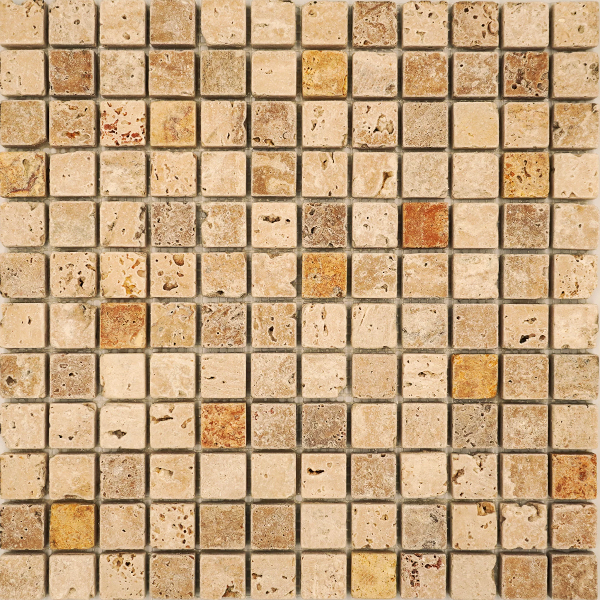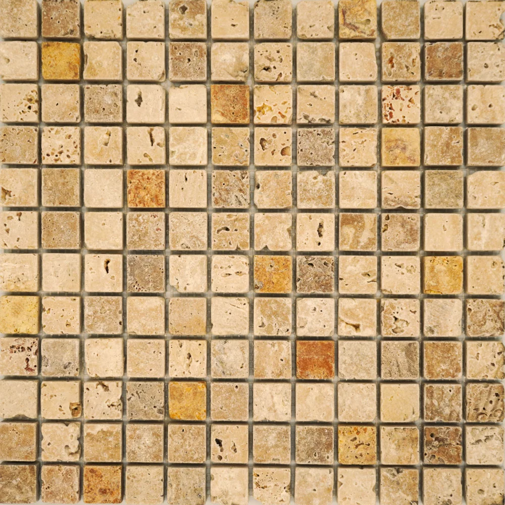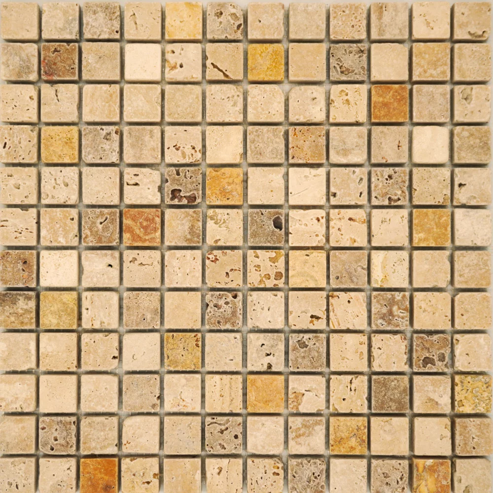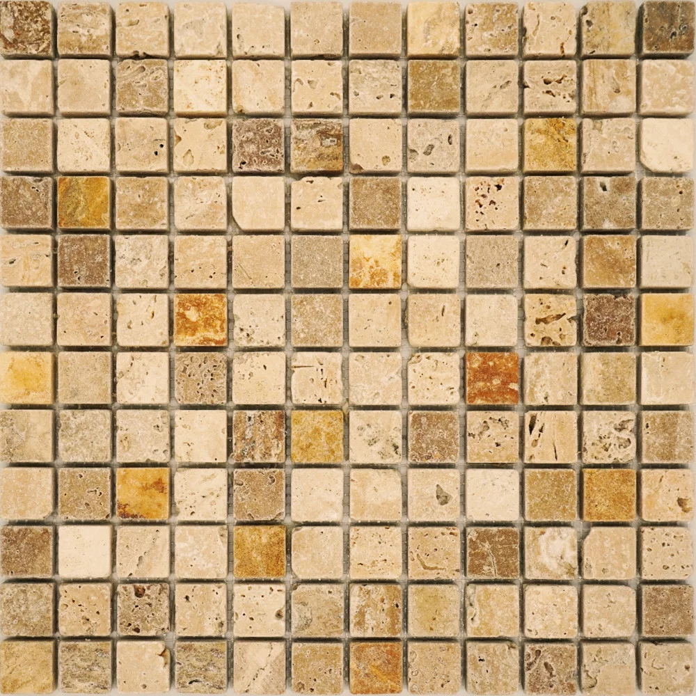 MOZAIC DIN TRAVERTIN ANTICHIZAT - 30.5X30.cm, pe plasă, realizat din mix de nuanțe light–noche–yellow, cu suprafață nechituită și textură naturală. Dimensiune chip 2.3x2.3 cm, grosime 1 cm.