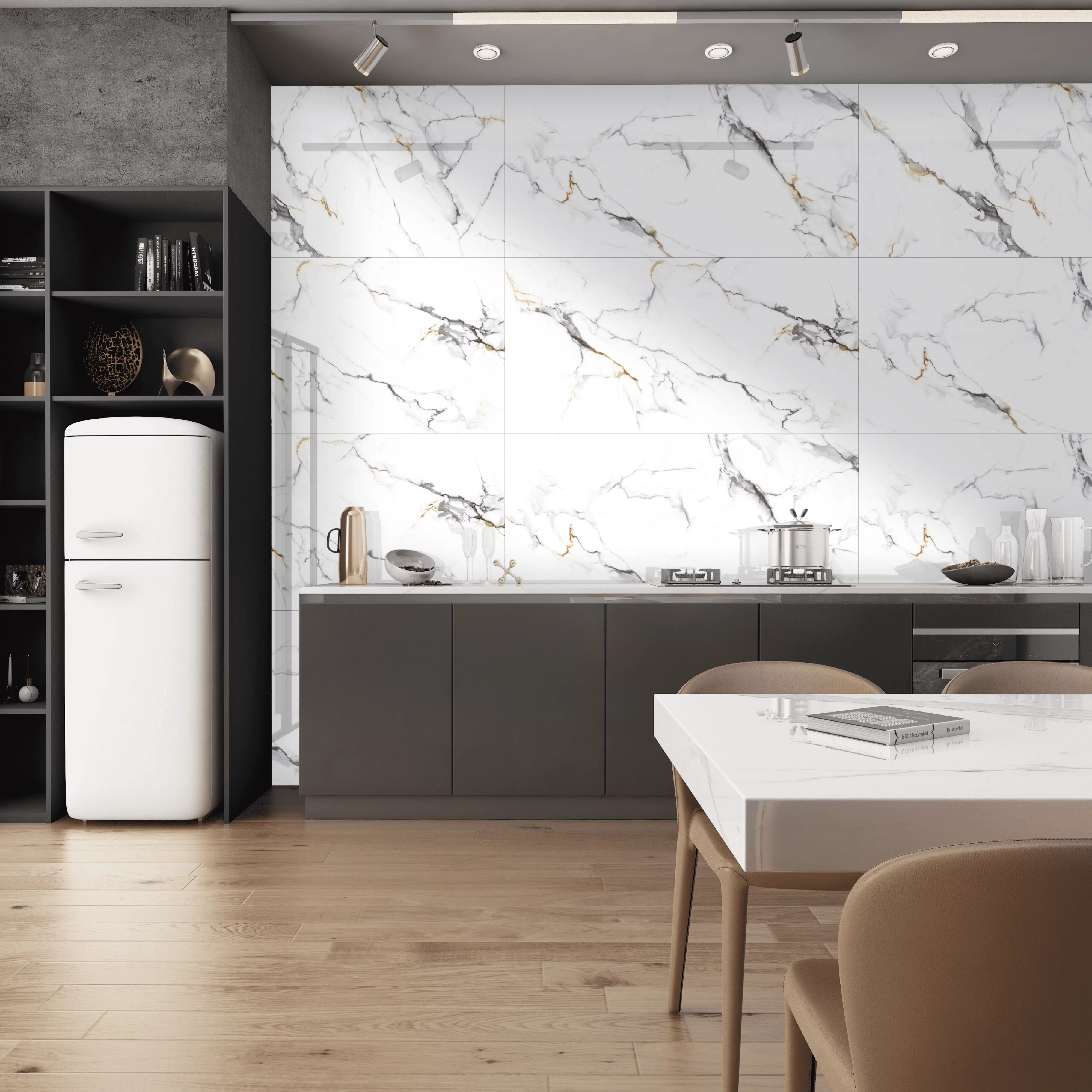 PORTELANATA, GLAZURATA, RECTIFICATA, INTERIOR/EXTERIOR, LUCIOASA CU EFECT GOLD CARVING , ALB RANDOM 3, RAA 0.03% , PEI III, RECOMANDATA PENTRU PLACARE PARDOSEALA / PERETI SI COMPATIBILA CU SISTEME DE INCALZIRE IN PARDOSEALA