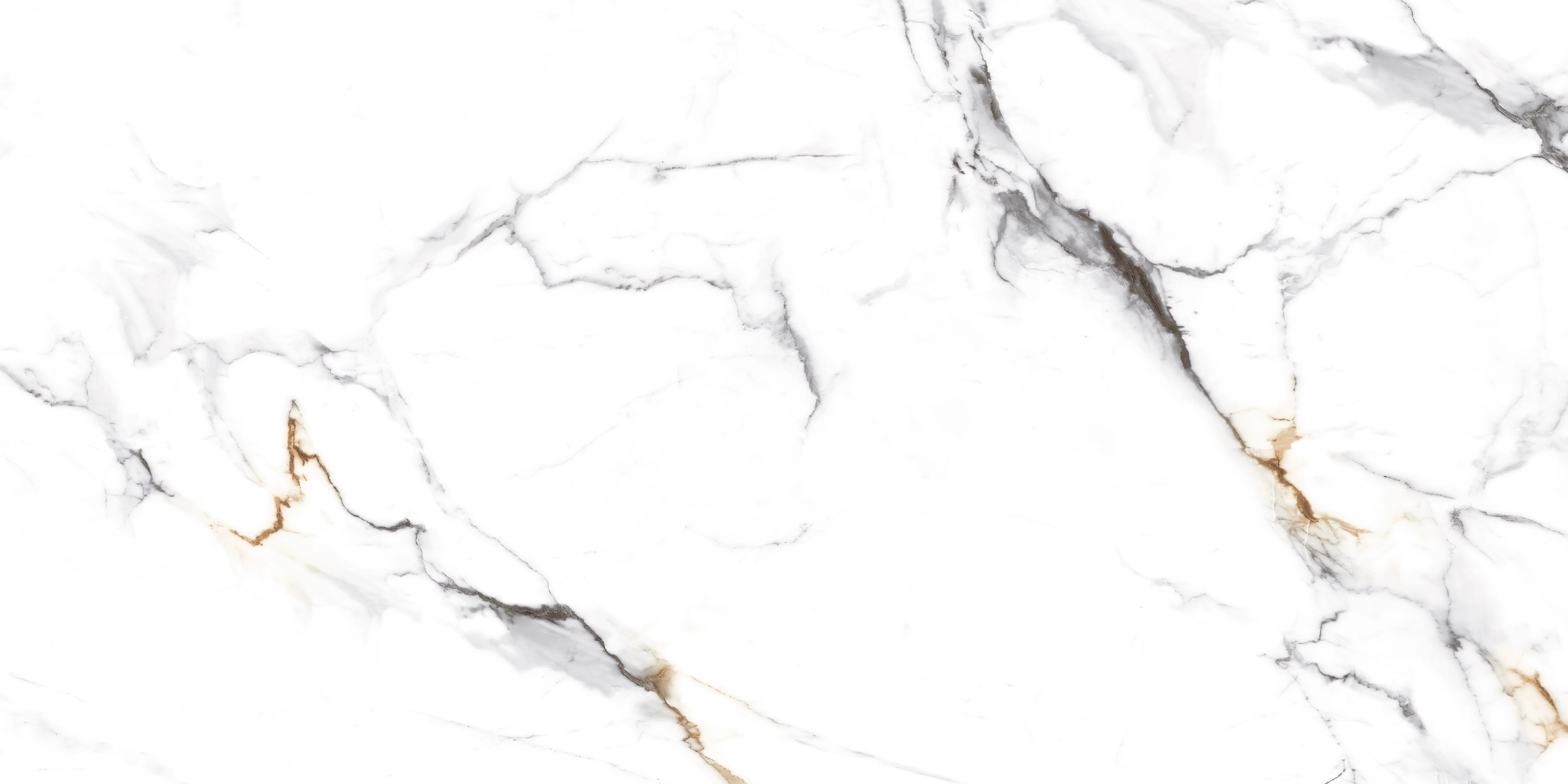 GOLDEN GS SATVARIO FROXEN este o gresie porțelanată cu un design luxuriant inspirat de marmura Calacatta, având fundal alb pur și vene proeminente aurii și gri.