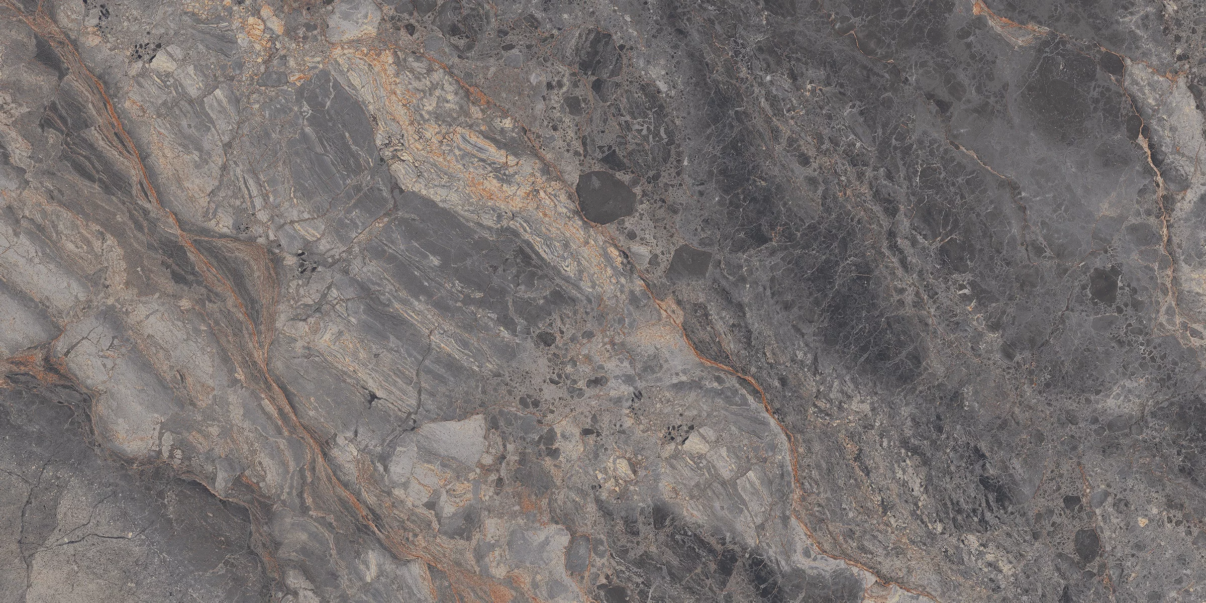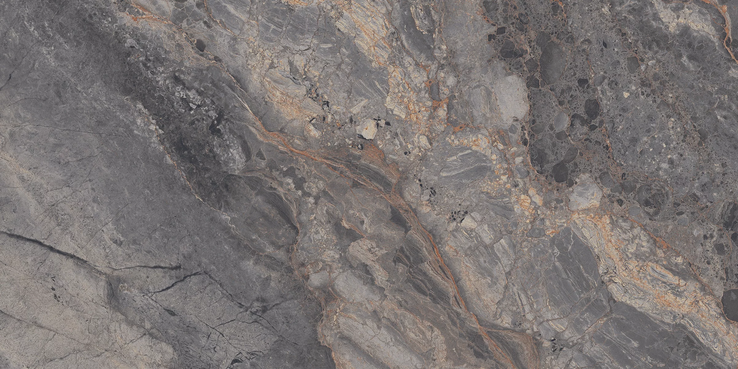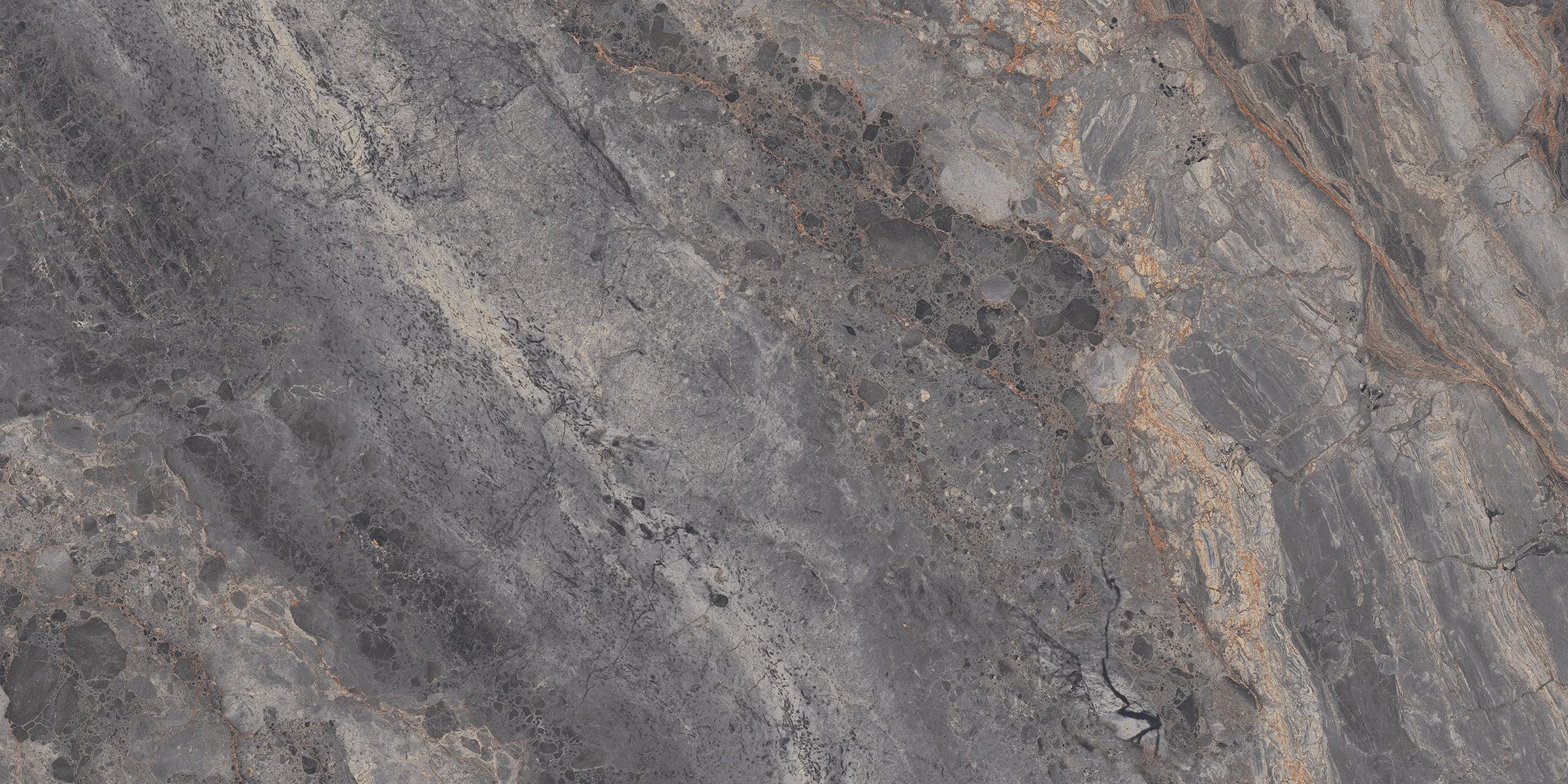 Tonurile închise de gri și negru, accentuate cu vene ruginii și detalii calde, creează un efect dramatic și rafinat, ideal pentru amenajări premium.