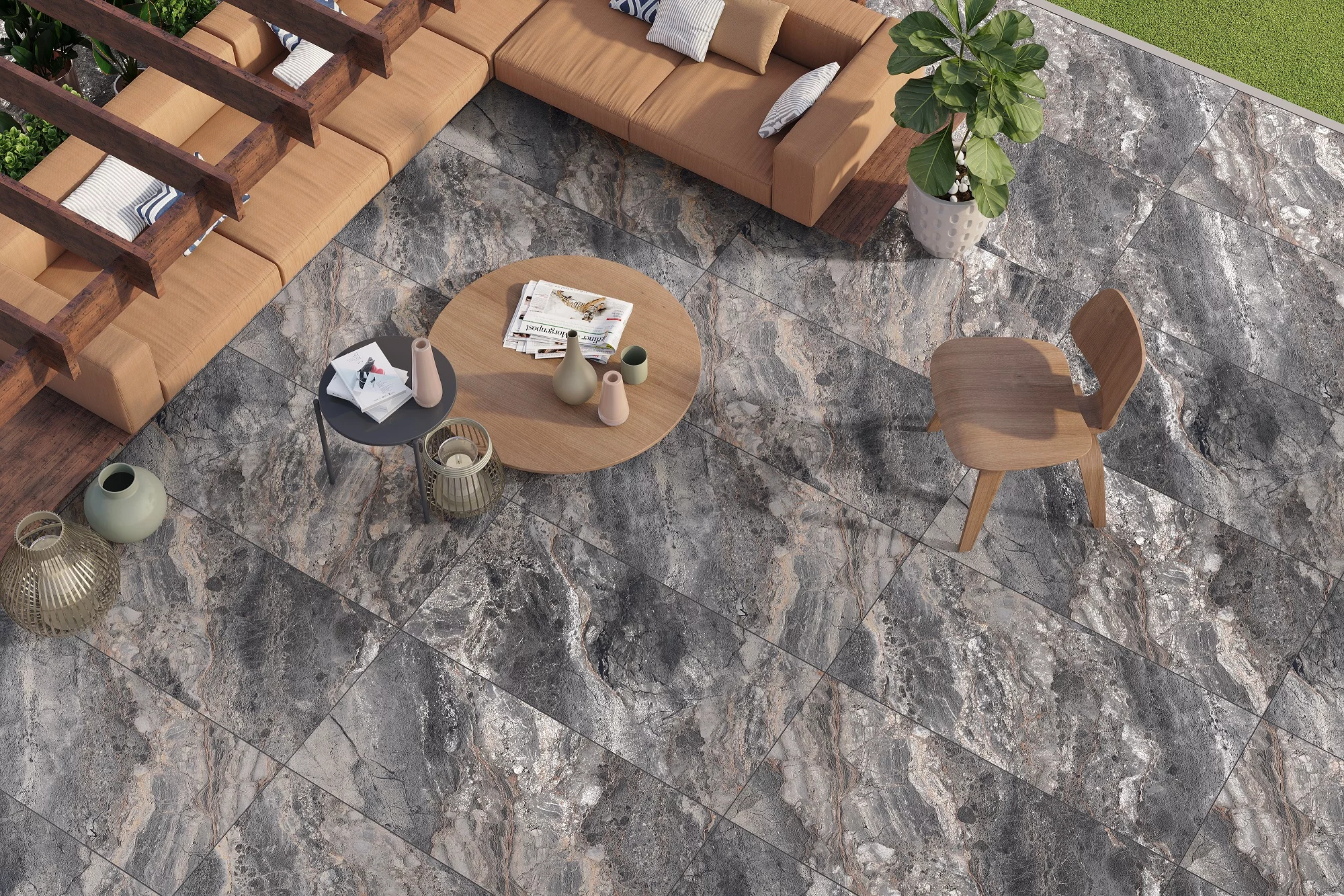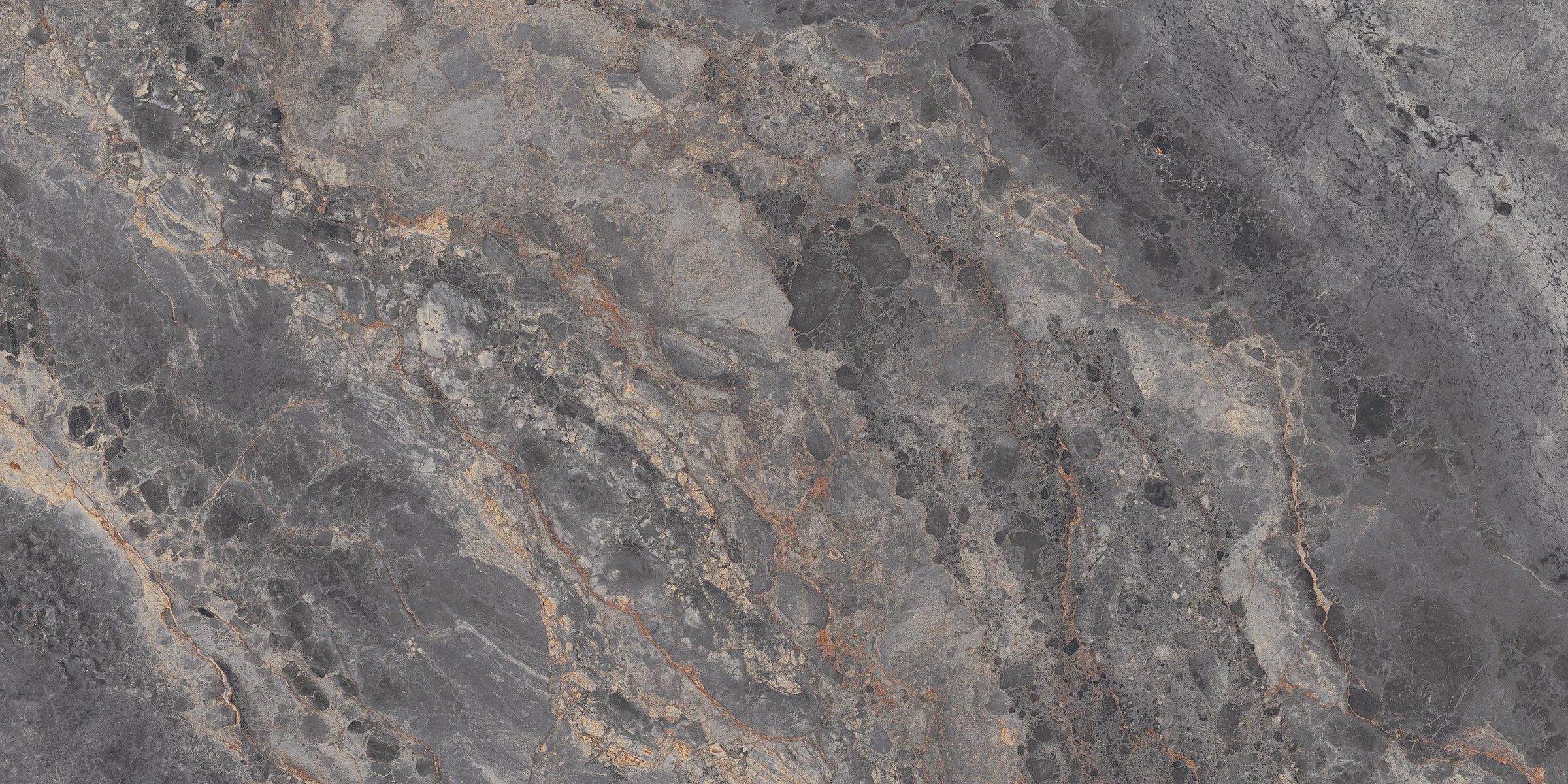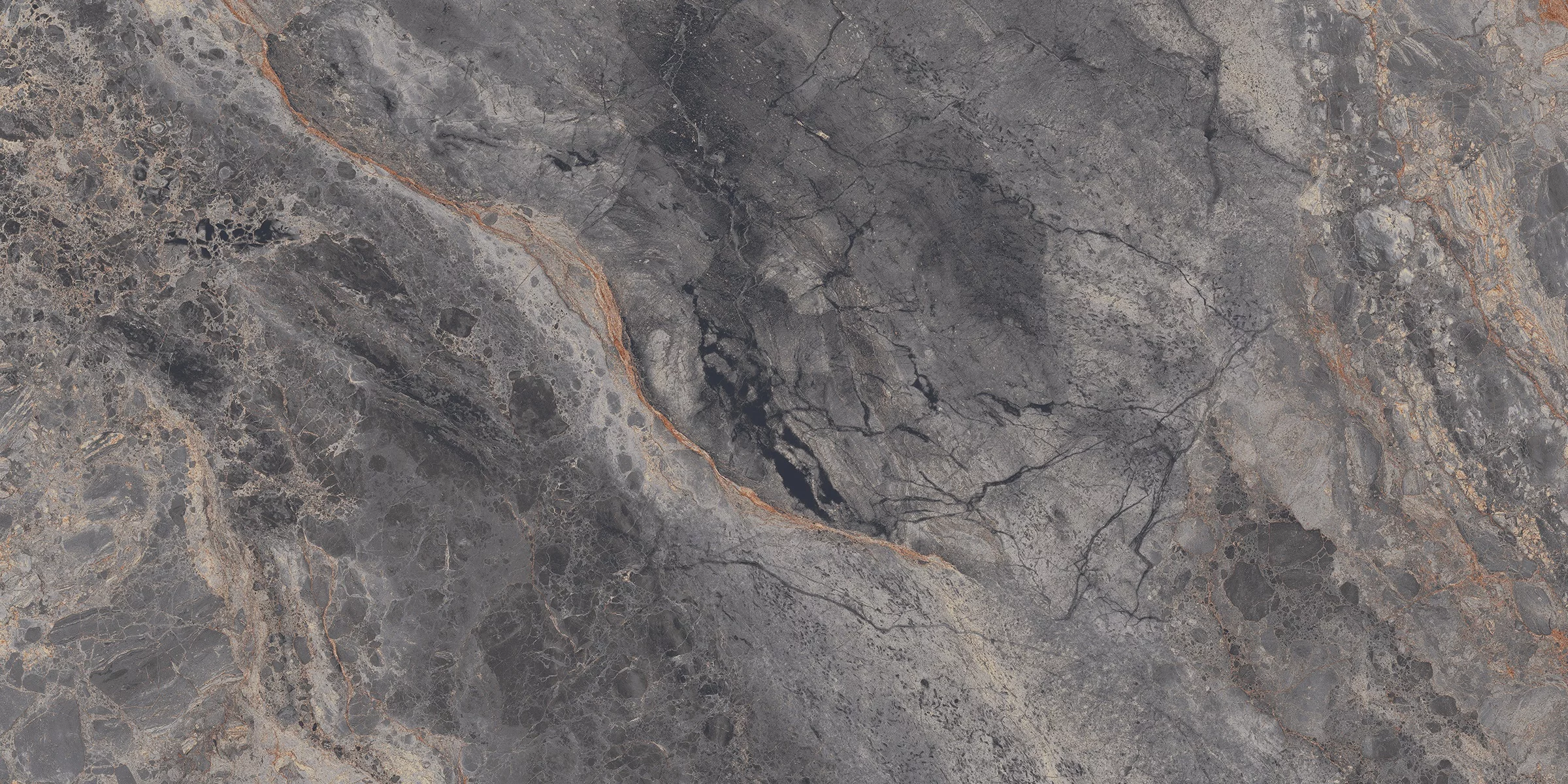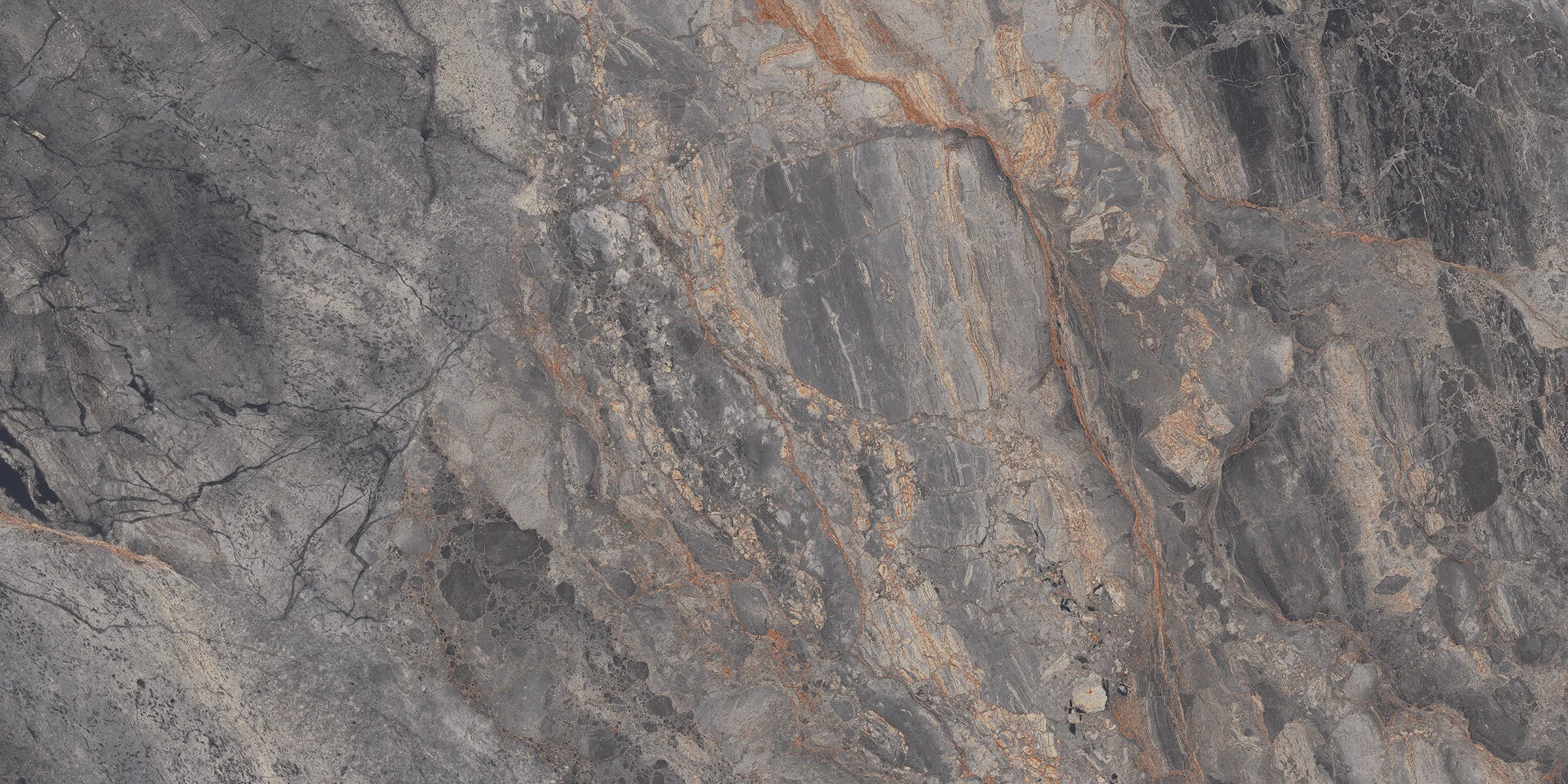 Tonurile închise de gri și negru, accentuate cu vene ruginii și detalii calde, creează un efect dramatic și rafinat, ideal pentru amenajări premium.