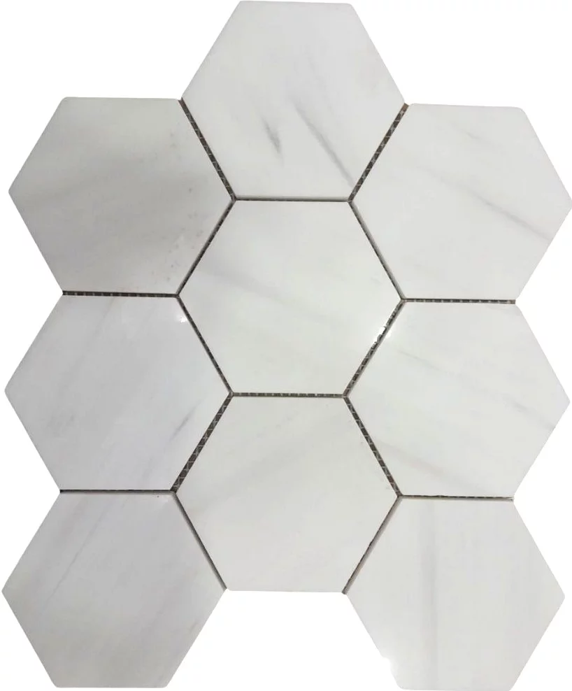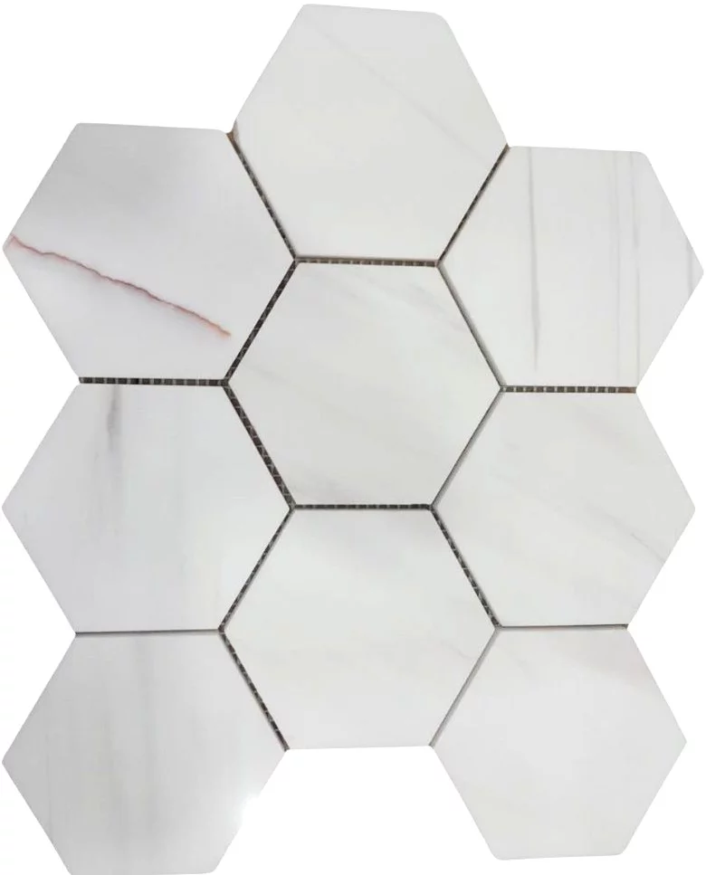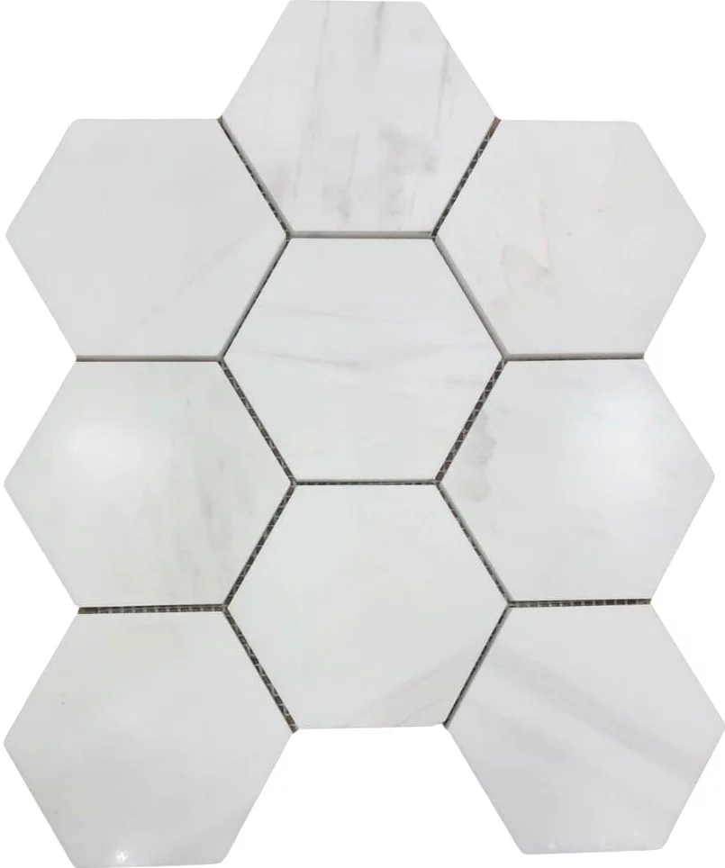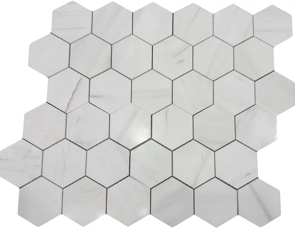 MOZAIC DIN DOLOMIT HEXAGON - 26.5X30.5 cm, mozaic elegant din piatră naturală Dolomit, șlefuit, mat, alb cu ușoare vene gri sau bej, design geometric hexagonal ideal pentru decoruri moderne.