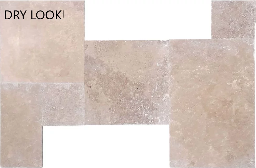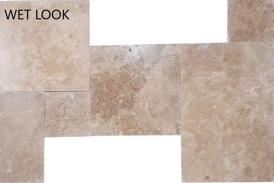 TRAVERTIN NOCHE CROSSCUT FP - 1.2 cm, set French Pattern dimensiuni diverse, în nuanțe calde de maro și bej, livrat în set modular de 6 plăci, ideal pentru pardoseli și pereți cu aspect elegant și natural.
