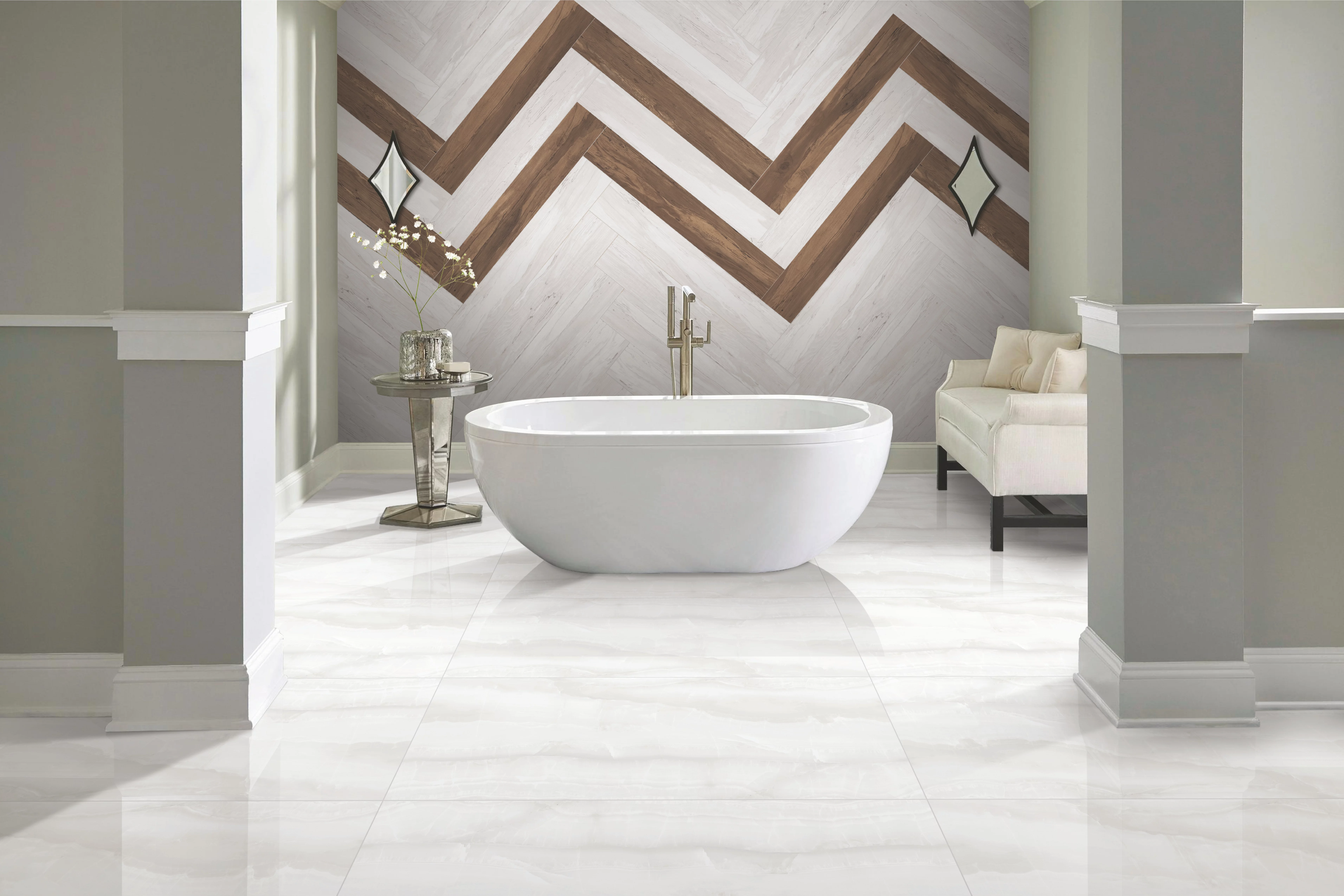 Gresia ONYX WHITE aduce în spațiu puritatea și transparența onixului natural, cu efecte vizuale spectaculoase datorate luciului intens.