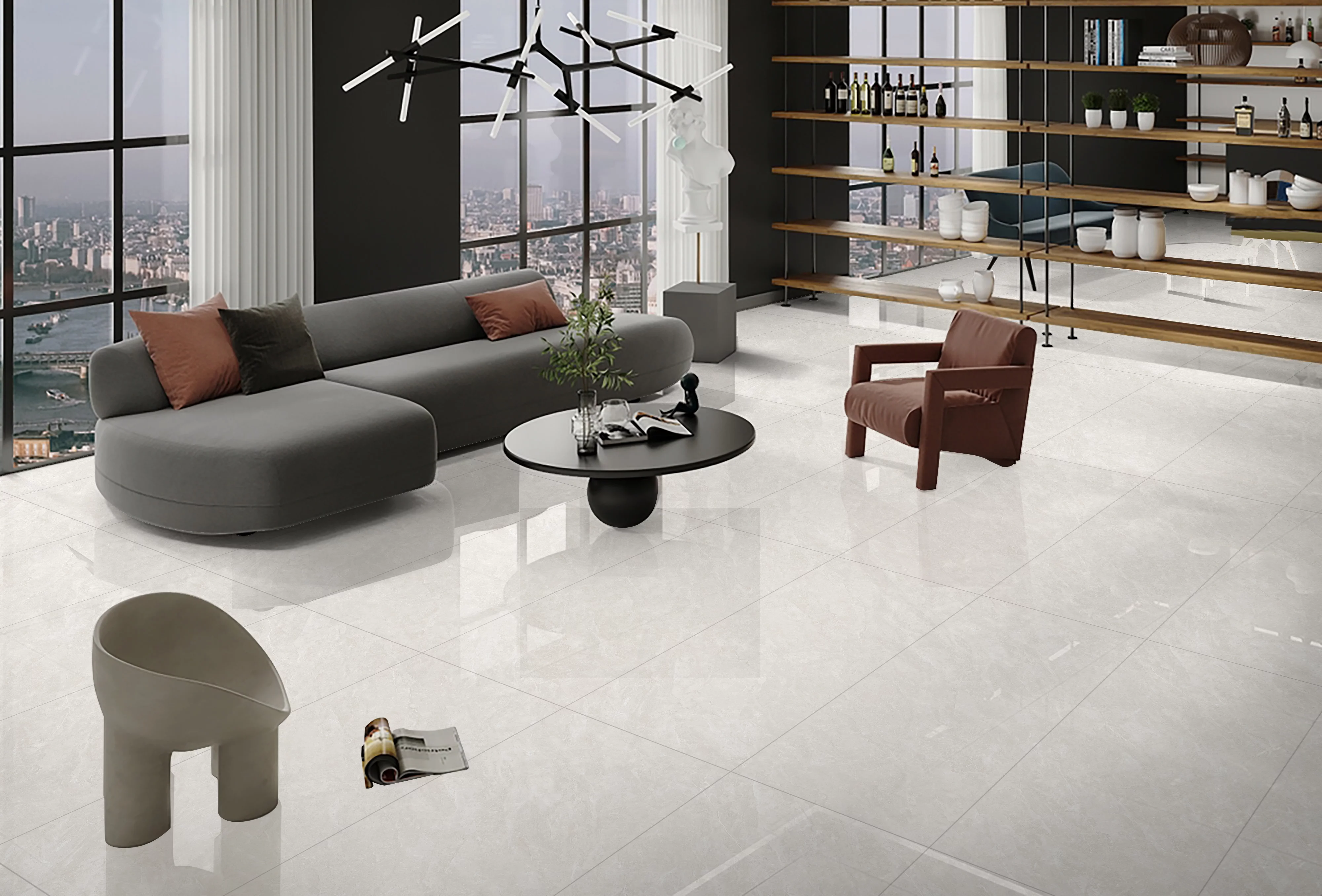 Suprafața lucioasă sporește luminozitatea și creează o atmosferă elegantă, iar formatul mare, rectificat, permite montaj cu rosturi minime pentru un efect vizual continuu.