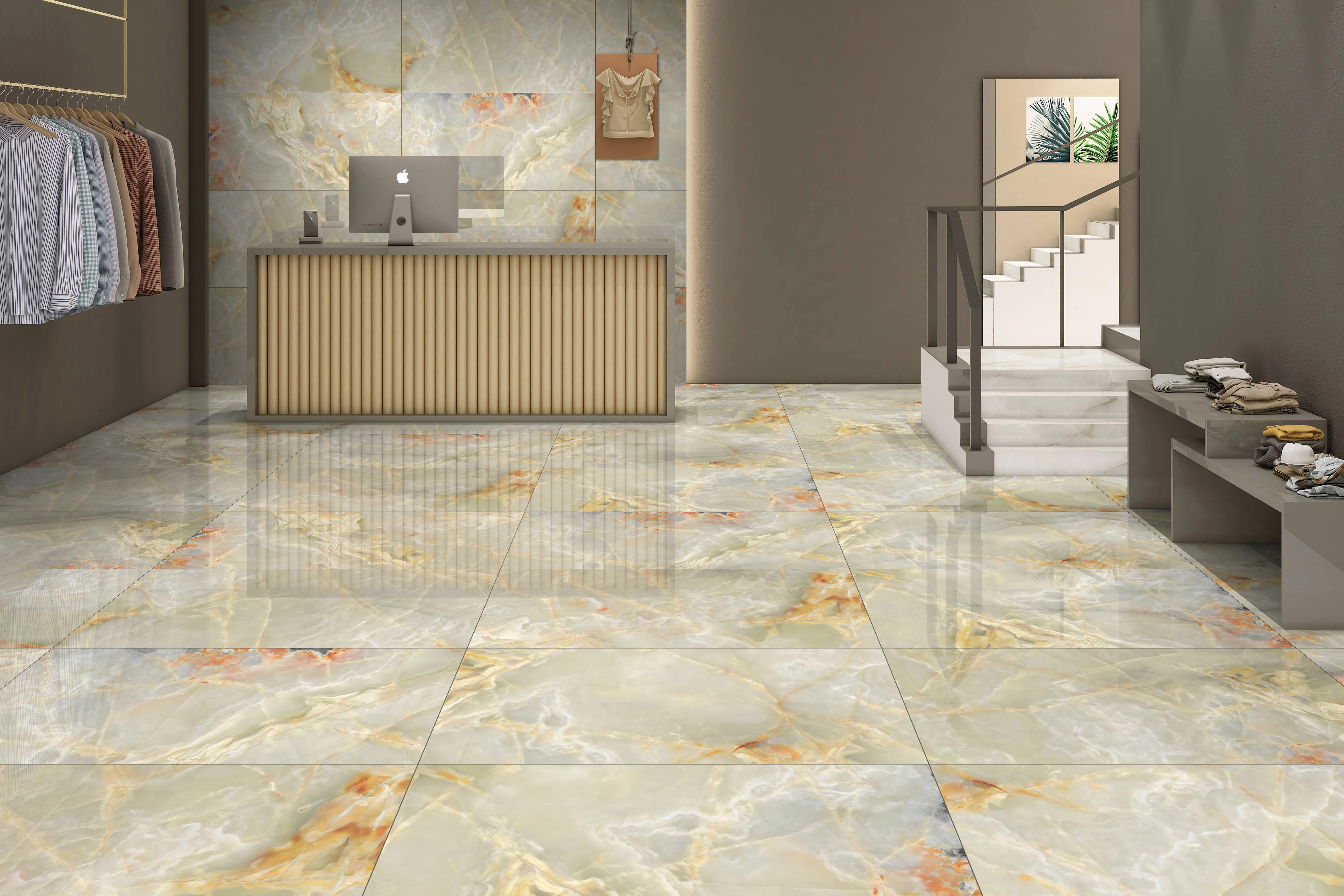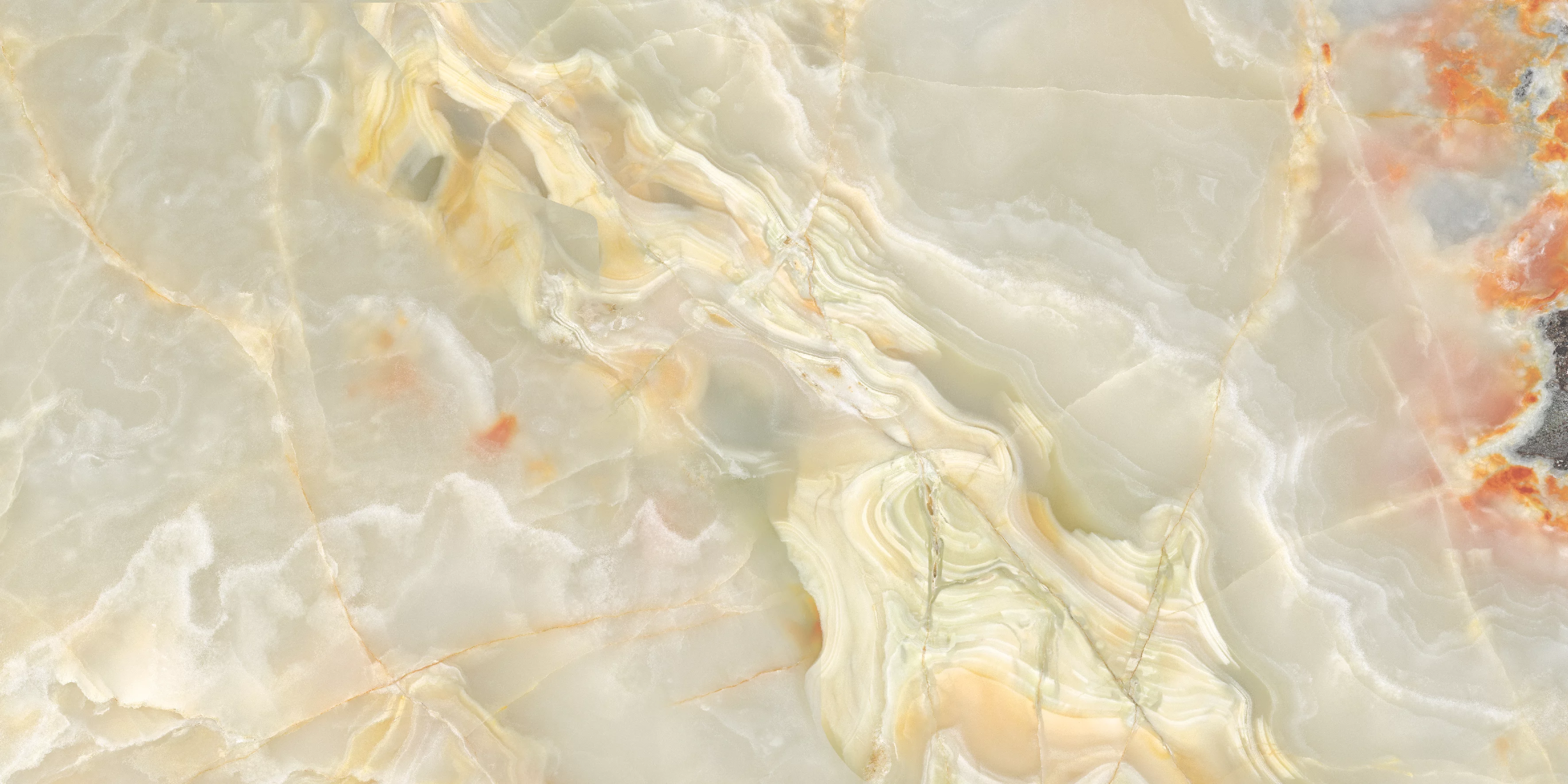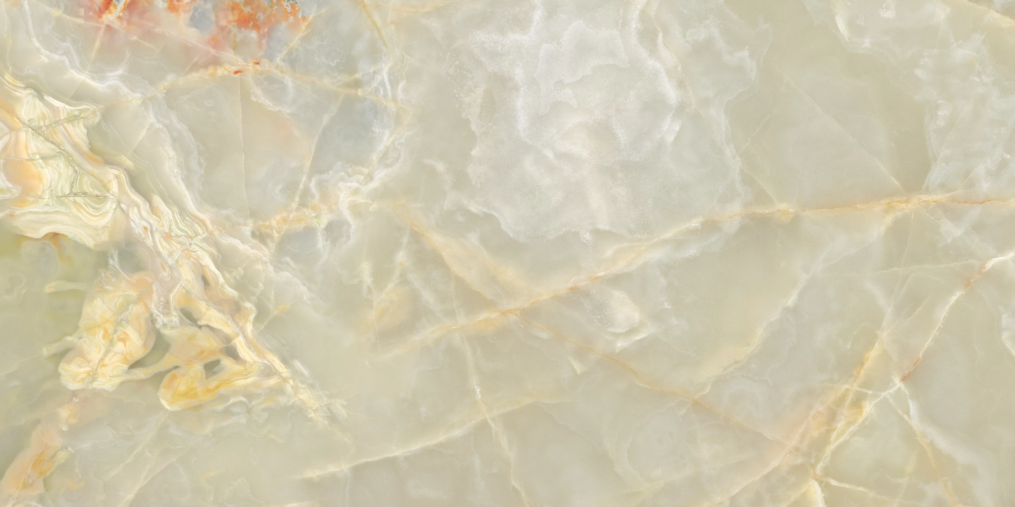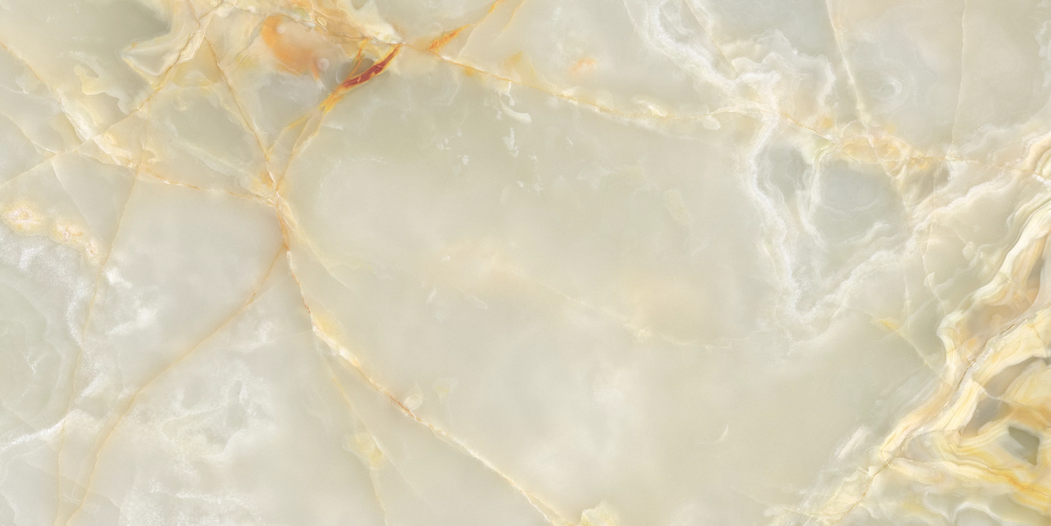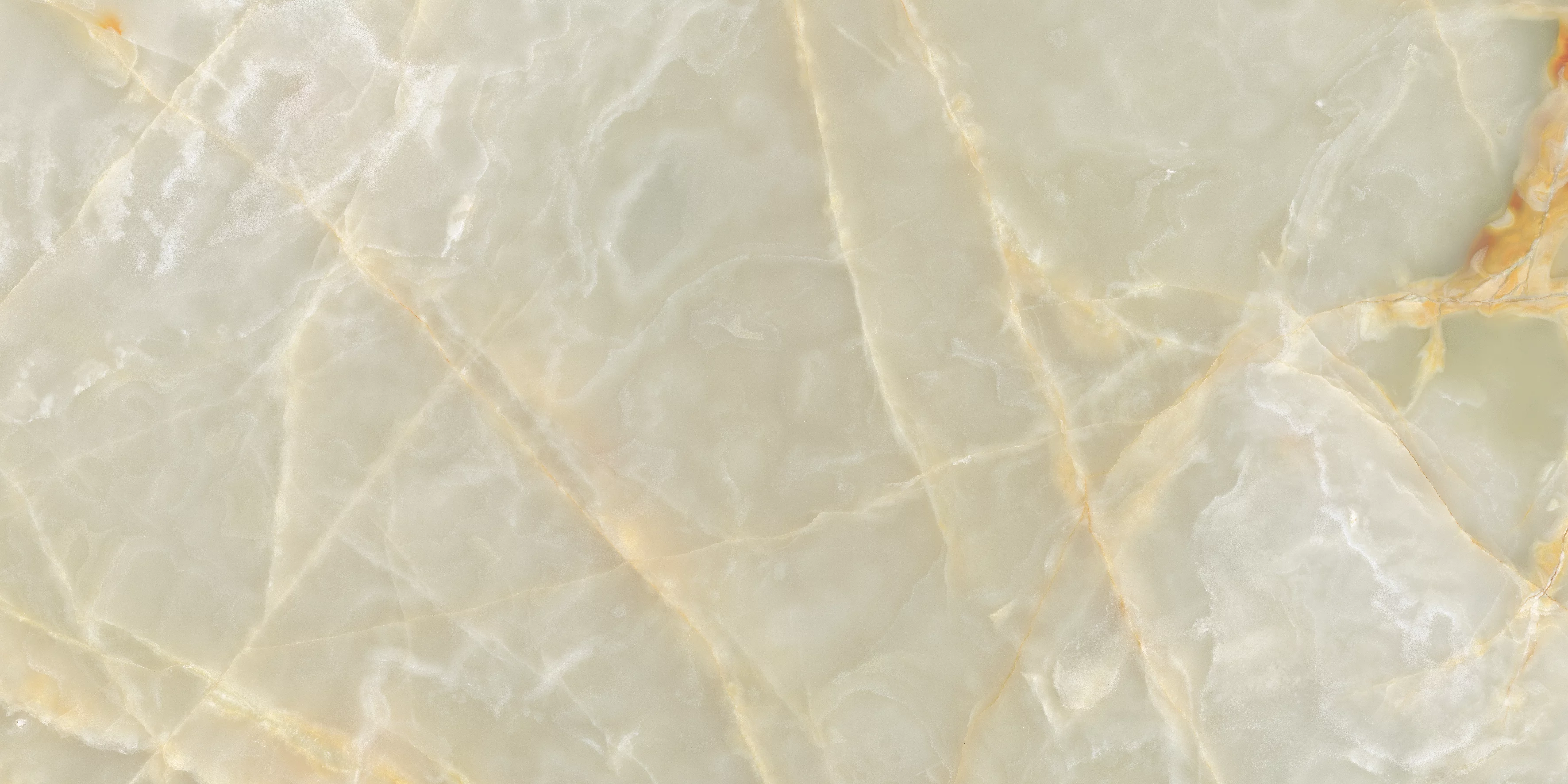 GRESIE BLUETTE ONYX NATURAL - 60X120 cm, porțelanată, lucioasă, cu aspect rafinat de onix, in nuante calde de crem si insertii aurii, ideală pentru interioare și exterioare elegante.