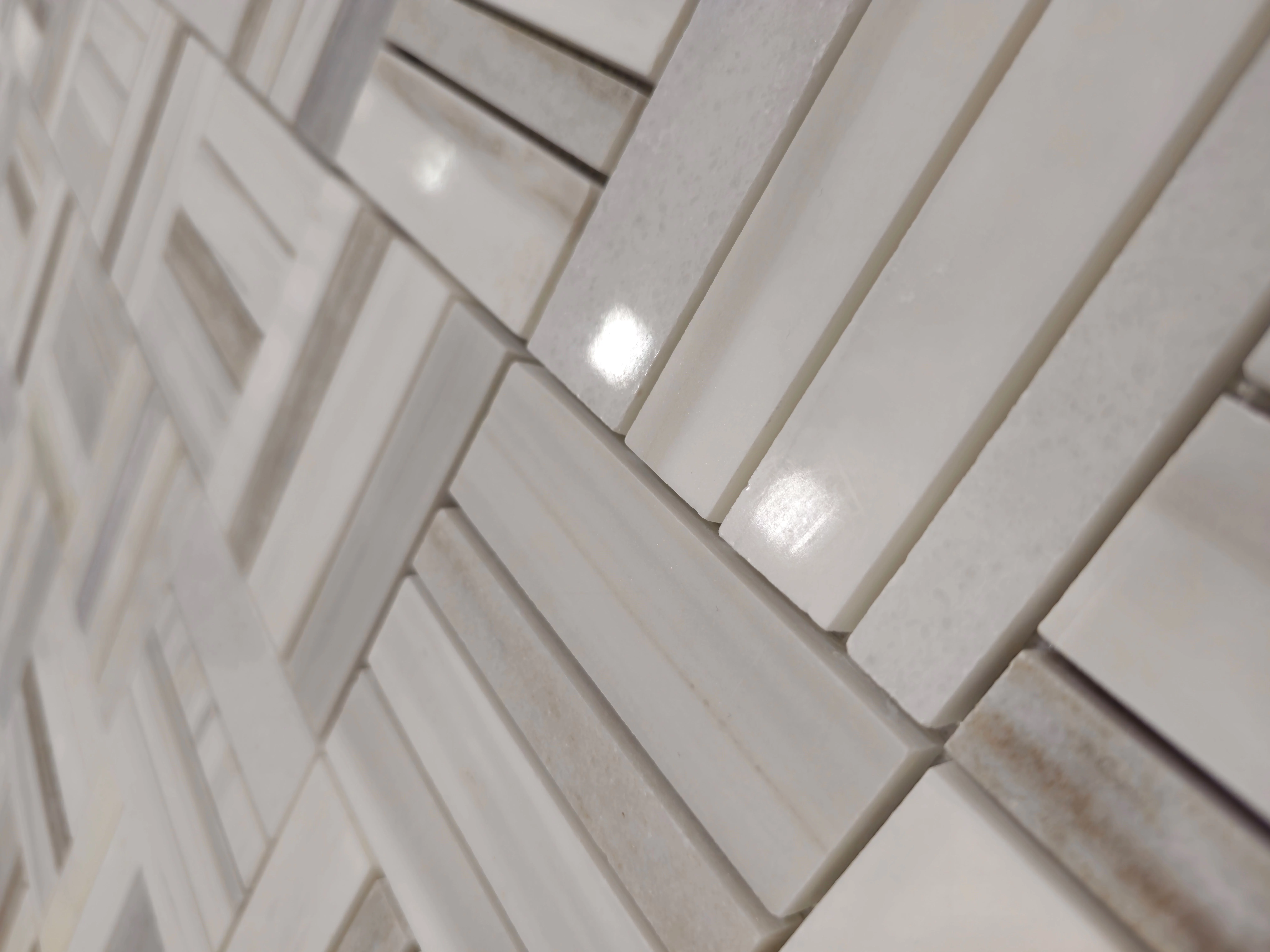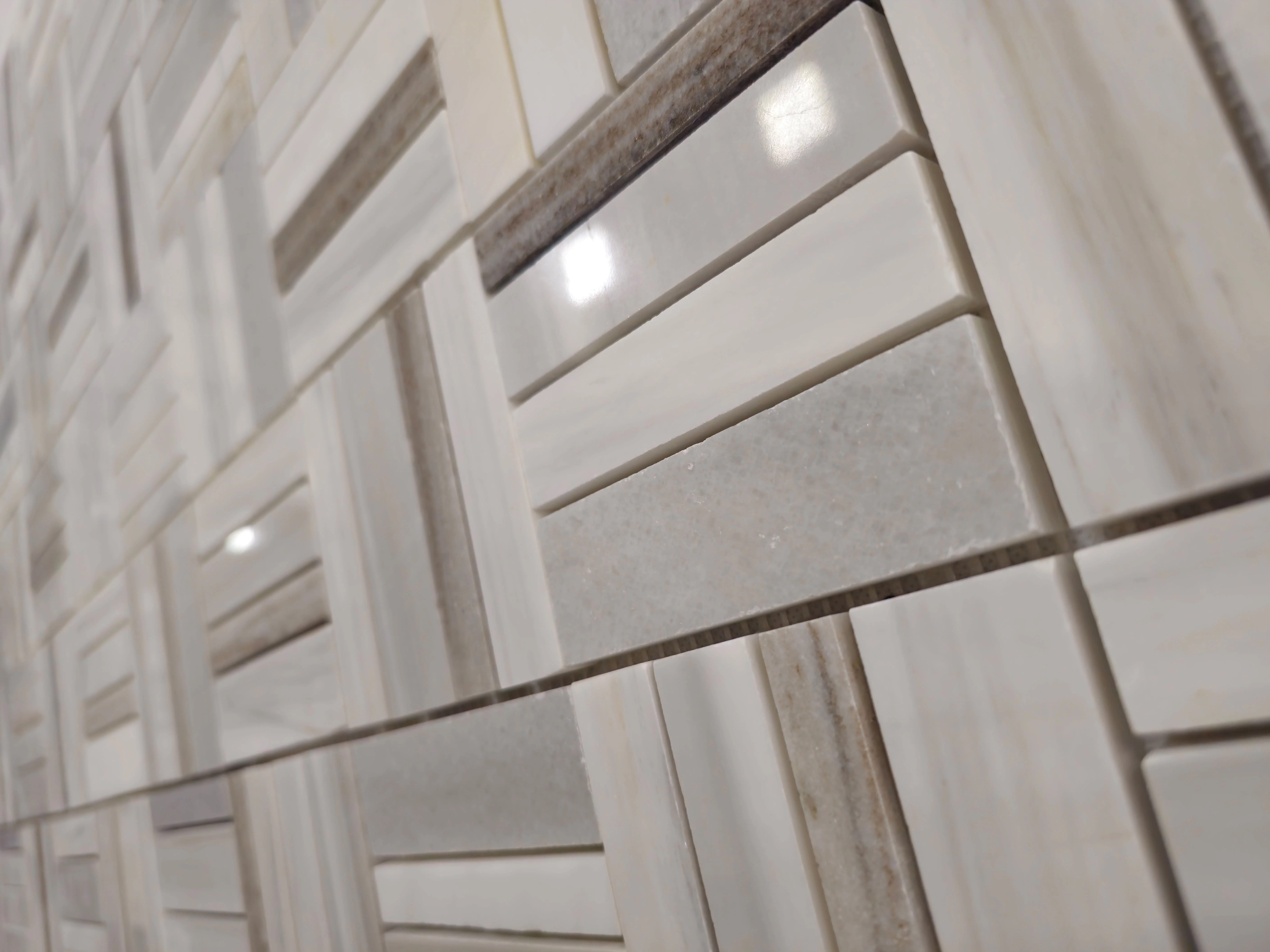 MOZAIC DIN MARMURA METRO MIX este realizat din marmură naturală în tonuri de alb, crem, gri și accente cafenii subtile, combinând nuanțe deschise cu texturi moderne.