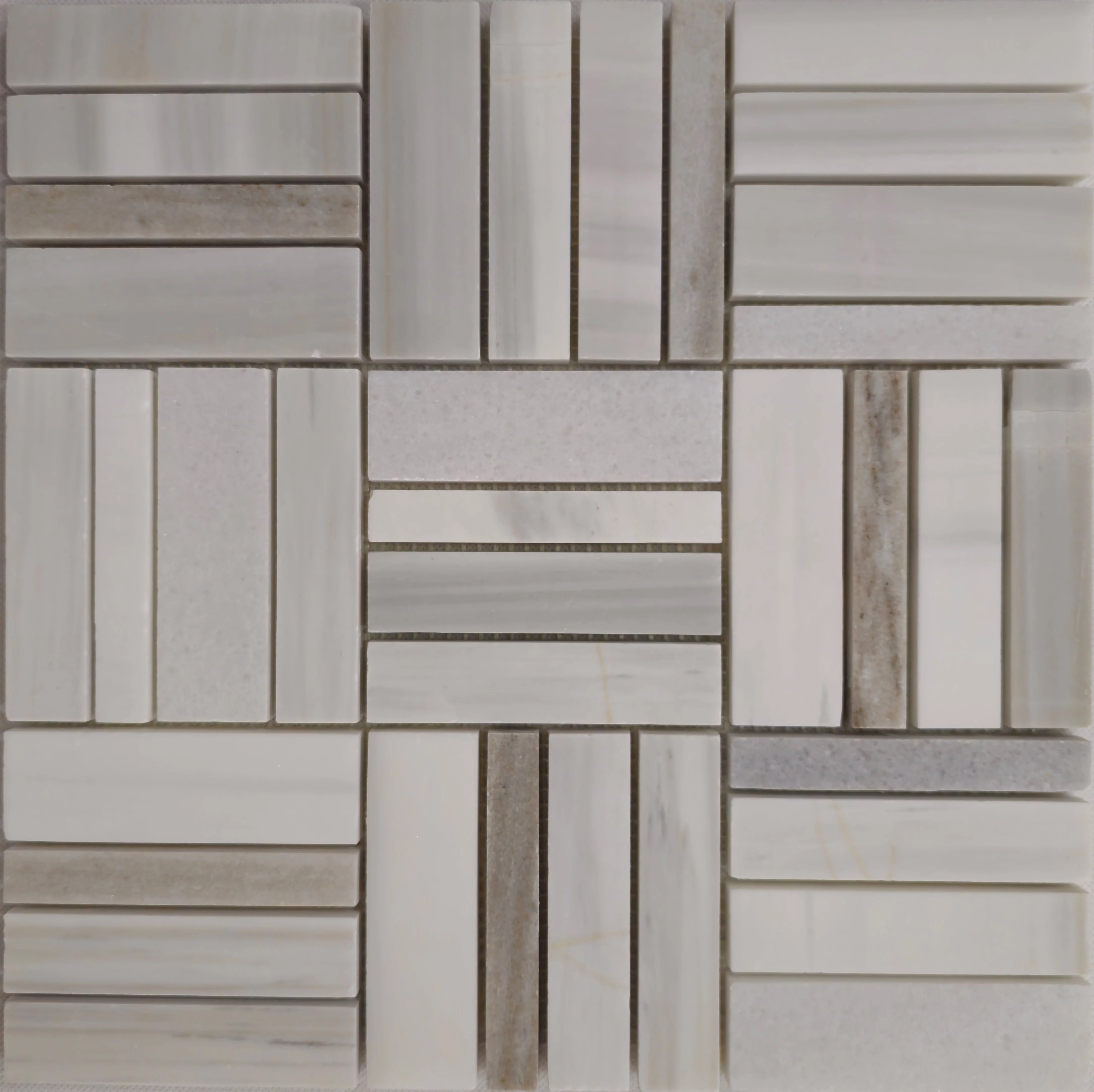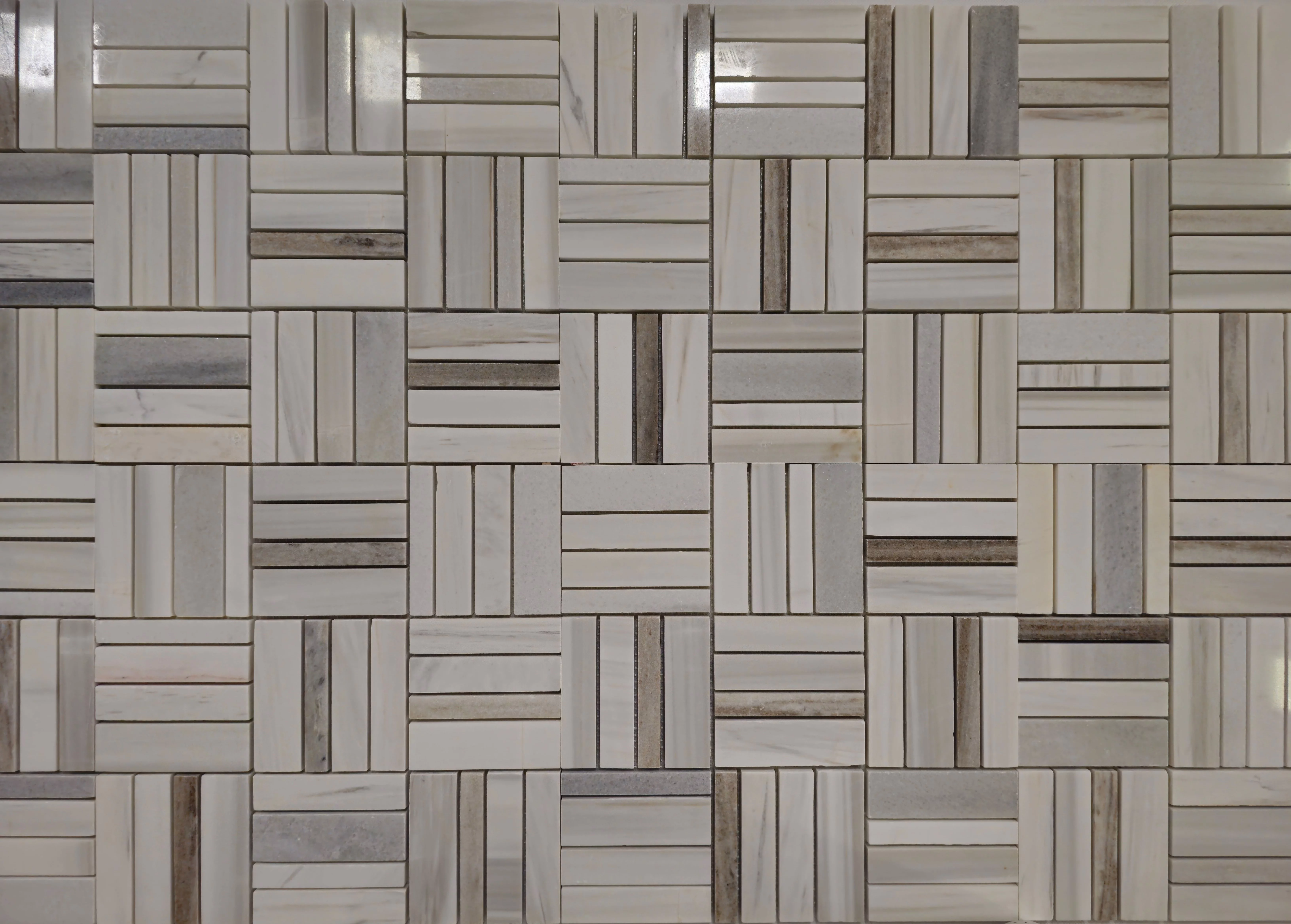 MOZAIC DIN MARMURA METRO MIX - 30.5X30.5 cm, cu finisaj lucios polisat și model geometric elegant, in nuante de alb, gri si tonuri naturale variate, ideal pentru spații moderne și rafinate.
