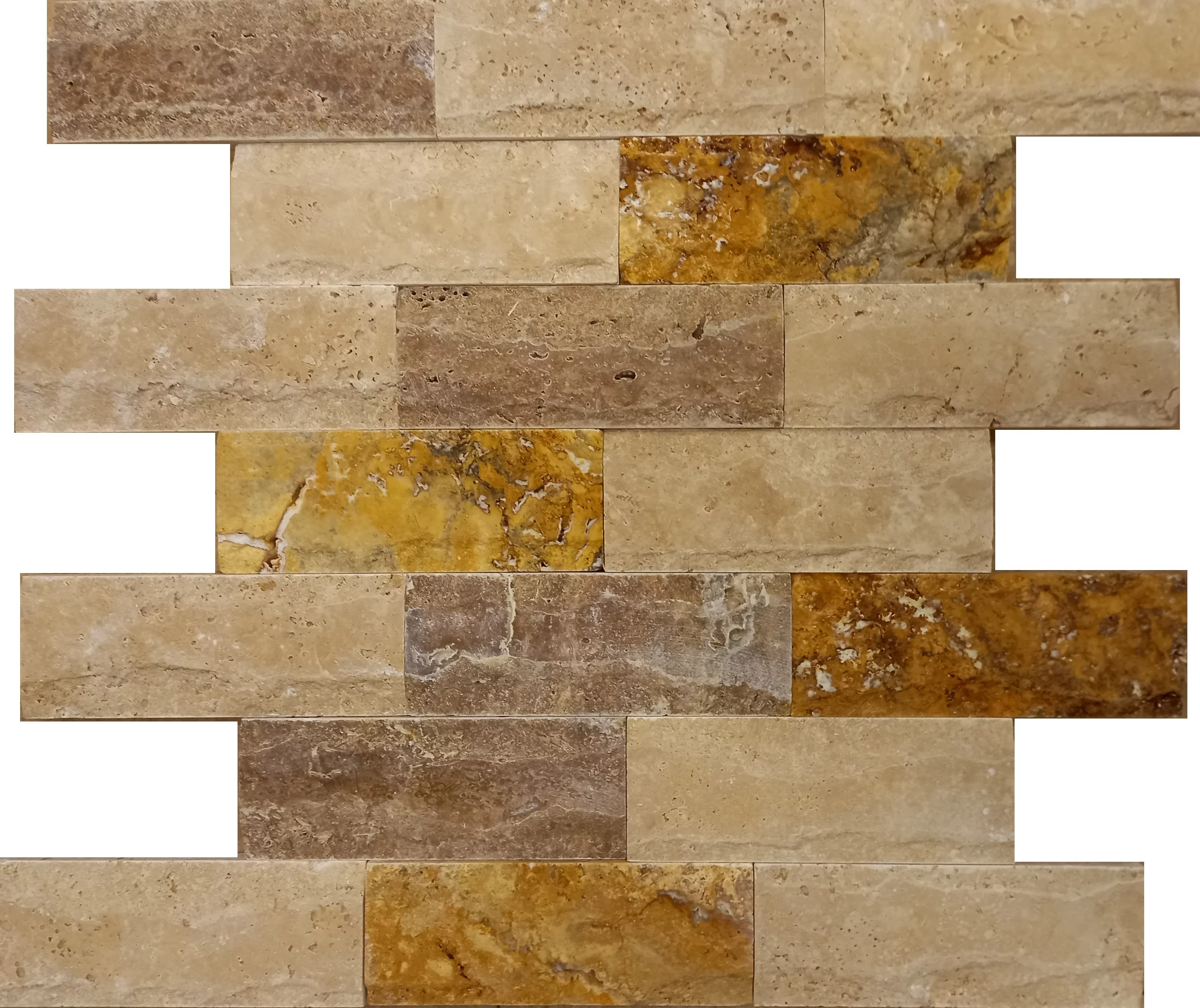 TRAVERTIN MIX CHISELED - 7.5X20 cm, cu grosime variabilă între 1.2-2 cm, mix de culori, finisaj split face, chiseled și brushed, ideal pentru decoruri rustice, naturale și elegante.
