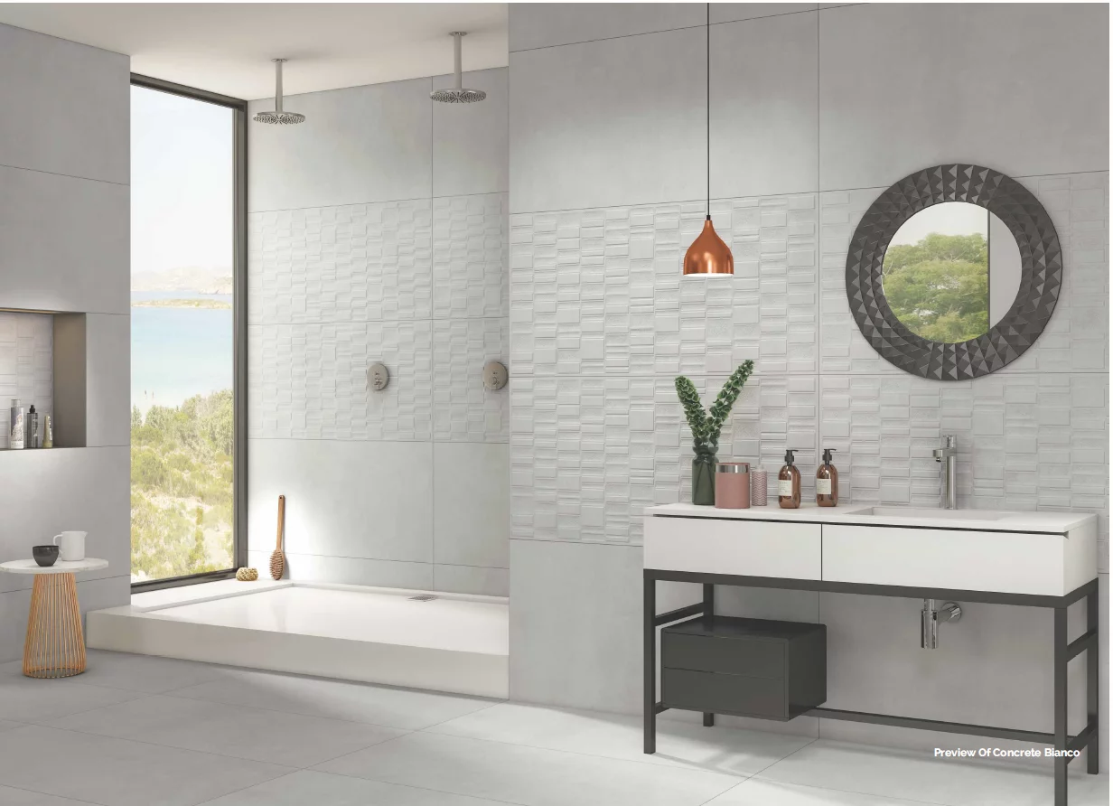Gresia CONCRETE BIANCO VEGA aduce un plus de dinamism și eleganță prin combinația dintre estetica minimalistă a cimentului și suprafața embosată cu efect geometric.