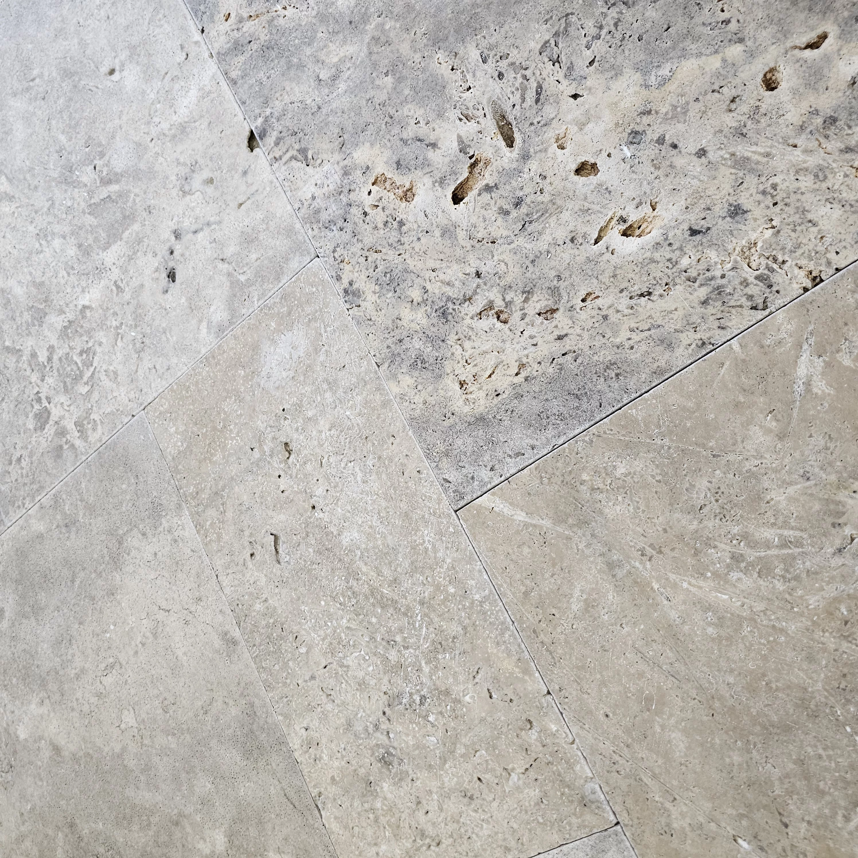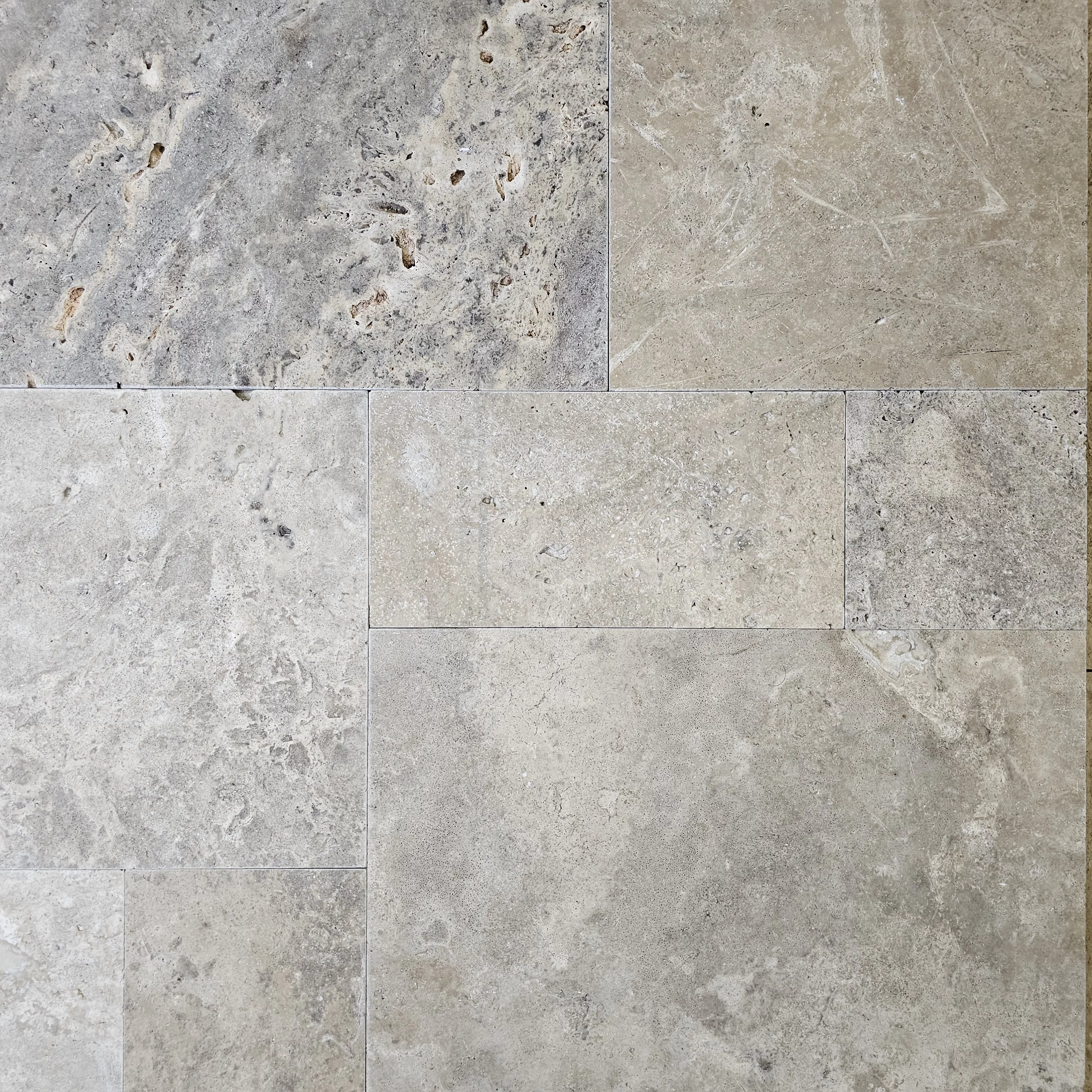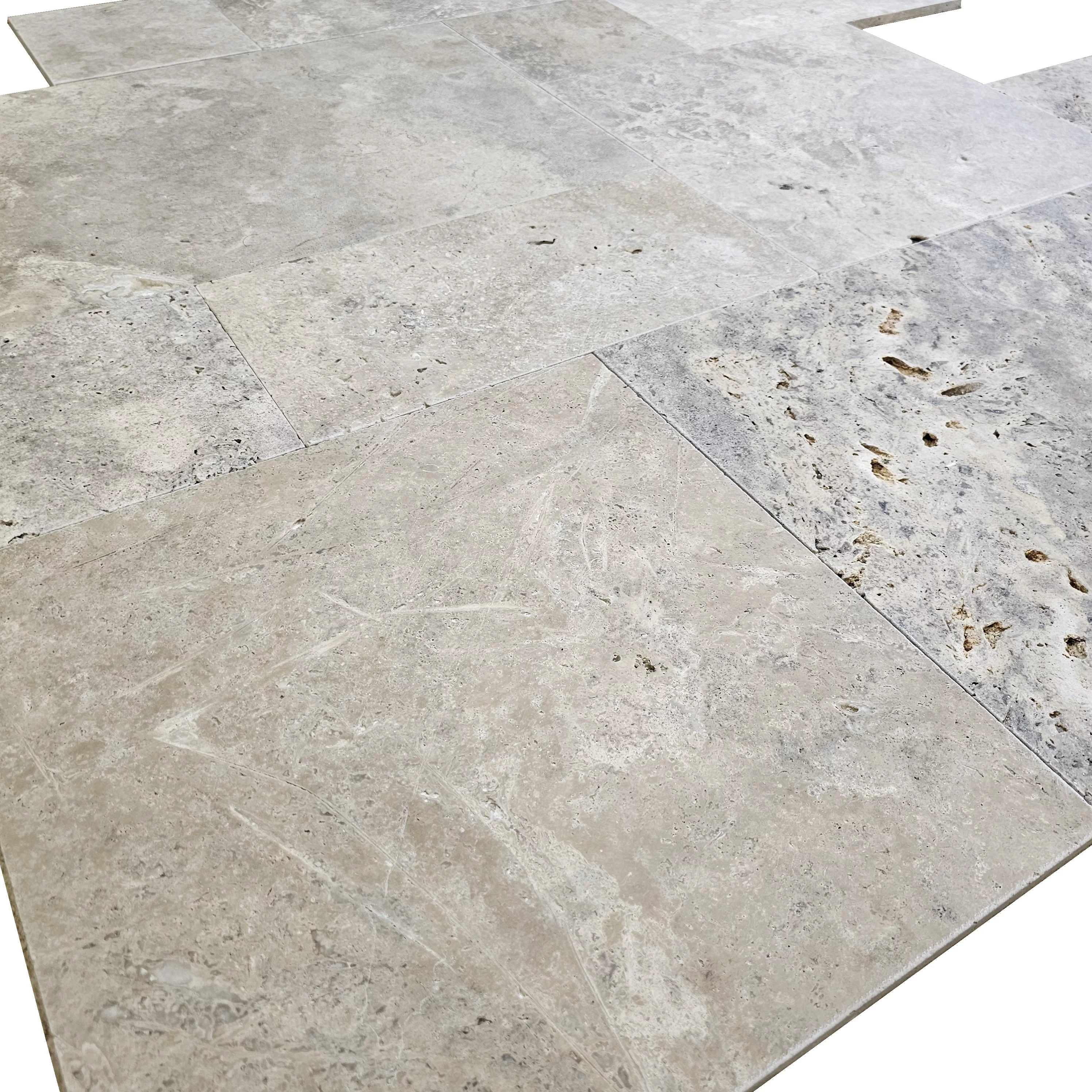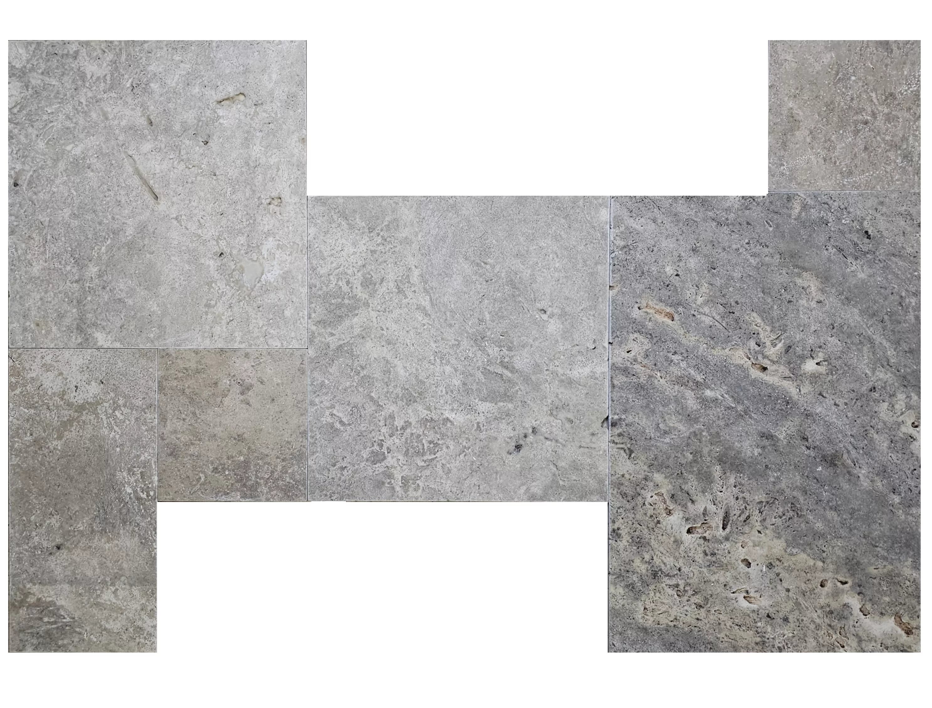 Piatra Naturala, Travertin Silver Tumbled, nechituit, 1.2 cm grosime FRENCH PATTERN 6 PCS / SET - 1PL 40.6X61, 2PL 40.6X40.6, 1PL 20.3X40.6, 2PL 20.3X20.3