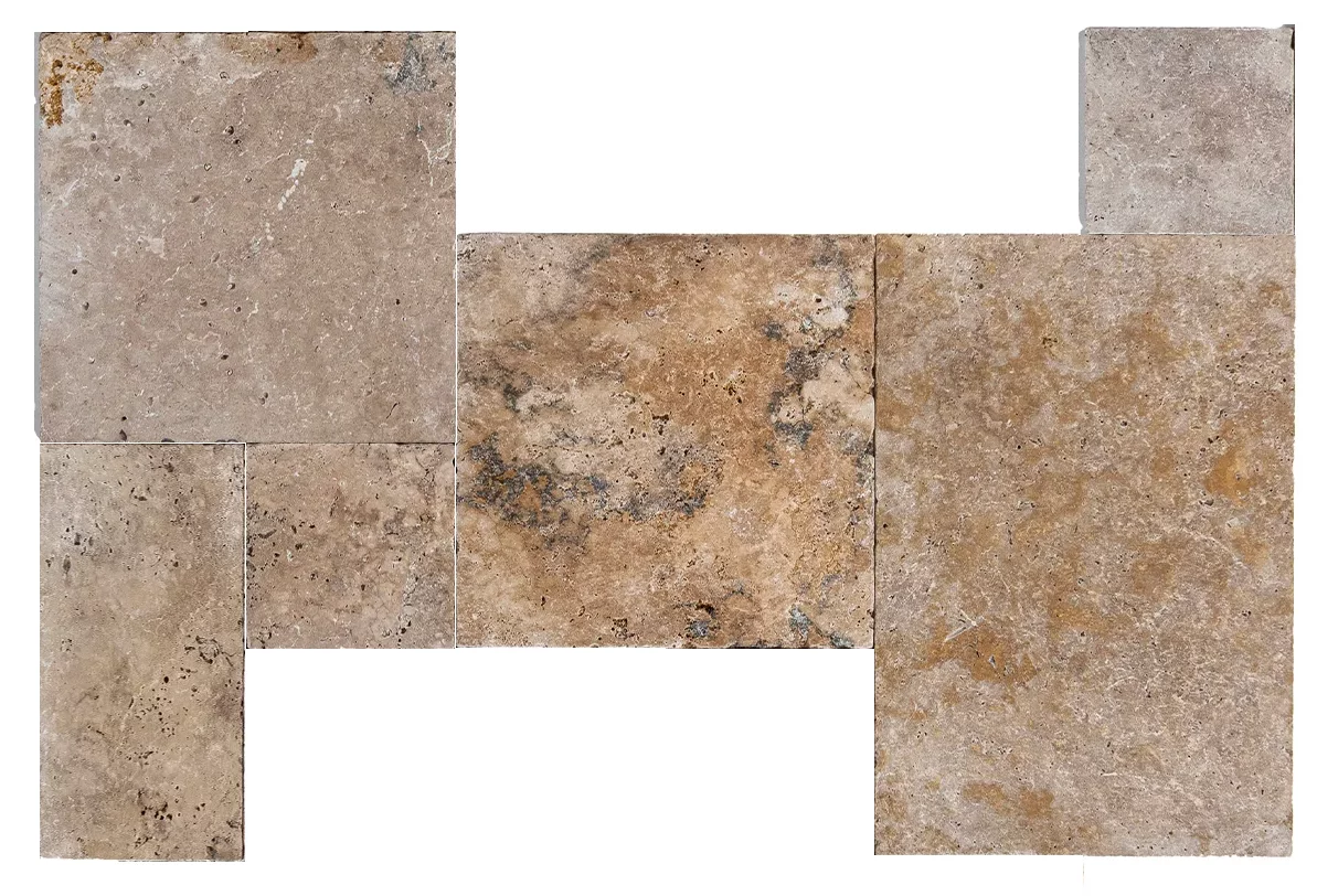 Piatra Naturala, Travertin rustic Tumbled, nechituit, 1.2 cm grosime FRENCH PATTERN 6 PCS / SET - 1PL 40.6X61, 2PL 40.6X40.6, 1PL 20.3X40.6, 2PL 20.3X20.3