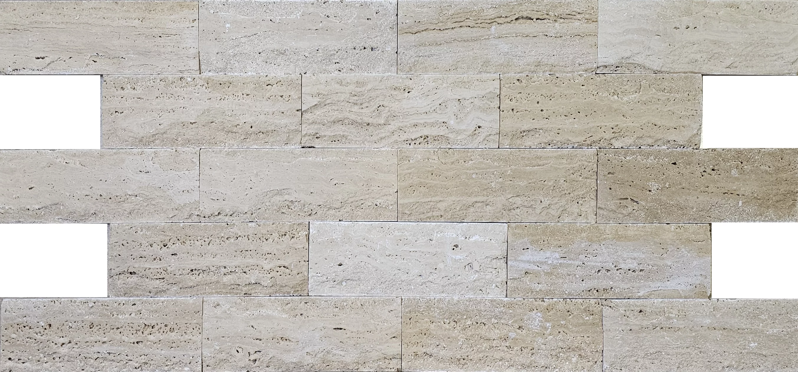 TRAVERTIN LIGHT CHISELED - 7.5X20 cm, în nuanțe calde de bej deschis, cu suprafață dăltuită și periată, oferă un aspect rustic și autentic. Ideală pentru placări interioare și exterioare, aduce textură și eleganță naturală oricărui spațiu.