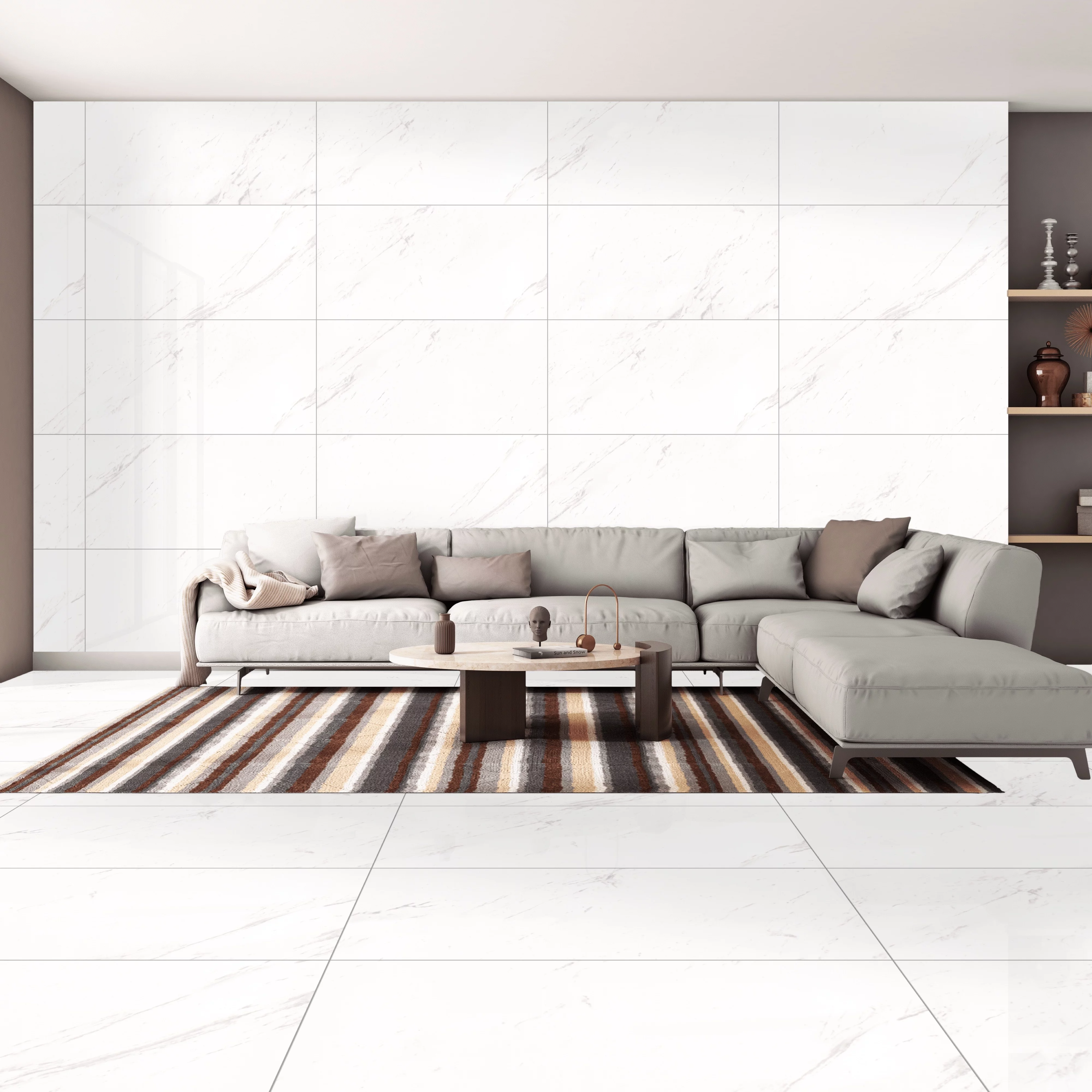 GRESIE ROYAL PLATINUM SATVARIO - 60X120 cm, portelanată, glazurata, suprafata lucioasă, design elegant inspirat din marmură alba cu nervuri fine gri, pentru spații interioare și exterioare, compatibila cu incalzirea in pardoseala.