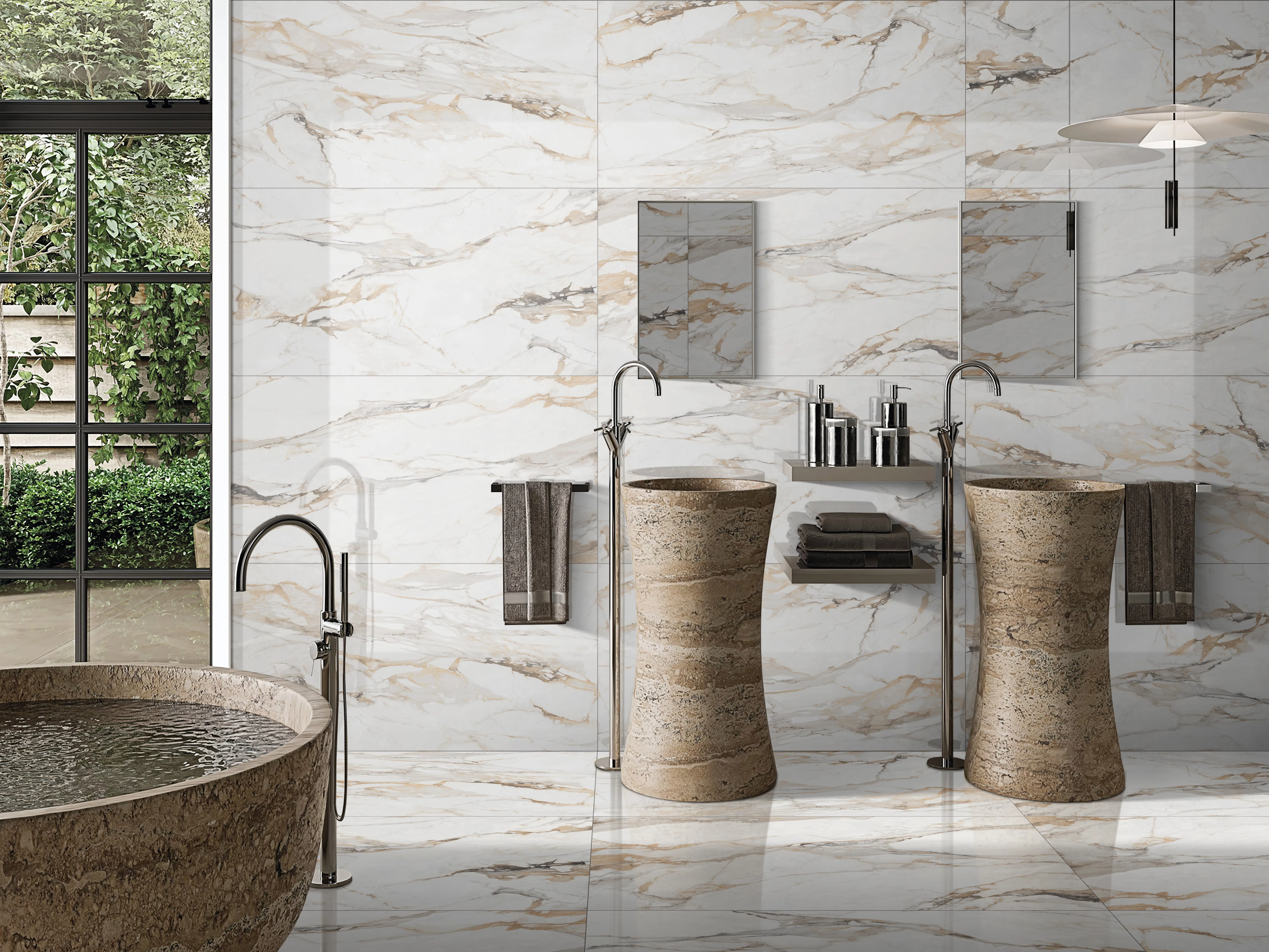 Nuanțele de alb, completate de venaturi elegante în tonuri de bej și maro, creează o atmosferă rafinată și luminoasă.