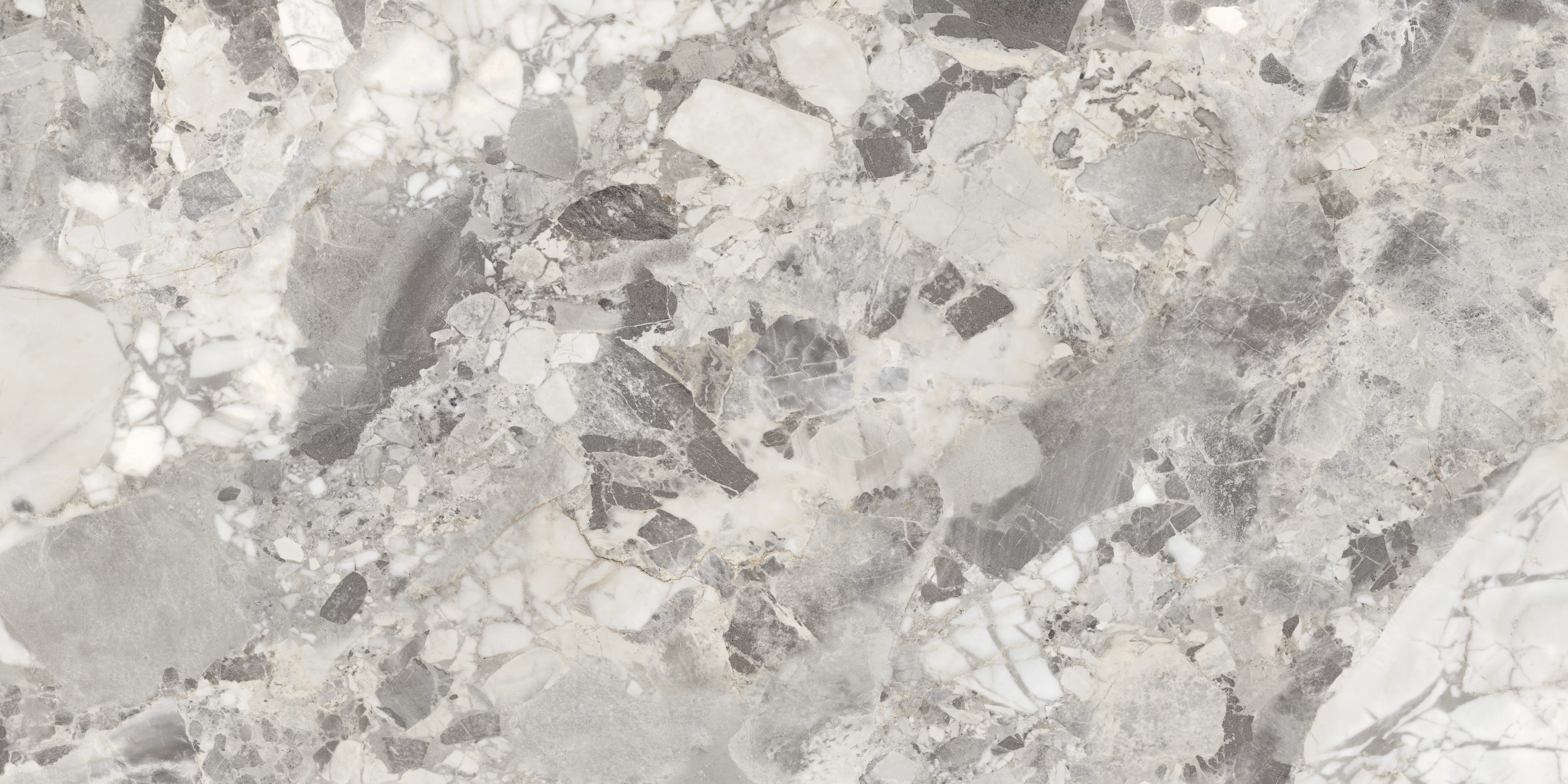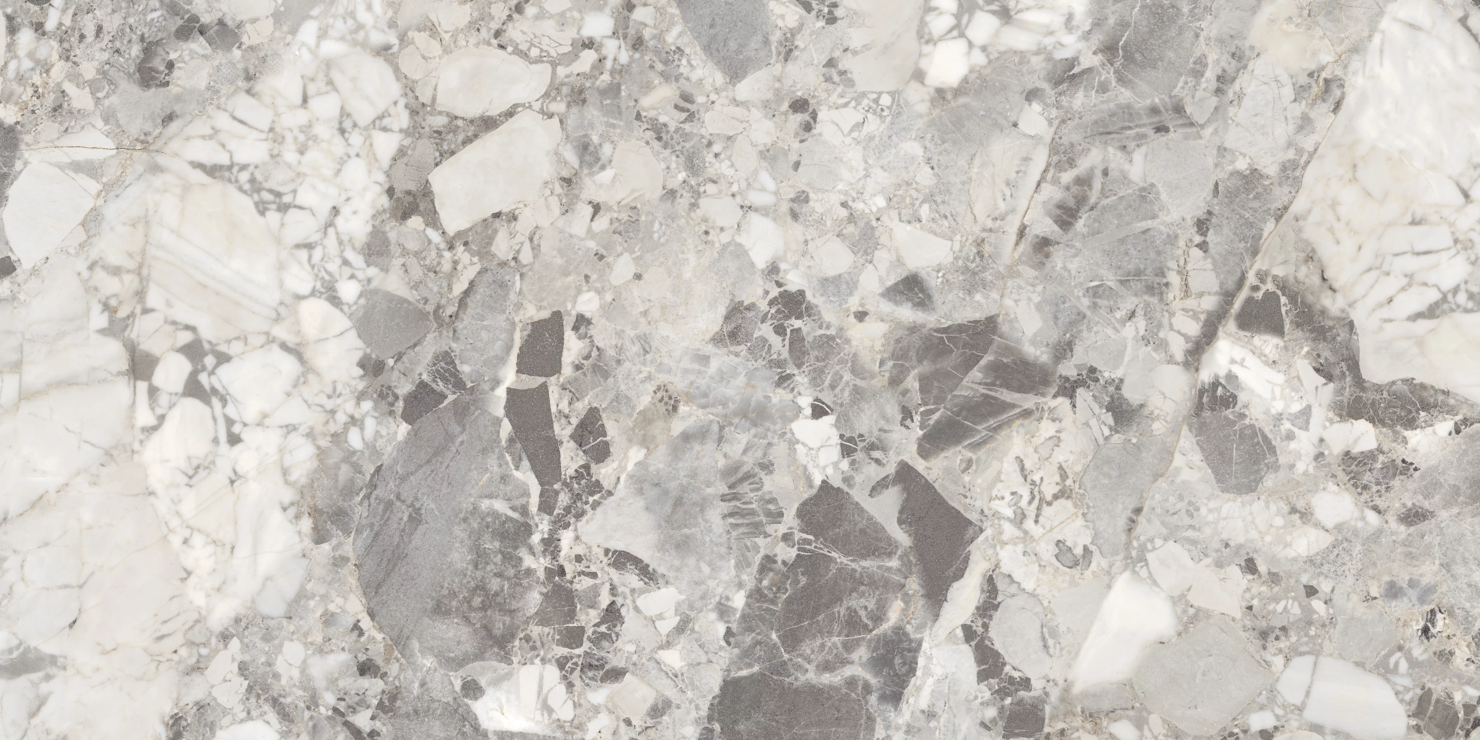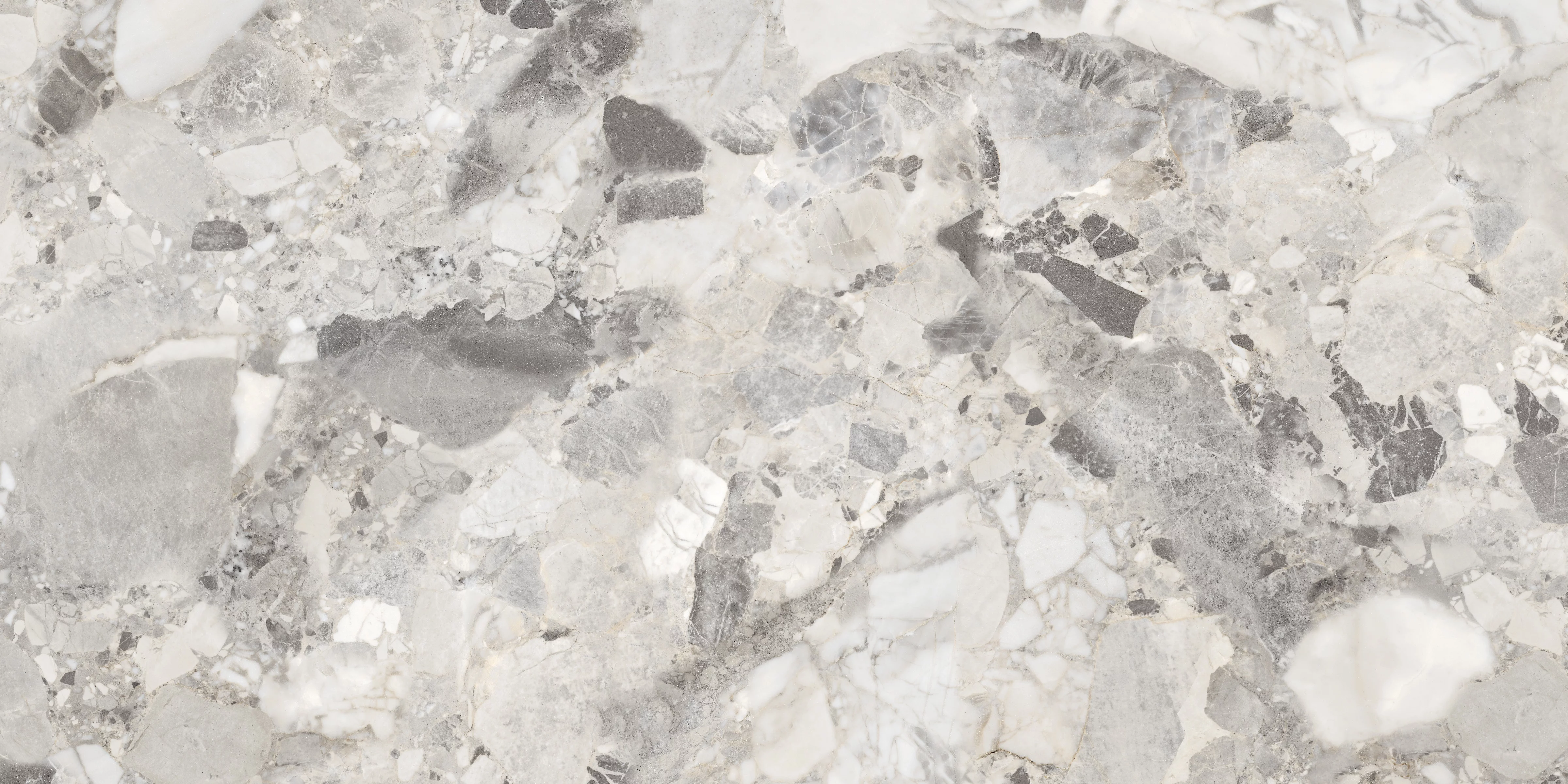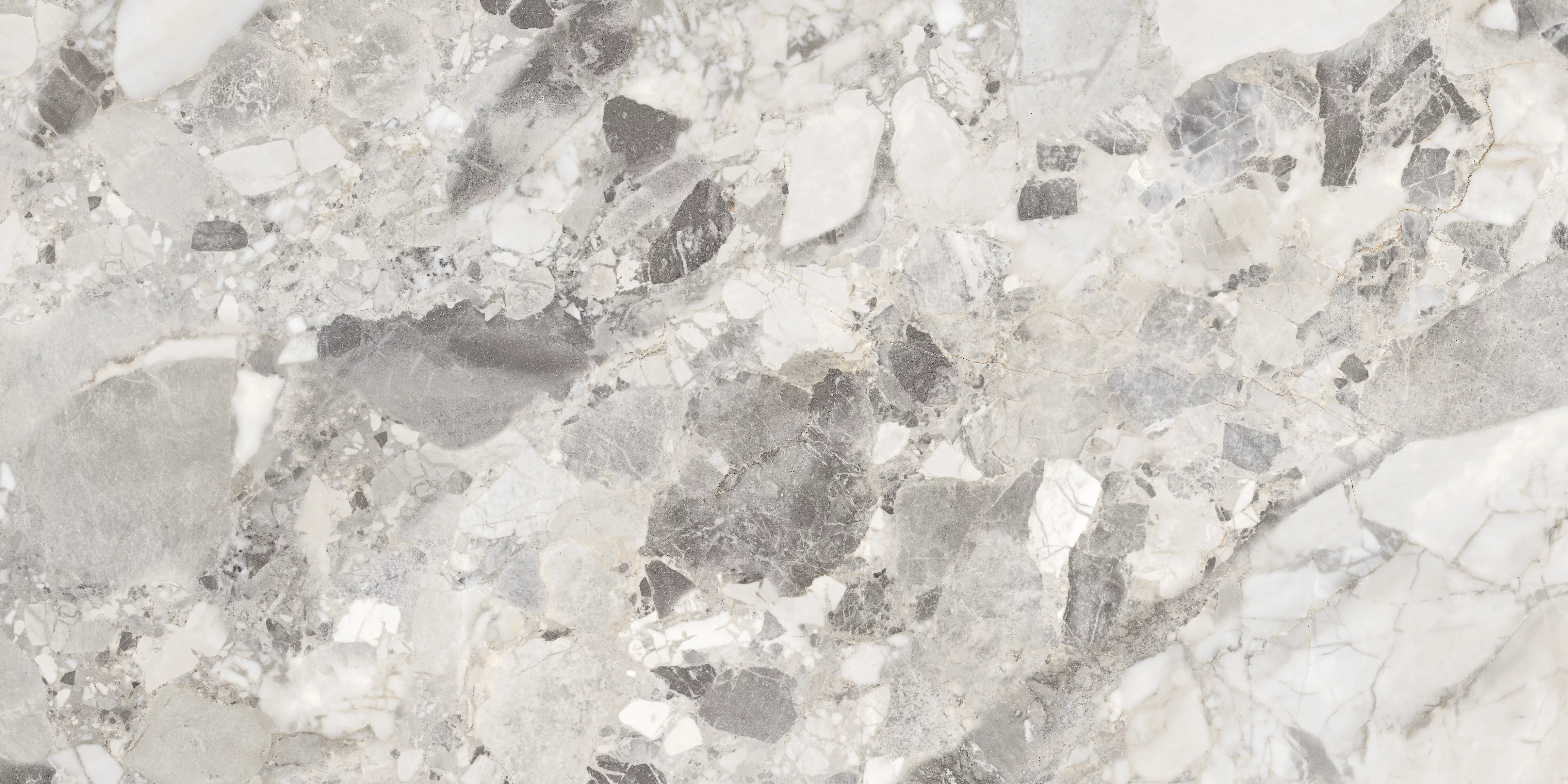 Gresia COPICO GREY se remarcă printr-un design elegant de tip terrazzo reinterpretat, cu fragmente în nuanțe de gri deschis, gri intens și alb, creând un efect vizual natural și sofisticat.