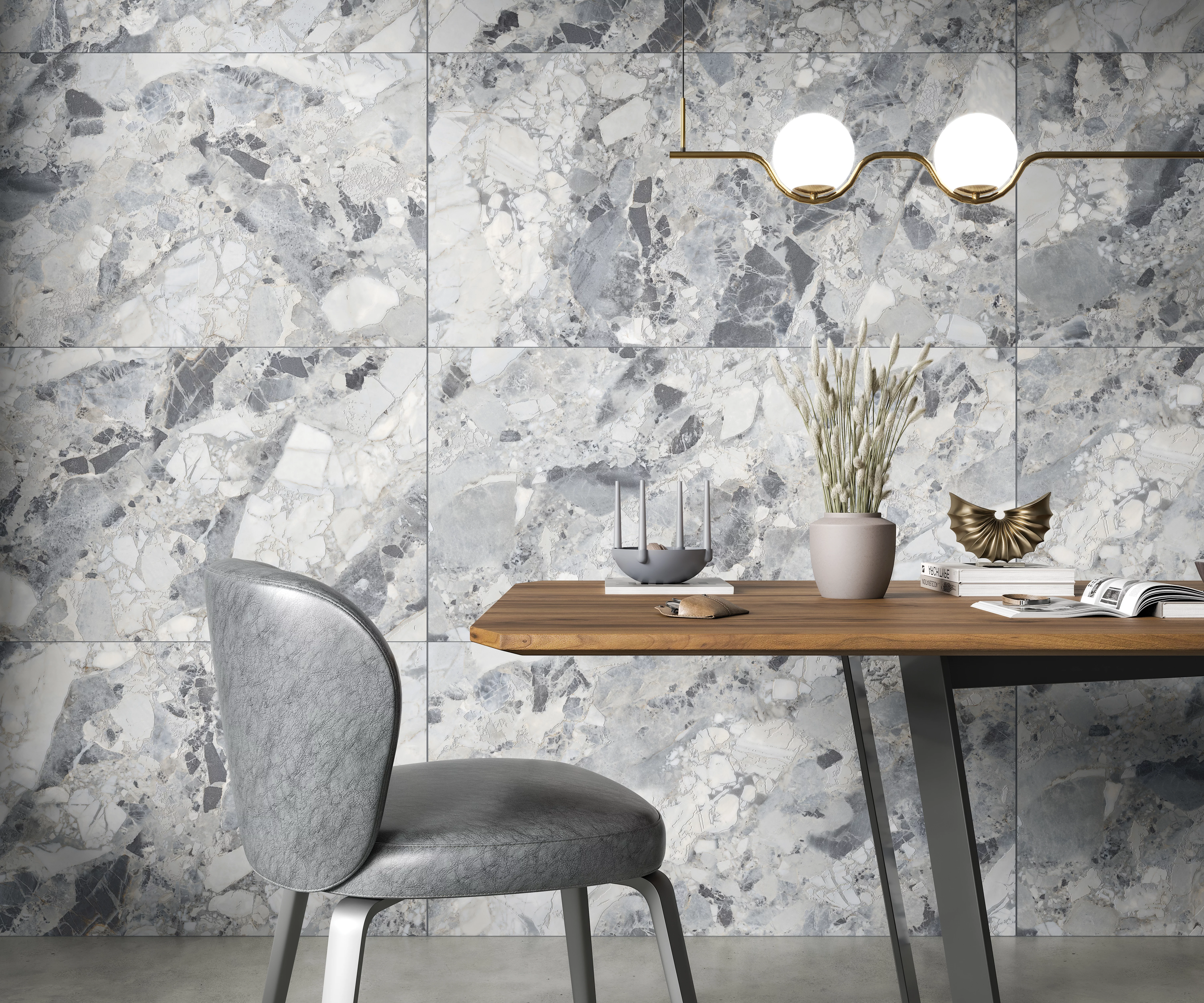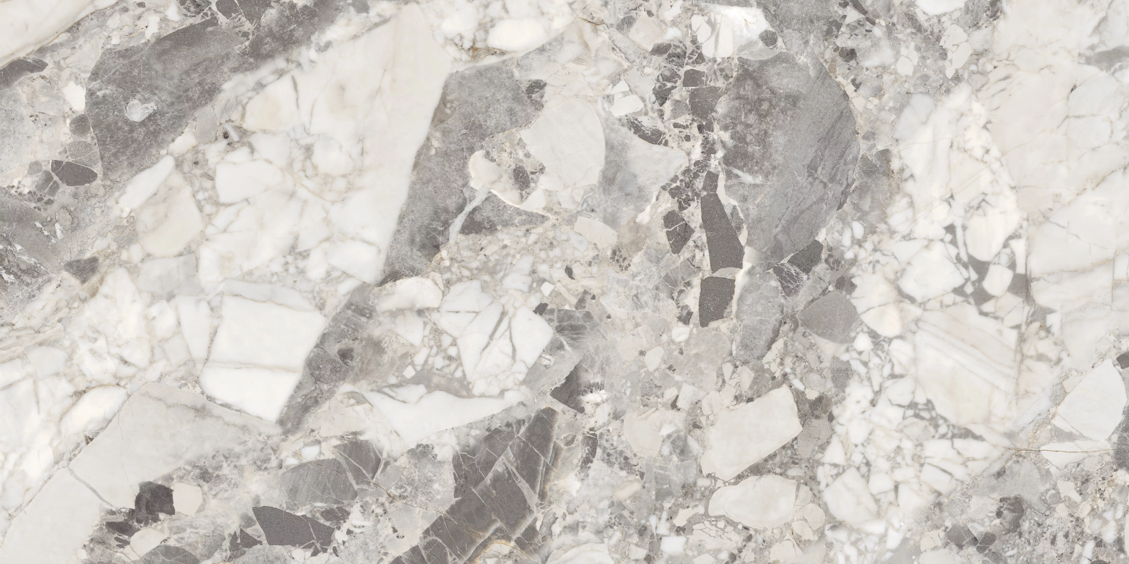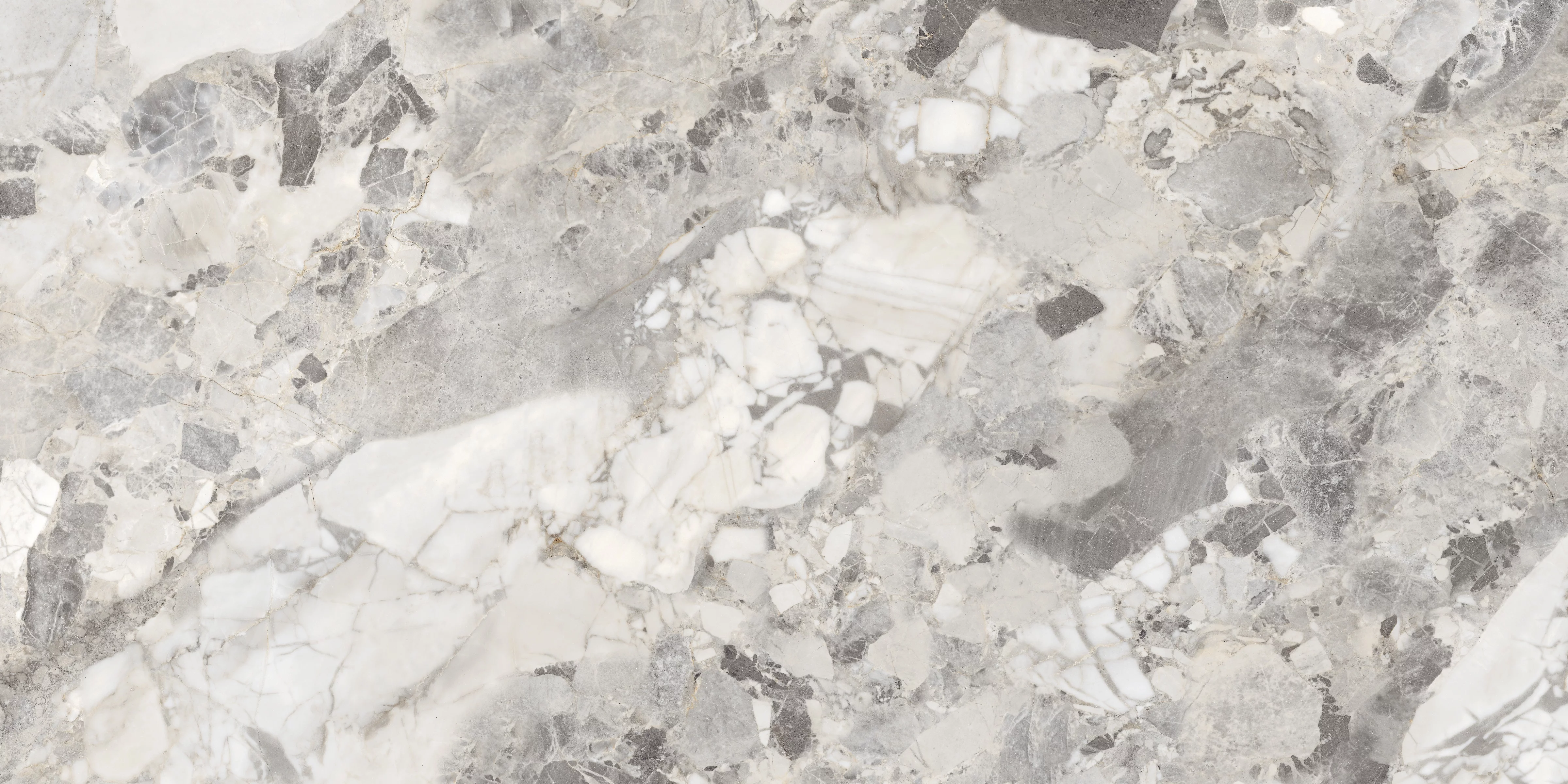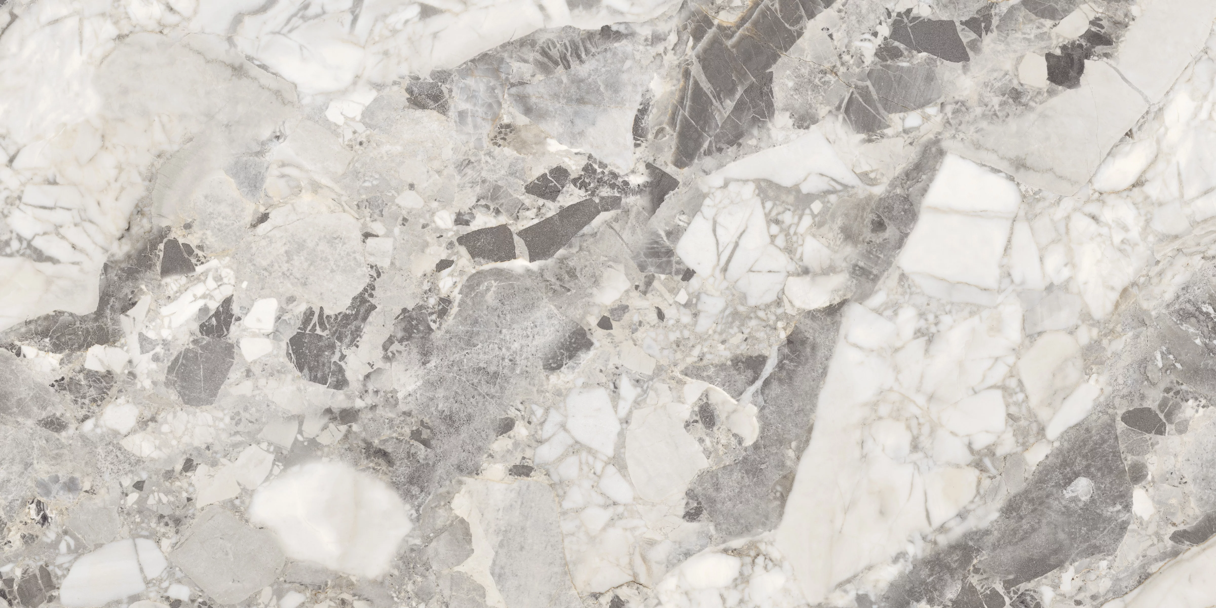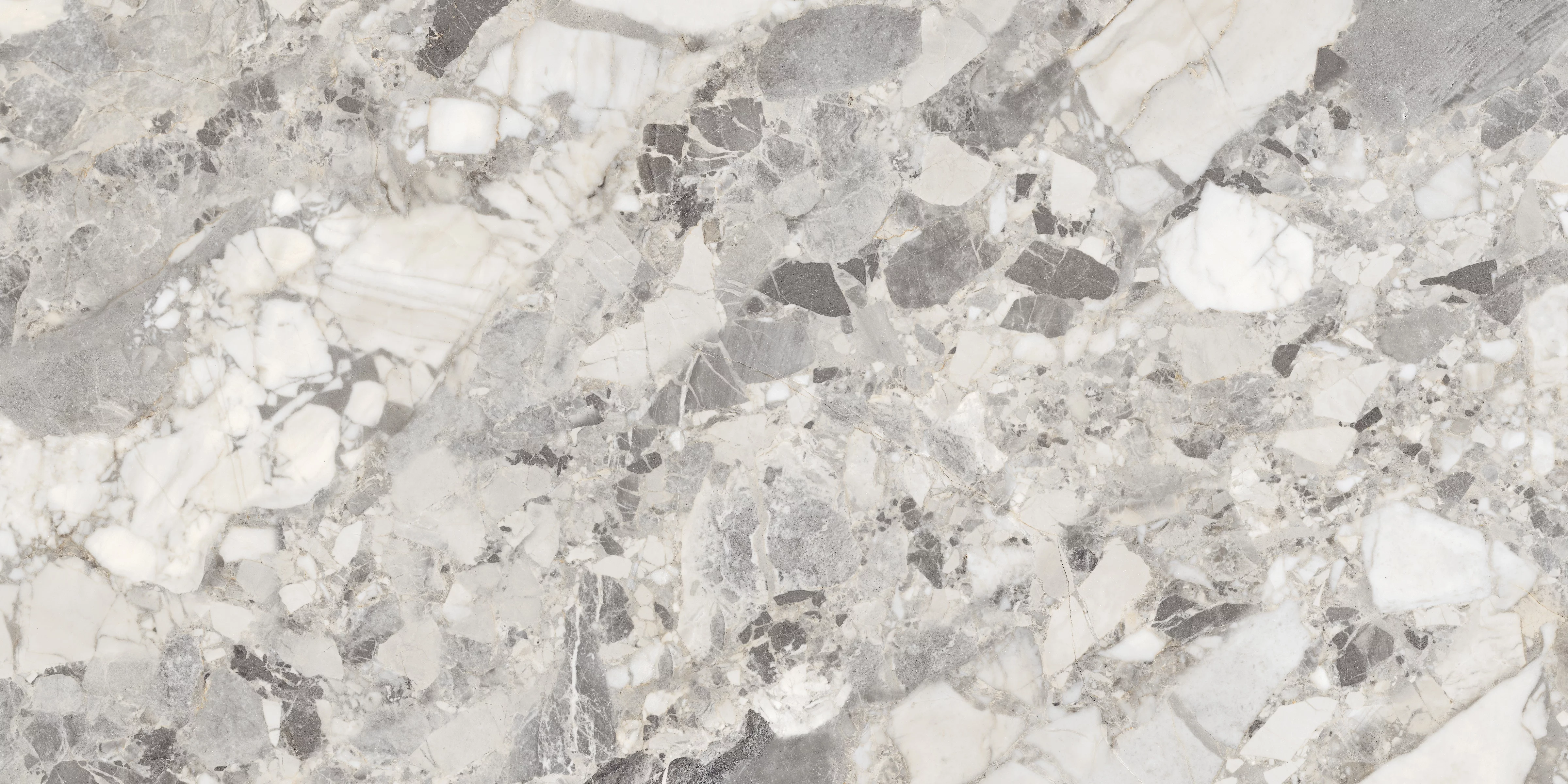 Gresia COPICO GREY se remarcă printr-un design elegant de tip terrazzo reinterpretat, cu fragmente în nuanțe de gri deschis, gri intens și alb, creând un efect vizual natural și sofisticat.