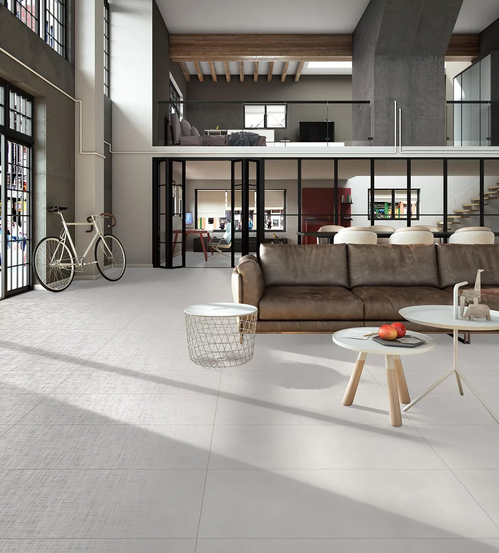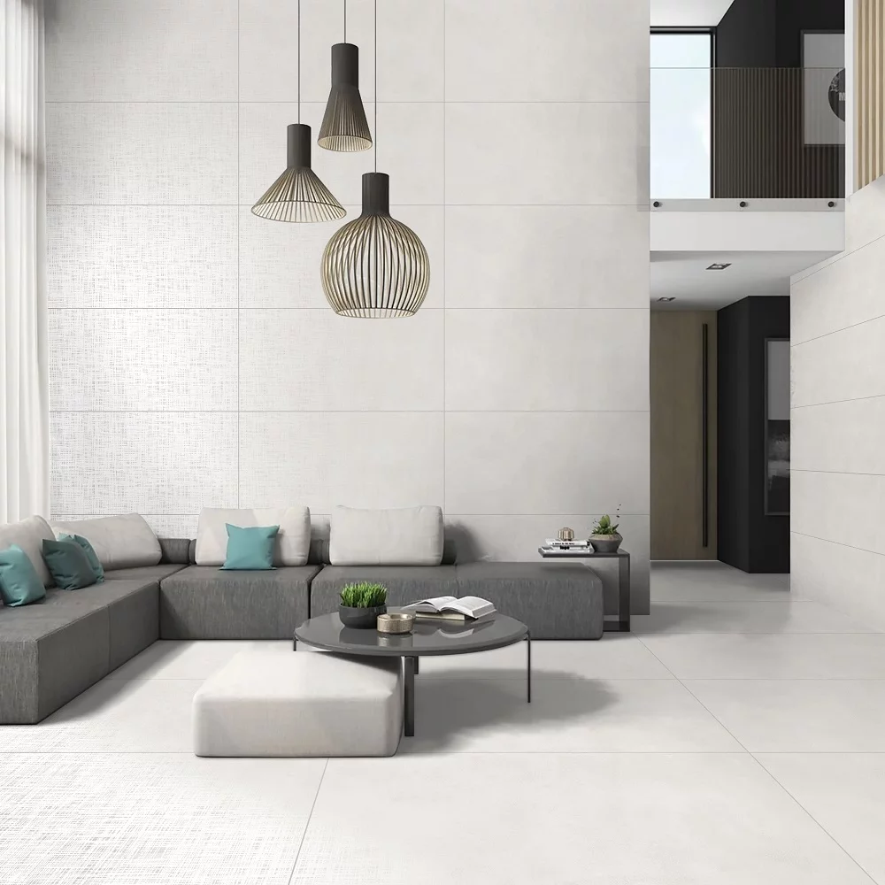 Gresia FABRIC 2 WHITE se evidențiază prin aspectul său monocrom, curat și uniform, ce imită o suprafață textilă delicată cu o textura discretă în relief.