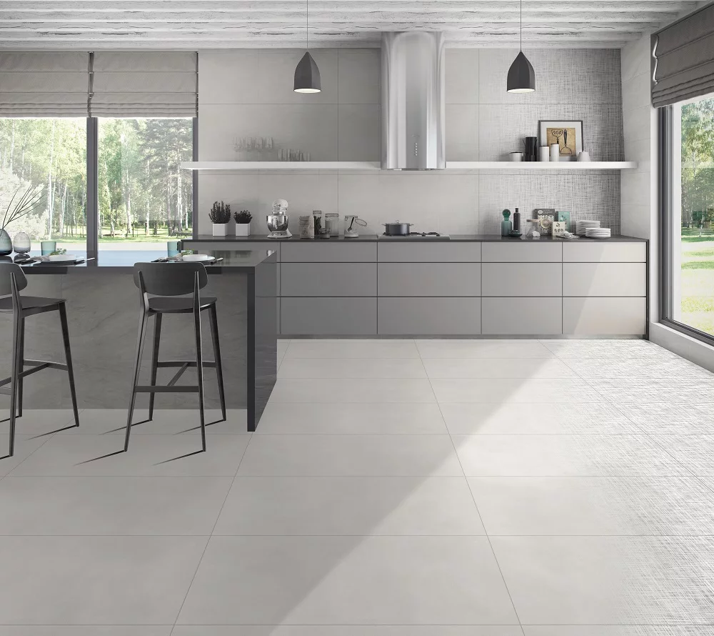 GRESIE FABRIC 2 WHITE - 60X120 cm, porțelanată, mată carving, nuanță gri deschis cu textura subtilă, model unitar, ideală pentru interioare moderne și minimaliste, dar și pentru spații comerciale.