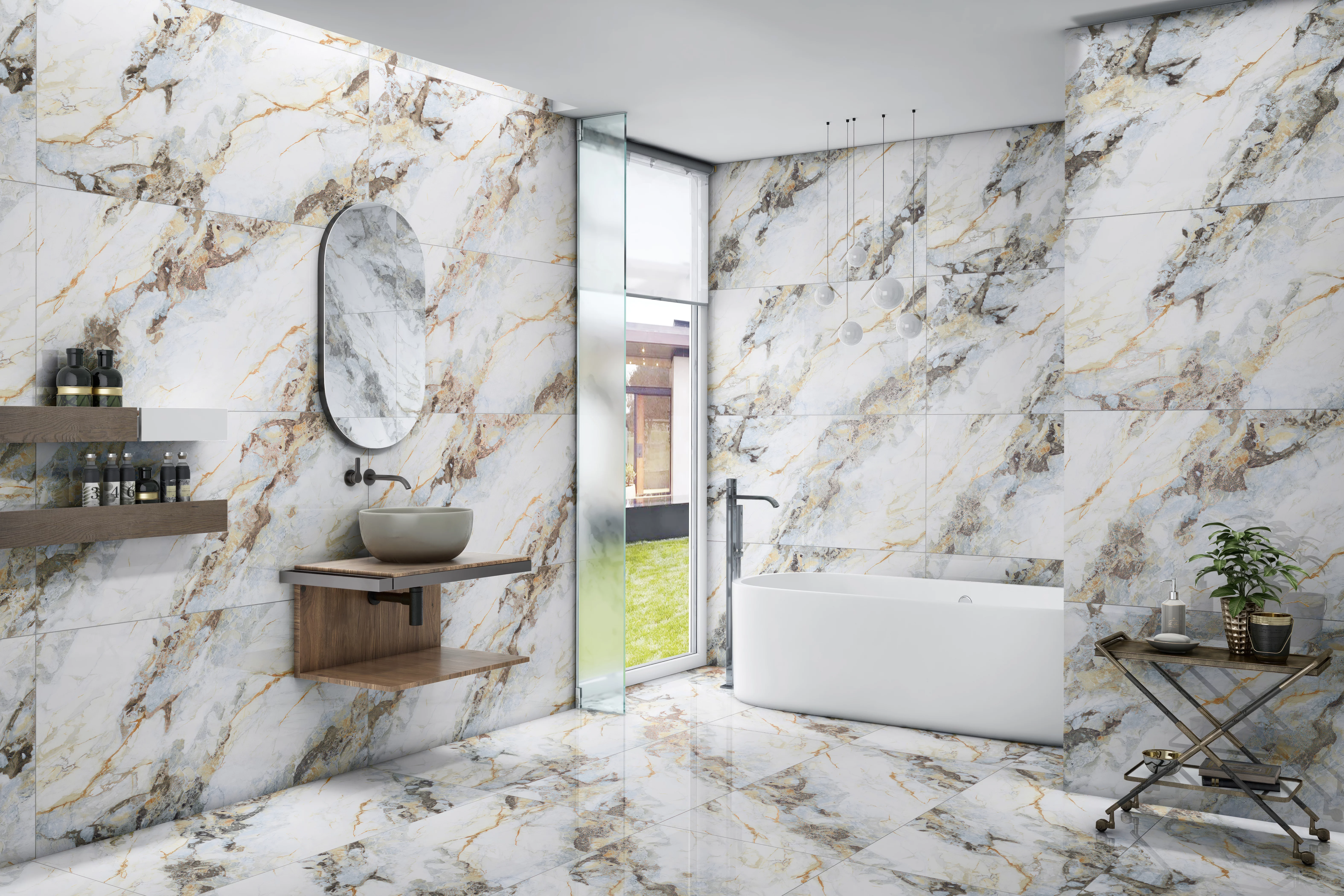 RECTIFICATA, PORTELANATA, GLAZURATA, INTERIOR/EXTERIOR, LUCIOASA CU EFECT GOLD CARVING, ALB CU GRI SI MARO CU INSERTII AURII RANDOM 3, PEI IV, RATA DE ABSORBTIE A APEI SUB 0.5%, COMPATIBILA CU SISTEME DE INCALZIRE IN PARDOSEALA