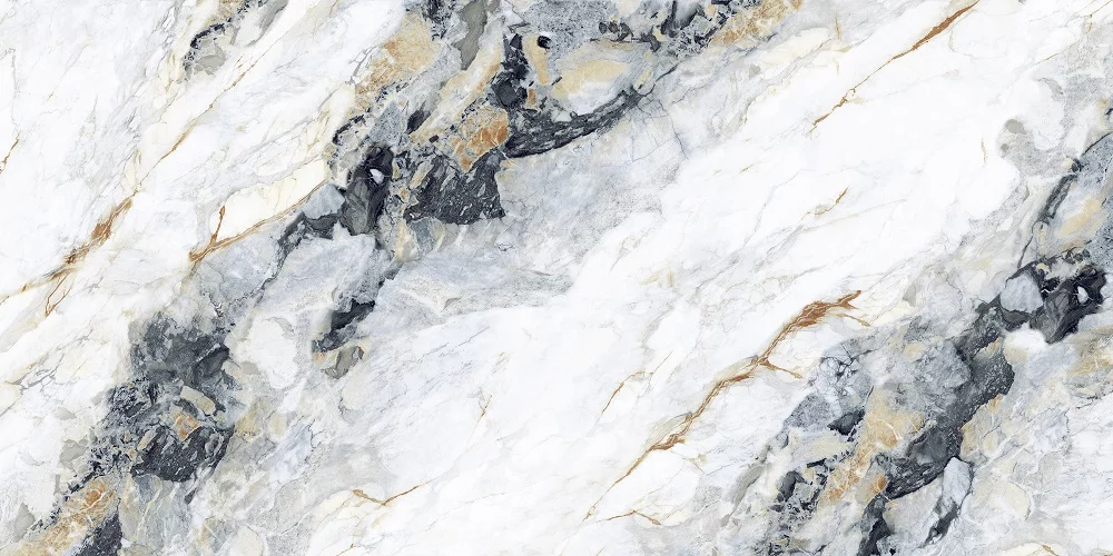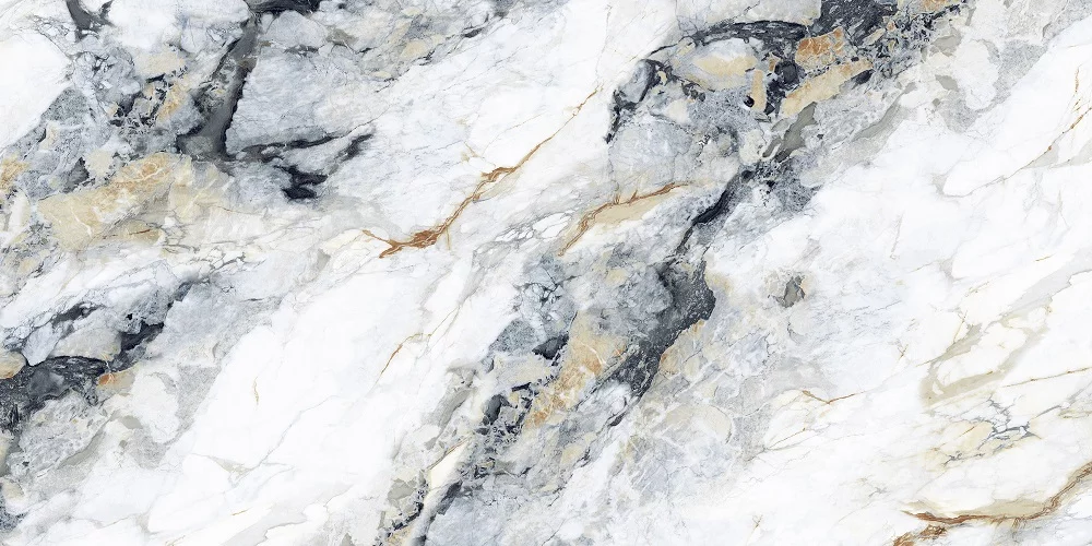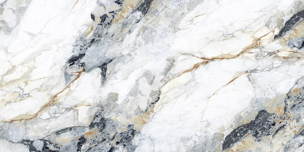 GRESIE GOLDEN GOYA 1017 - 60X120 cm, porțelanată, lucioasă, cu efect gold carving, în tonuri de alb, gri și maro cu inserții aurii, ideală pentru interioare și exterioare elegante.