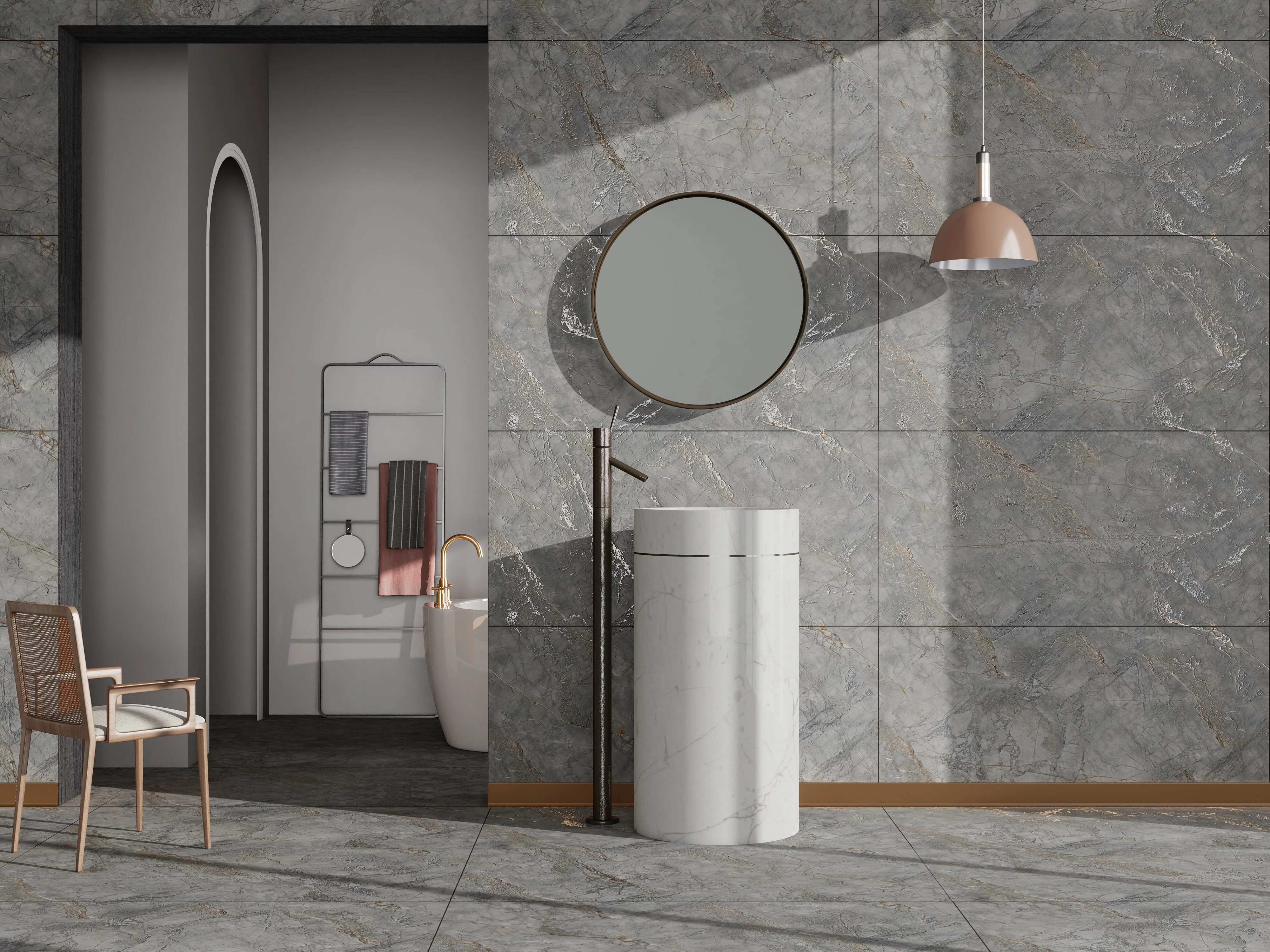Textura sa inspirată din piatră naturală, cu nuanțe de gri și vene maronii subtile, creează un aspect sofisticat și contemporan.