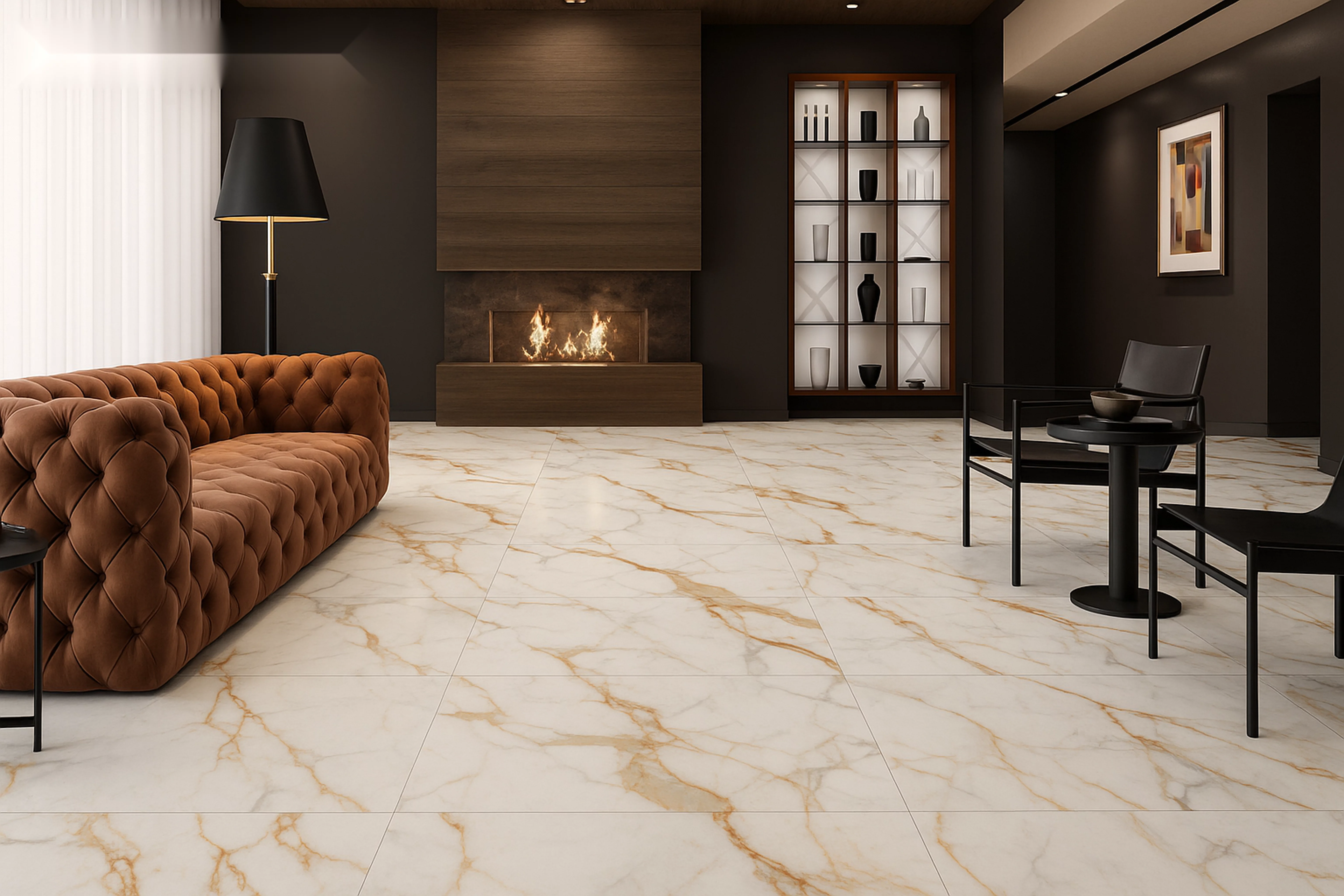 Gresia CARRARA BROWN inspirată de frumusețea atemporală a marmurei naturale, oferă o combinație rafinată de alb pur și vene calde aurii și maronii.