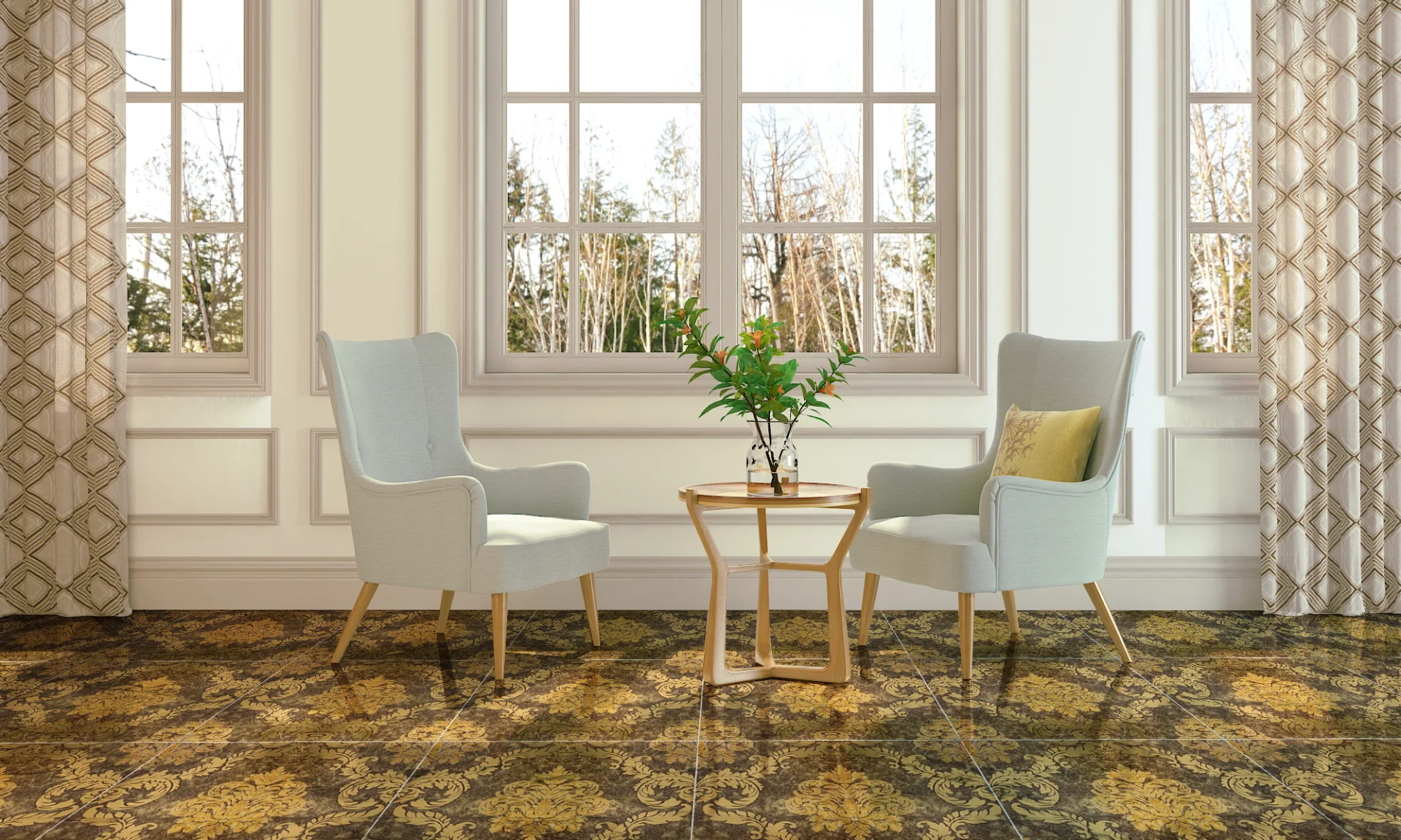 Gresia T60225G-M impresionează prin aspectul său opulent și sofisticat, având un fundal maro cu textură marmurată și ornamente aurii de inspirație barocă.