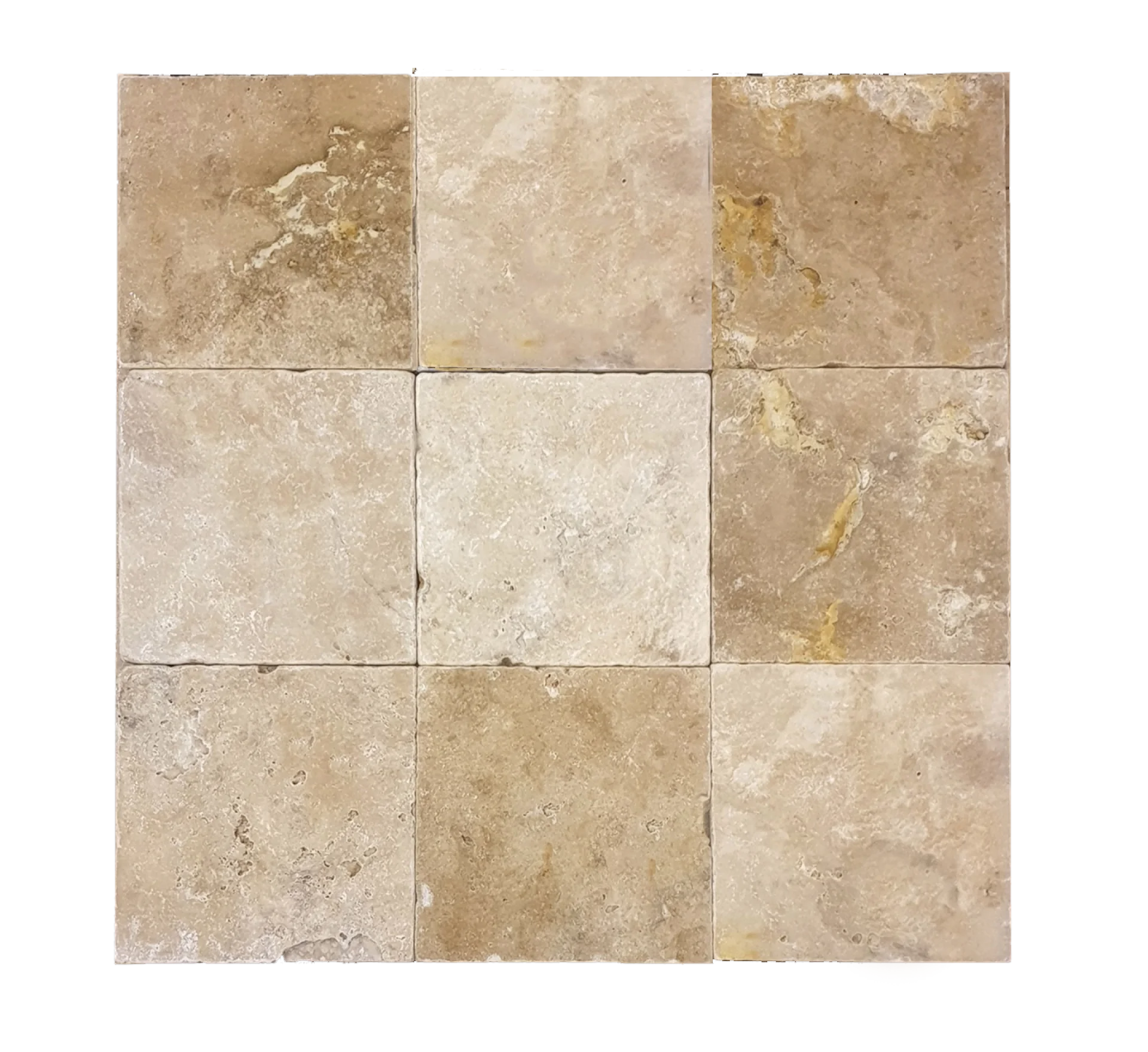 TRAVERTIN CLASSIC - 20.3X20.3X1 cm, cu finisaj antichizat (tumbled) și suprafață nechituită, ideal pentru proiecte cu aspect rustic și natural.