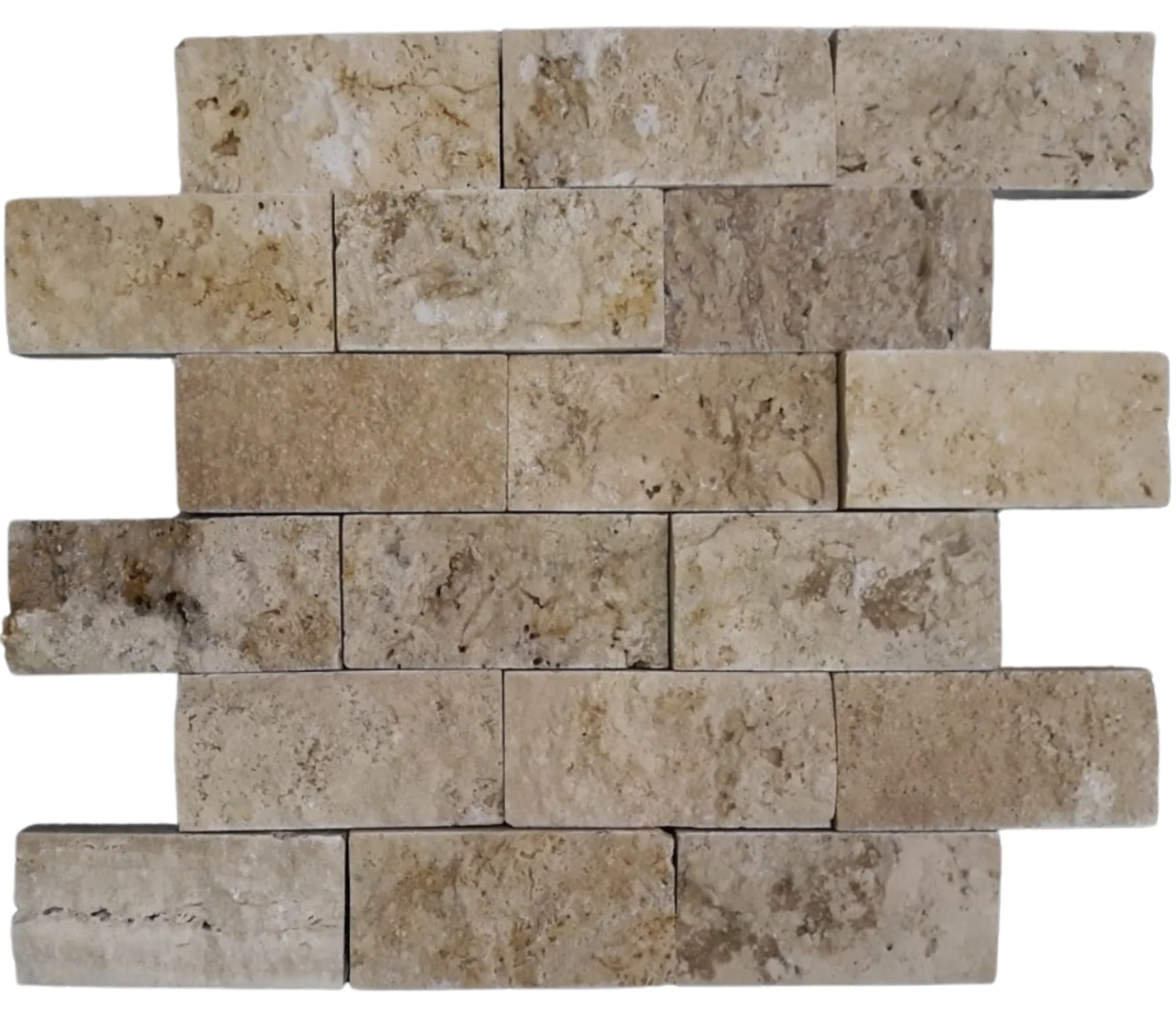 MOZAIC DIN TRAVERTIN RUSTIC PE PLASA SPLIT FACE FORMAT DIN BUCATI DE 5X10, GROSIME 1.5-1.8 CM, PENTRU PLACARE PERETI INTERIOR/EXTERIOR