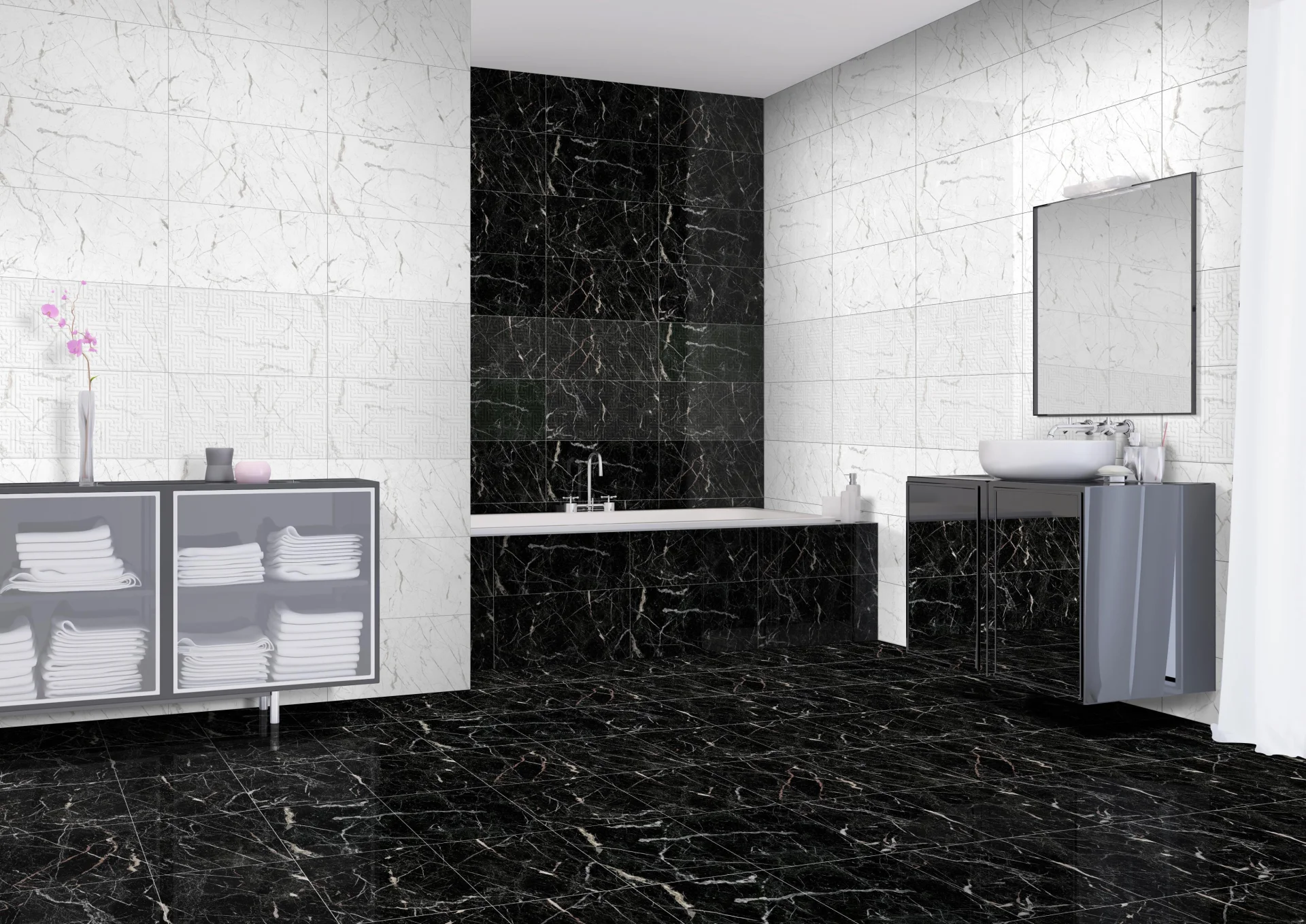 Faianta ITALIANO BLACK aduce rafinamentul marmurei negre în amenajările interioare contemporane.