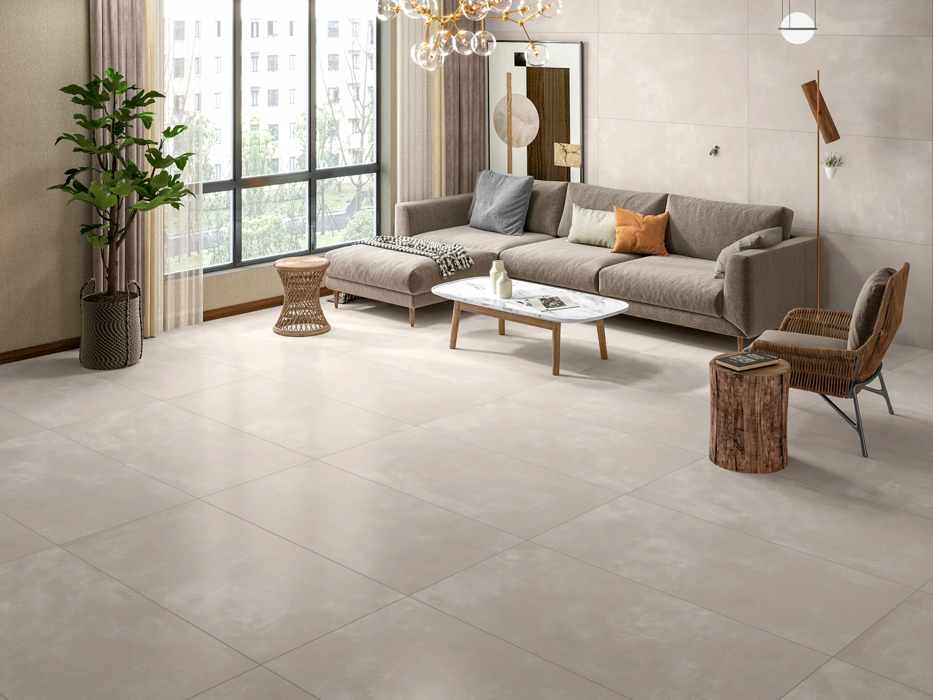 Formatul mare și rectificat accentuează senzația de spațiu, iar rezistența crescută la uzură o face potrivită pentru zone cu trafic intens.