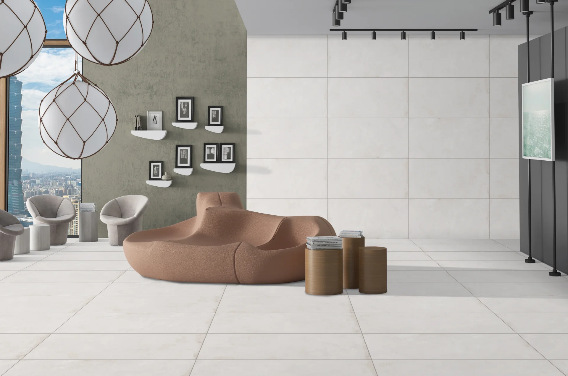 Placa porțelanată rectificată permite un montaj cu rosturi fine, oferind un aspect continuu și modern.
