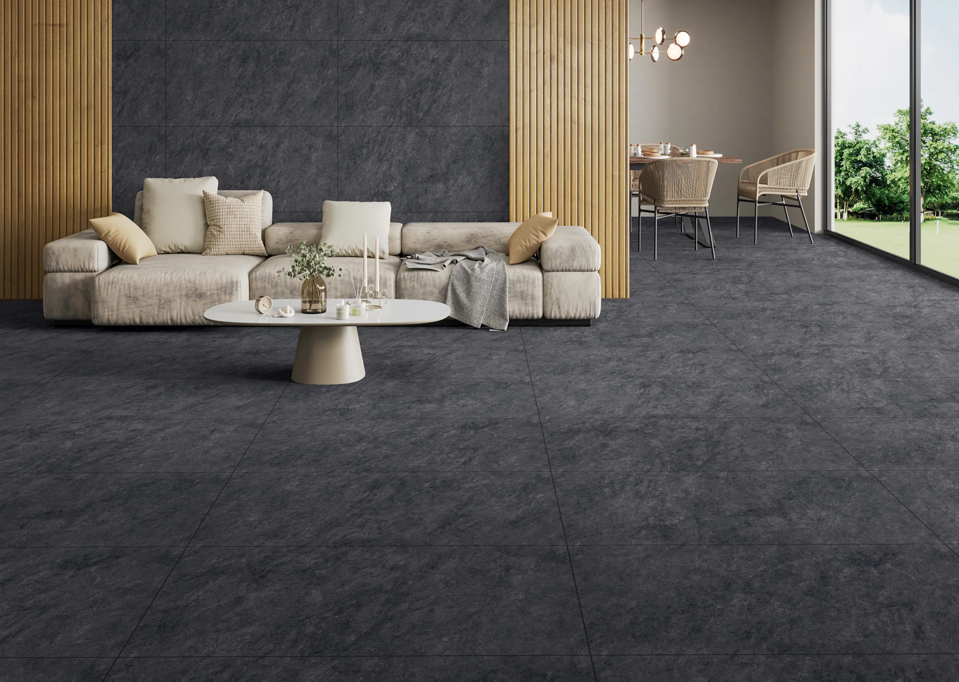 Culoarea negru intens, cu aspect mat și subtil texturat, evocă eleganța industrială și sobrietatea contemporană.