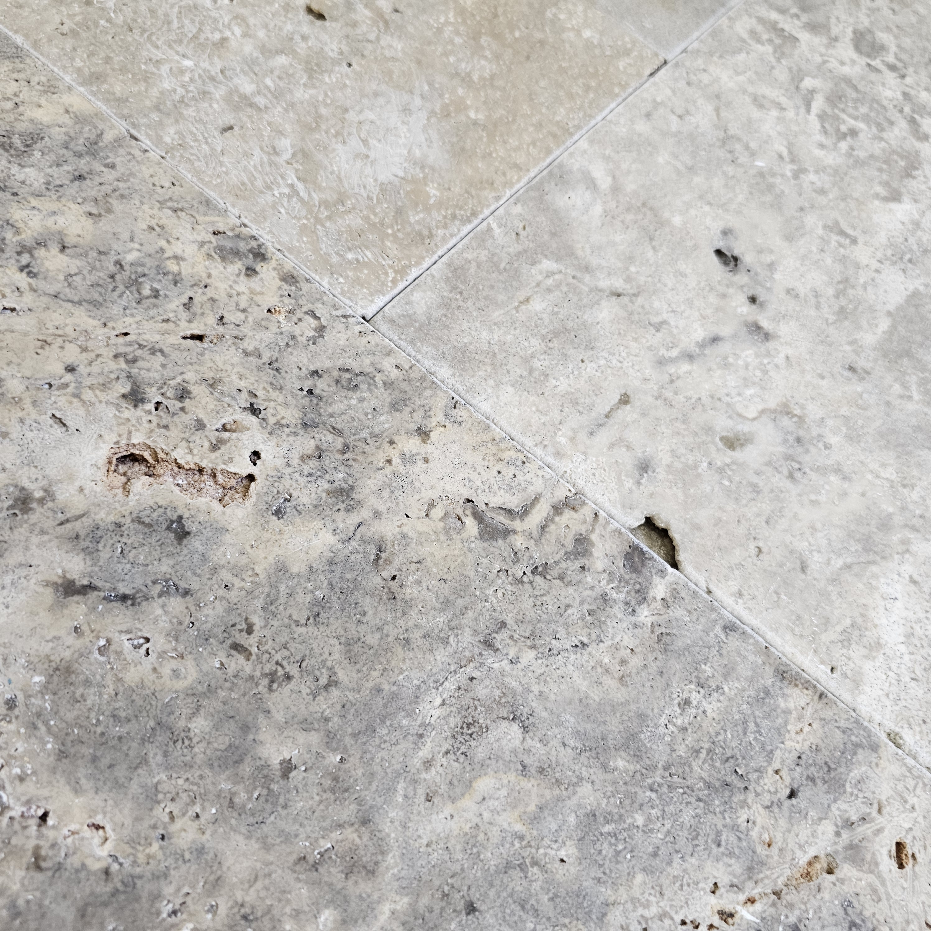 TRAVERTIN SILVER TUMBLED FP SET - 1.2 cm, set French Pattern grosime 1.2 cm, format din placi de diferite dimensiuni, finisaj antichizat Tumbled, in nuante de gri inchis si deschis cu diverse variatii naturale, potrivit pentru pardoseli sau pereți, interior și exterior.
