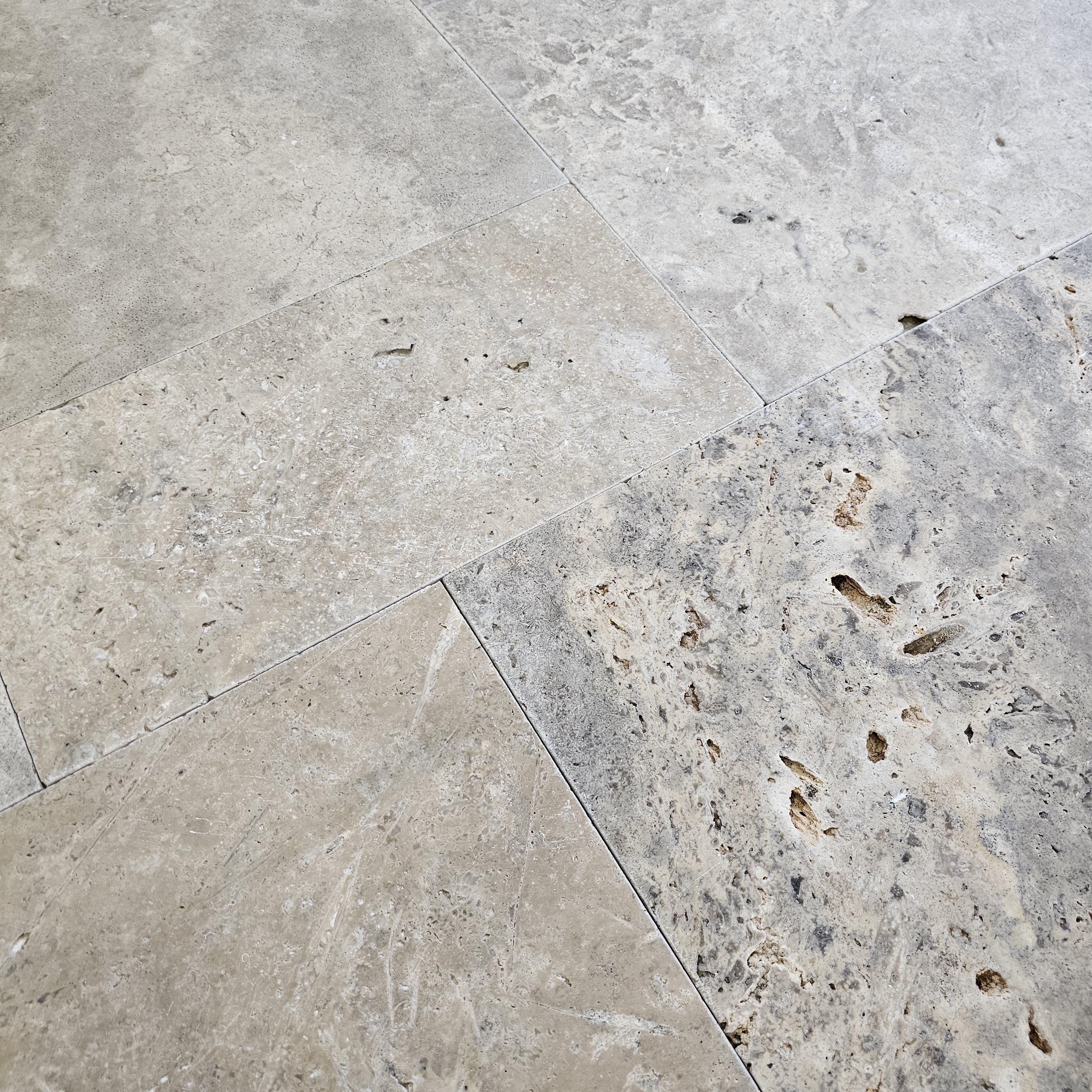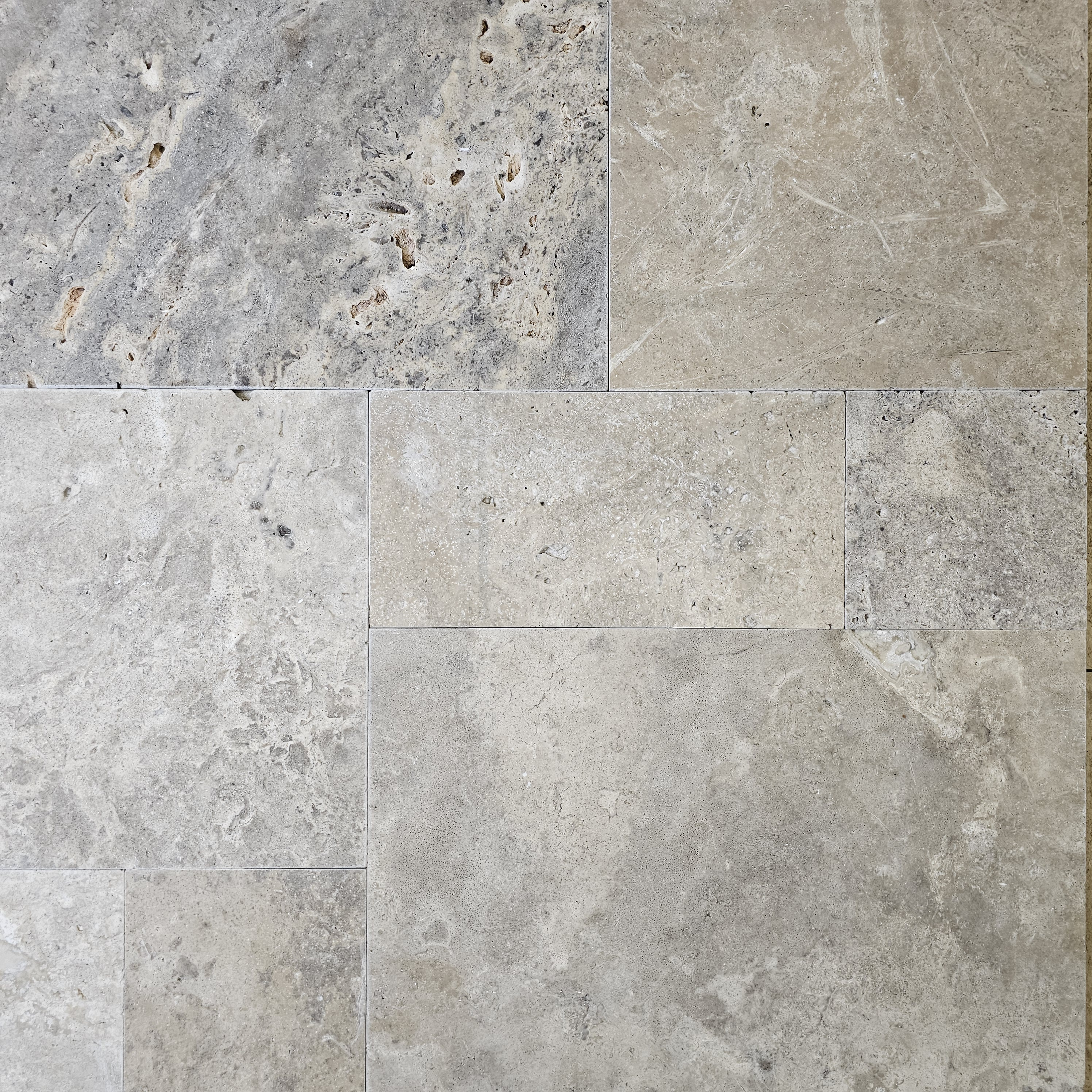 Piatra Naturala, Travertin Silver Tumbled, nechituit, 1.2 cm grosime FRENCH PATTERN 6 PCS / SET - 1PL 40.6X61, 2PL 40.6X40.6, 1PL 20.3X40.6, 2PL 20.3X20.3